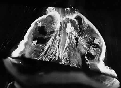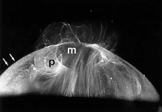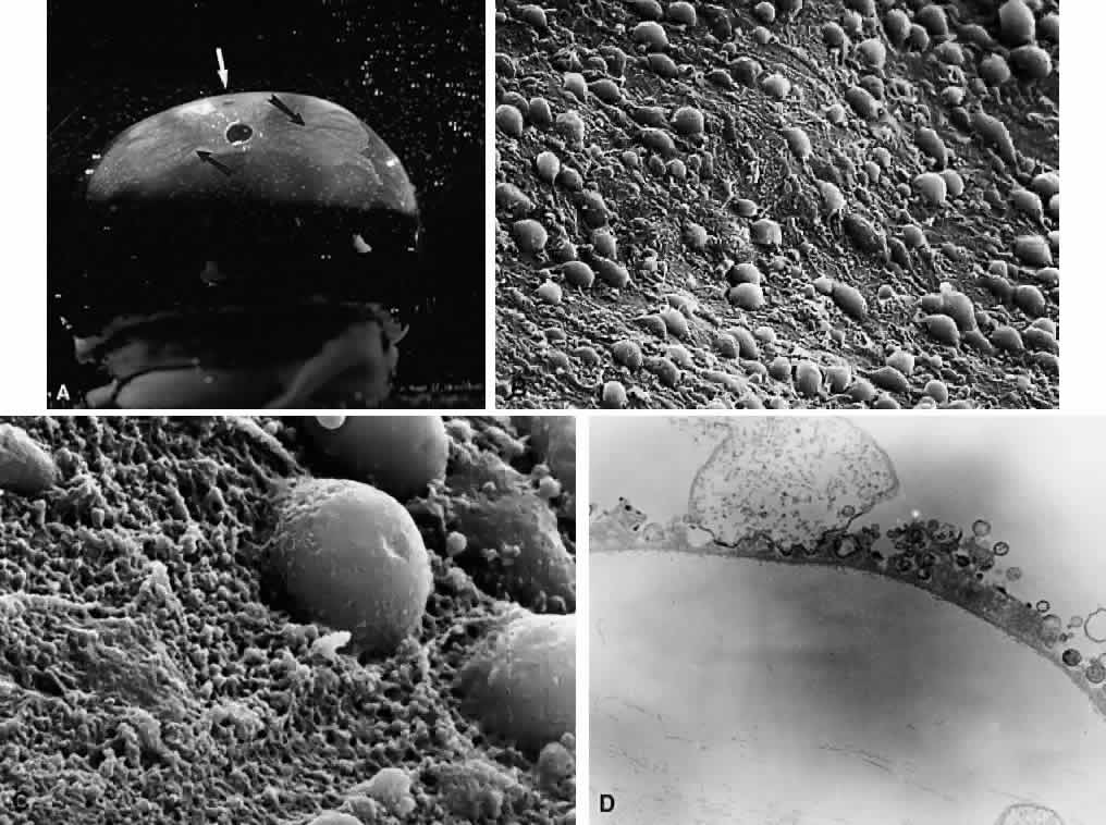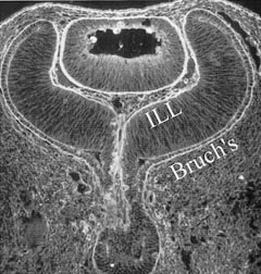 EMBRYOLOGY Interfaces During invagination of the optic vesicle, the basal lamina of the surface ectoderm enters the invagination along with the ectodermal cells that have become specialized neural ectoderm.113The ectodermal cells that are on the surface of the inner with the outer basal lamina give rise to retinal pigment epithelium attached to Bruch's membrane, while the invaginating neural ectoderm and its basal lamina give rise to the neural retinal cells adherent to the internal limiting lamina (ILL). Thus, the basal laminae of both the retina and RPE have the same embryologic origin. Figure 5 demonstrates the continuity of these two basal laminae. It is important to appreciate that these basal laminae serve as interfaces between adjacent ocular structures. In the case of the ILL, this basal lamina is the interface between the retina and vitreous. Bruch's membrane separates the RPE and retina from the choroid (neural crest origin). These interfaces play an important role in a significant biologic event that underlies one of the most devastating causes of blindness in humans: neovascularization. At the ILL interface between vitreous and retina, neovascularization in advanced diabetic retinopathy and other ischemic retinopathies, including retinopathy of prematurity (see below), is a significant cause of vision loss. At the level of Bruch's membrane, an interface of identical embryologic origin as the ILL, neovascularization in age-related macular degeneration is a significant and growing problem. Both of these conditions result from vascular endothelial cell migration and proliferation onto and into interfaces of the same embryologic origin: the basal lamina of the surface ectoderm. Improving our understanding of endothelial cell interaction with these interfaces should provide new insights into therapy and prevention of these important disorders. Vitreous Body Early in embryogenesis, the vitreous body is filled with blood vessels known as the vasa hyaloidea propia. This network of vessels arises from the hyaloid artery, which is directly connected to the central retinal artery at the optic disc. The vessels branch many times within the vitreous body and anastomose anteriorly with a network of vessels surrounding the lens, the tunica vasculosa lentis. This embryonic vascular system attains its maximum prominence during the ninth week of gestation or 40-mm stage.114 Atrophy of the vessels begins posteriorly with dropout of the vasa hyaloidea propria, followed by the tunica vasculosa lentis. At the 240-mm stage (seventh month) in the human, blood flow in the hyaloid artery ceases.115 Regression of the vessel itself begins with glycogen and lipid deposition in the endothelial cells and pericytes of the hyaloid vessels.115 Endothelial cell processes then fill the lumen and macrophages form a plug that occludes the vessel. The cells in the vessel wall then undergo necrosis and are phagocytized by mononuclear phagocytes.116 Gloor117 claims that macrophages are not involved in vessel regression within the embryonic vitreous but that autolytic vacuoles form in the cells of the vessel walls, perhaps in response to hyperoxia. Interestingly, the sequence of cell disappearance from the primary vitreous begins with endothelial and smooth muscle cells of the vessel walls, followed by adventitial fibroblasts and lastly phagocytes,118 consistent with a gradient of decreasing oxygen tension. It is not known precisely what stimulates regression of the hyaloid vascular system, but studies have identified a protein native to the vitreous that inhibits angiogenesis in various experimental models.119–121 Teleologically, such activity seems necessary if a transparent tissue is to inhibit cell migration and proliferation and minimize light scattering to maintain transparency. This may also be the mechanism that induces regression of the vasa hyaloidea propia. Thus, activation of this protein and its effect on the primary vitreous may be responsible for the regression of the embryonic hyaloid vascular system as well as the inhibition of pathologic neovascularization in the adult. Hyaloid vessel regression may also result from a shift in the balance between growth factors promoting new vessels, such as vascular endothelial growth factor (VEGF)-A, and those inducing regression, such as placental growth factor.122 Recent studies123,124have suggested that vasa hyaoidea propria and the tunica vasculosa lentis regress via apoptosis. Mitchell and colleagues123 pointed out that the first event in hyaloid vasculature regression is endothelial cell apoptosis and propose that lens development separates the fetal vasculature from VEGF-producing cells, decreasing the levels of this survival factor for vascular endothelium, inducing apoptosis. After endothelial cell apoptosis, there is loss of capillary integrity, leakage of erythrocytes into the vitreous, and phagocytosis of apoptotic endothelium by macrophages, which were felt to be important in this process. Subsequent studies by a different group125 confirmed the importance of macrophages in promoting regression of the fetal vitreous vasculature and further characterized these macrophages as hyalocytes. Meeson and colleagues126 proposed that there are actually two forms of apoptosis that are important in regression of the fetal vitreous vasculature. The first (initiating apoptosis) results from macrophage induction of apoptosis in a single endothelial cell of an otherwise healthy capillary segment with normal blood flow. The isolated dying endothelial cells project into the capillary lumen and interfere with blood flow. This stimulates synchronous apoptosis of downstream endothelial cells (secondary apoptosis) and ultimately obliteration of the vasculature. Removal of the apoptotic vessels is achieved by hyalocytes. A better understanding of this phenomenon may provide insights into new ways to induce the regression of pathologic angiogenesis or inhibit neovasculariz