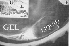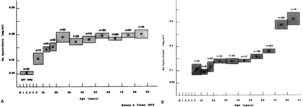 vitreous degeneration (ARVD). RHEOLOGIC CHANGES Rheology is a term that refers to the gel–liquid state of the vitreous. After the age of 45 to 50 years, there is a significant decrease in the gel volume and an increase in the liquid volume of human vitreous. Postmortem studies of dissected vitreous qualitatively confirmed these findings and determined that liquefaction begins in the central vitreous.5,12 This finding supports the observation that the central vitreous is where fibers first appear (Fig. 12) and is consistent with the concept that breakdown of the normal collagen-HA association results in the simultaneous formation of liquid vitreous and aggregation of collagen fibrils into bundles of parallel fibrils seen as large fibers.7,8,12 In the posterior vitreous, pockets of liquid vitreous are formed, recognized clinically as lacunae (Fig. 22). When a single large pocket forms, the terms bursa or precortical pocket are used.6,9 As previously mentioned, the large lacuna is a manifestation of age-related liquefaction, or synchisis, and does not represent an anatomic entity.10,11 Flood and Balazs154 found evidence of liquid vitreous after the age of 4 years and observed that by the time the human eye reaches adult size (age 14 to 18 years), 20% of the total vitreous volume consists of liquid vitreous (Fig. 23). In these postmortem studies of fresh unfixed human eyes, it was noted that after the age of 40 years, there is a steady increase in liquid vitreous. This occurs simultaneously with a decrease in gel volume. By the ages of 80 to 90 years, more than half of the vitreous is liquid. Vitreous liquefaction does not occur in most mammals154 and only a few species develop fibers.118 Studies154 have demonstrated that in rhesus monkeys, however, an age-related process of liquefaction occurs that is similar to that in humans. In the owl monkey, there is a gel-to-liquid transformation that occurs by the age of 2 years (human age, 8 to 10 years). In the baby owl monkey, the vitreous has a gel structure and contains a network of collagen fibrils, whereas in the adult there is disappearance of collagen and a simultaneous transformation from a gel state to a viscous fluid that contains mostly high molecular weight HA.154 The mechanism of vitreous liquefaction is poorly understood. Gel vitreous can be liquefied in vitro by removing collagen via filtration,155 centrifugation,156 or by enzymatic destruction of the collagen network.157 The importance of collagen in the maintenance of the gel state of vitreous can be deduced from the biochemical findings in the owl monkey, wherein the gel state is lost simultaneous to replacement of vitreous collagen by HA.112 Studies using nuclear magnetic resonance (NMR) spectroscopy in experiments performed with bovine vitreous found that collagenase induced a decrease in macroscopic viscosity and a shortening of longitudinal and transverse relaxation times.158 The decrease in viscosity was proportional to the shortening of relaxation times for collagenase-treated eyes—more than for hyaluronidase-treated eyes. This suggests that the transition from gel to liquid vitreous is in some way related to disappearance or displacement of collagen from the collagen-HA double network, resulting in a decrease in viscosity and liquefaction, as detected by NMR spectroscopy. These findings are consistent with the hypotheses invoking collagen dissociation from HA with aggregation of collagen fibrils into bundles and pooling of HA and water into lacunae as a way to explain the observed structural changes noted during aging. Primary changes in the conformation of HA molecules with secondary cross-linking of collagen molecules and aggregation of fibrils into bundles is another possible mechanism of endogenous vitreous liquefaction. Chakrabarti and Park53 claimed that the interaction between collagen and HA depends on the conformation of each macromolecule and that a change in the conformation of HA molecules may result in alterations in collagen and pooling of HA, drawing water along and resulting in vitreous liquefaction. Armand and Chakrabarti159 detected differences in the structure of the HA molecules present in gel vitreous when compared with liquid vitreous, suggesting that conformational changes occurred during aging, resulting in liquefaction. Andley and Chapman160 have demonstrated that singlet oxygen can induce conformational changes in the tertiary structure of HA molecules. Ueno and associates82 have suggested that free radicals generated by metabolic and photosensitized light-tissue interactions may alter HA or collagen structure and trigger a dissociation of collagen and HA molecules, ultimately leading to liquefaction. This is plausible because the cumulative effects of a lifetime of daily exposure to light could indeed influence the structures and interaction of vitreous collagen and HA by the proposed free radical mechanism. In recognition of the important role of HA in maintaining vitreous structure, investigators attempting to induce liquefaction have used exogenous hyaluronidase injection in a rabbit model.161 However in humans, studies attempting to clear vitreous hemorrhage have had disappointing results with exogenous hyaluronidase injection because a phase III FDA trial recently failed to show efficacy. Vitreous liquefaction may also be the result of changes in the minor GAGs and chondroitin sulfate profile of vitreous.162 In these studies on rabbit vitreous, liquefaction was associated with the disappearance of lower-charged chondroitin sulfate and the appearance of a higher-charged chondroitin sulfate. Such observations have led to attempts to alter vitreous rheology and structure by injecting chondroitinase ABC to purportedly break down chondroitin sulfate and induce liquefaction and disinsertion of the vitreous body.163 These findings have led to the study of chondroitinase as an adjunct to vitreous surgery, intended to facilitate removal of vitreou