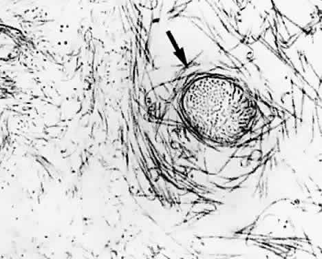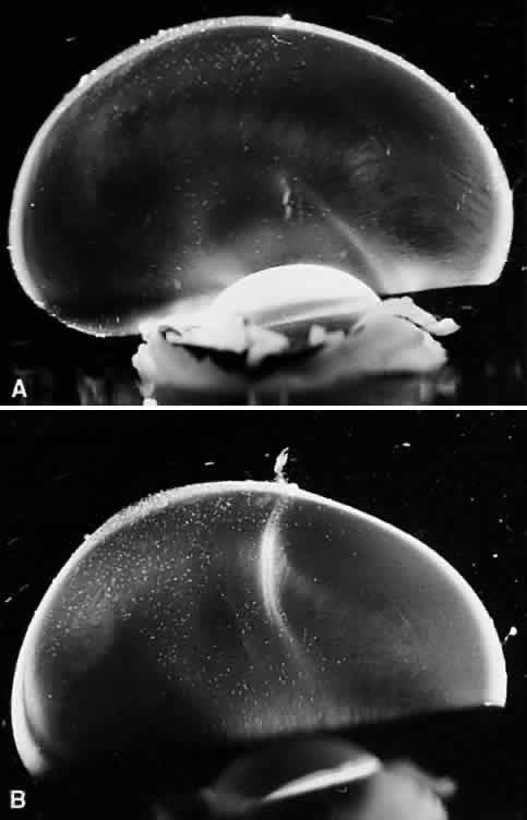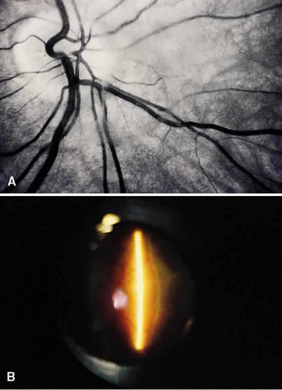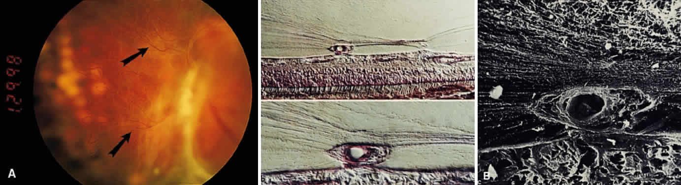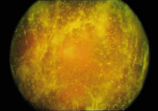 Retinal Effects Effects upon the retina vary, depending on the site affected. These include hemorrhage, retinal tears and detachment, and vitreomacular traction syndromes, including macular holes and some cases of diabetic macular edema. Proliferative diabetic retinopathy (PDR) can be aggravated by anomalous PVD. Lindner171 found that vitreous hemorrhage occurred in 13% to 19% of patients with PVD. Because vitreous hemorrhage results from considerable vitreoretinal traction, this finding in a patient with PVD is generally considered to be an important risk factor for the presence of a retinal tear and detachment. One 15-year study in Belgium190 found that in 126 cases of nondiabetic, nontraumatic vitreous hemorrhage that did not clear for 6 months, 25% were found to have retinal tears, and 8% had retinal detachments. Another study191 found that in 36 eyes with fundus-obscuring vitreous hemorrhage, 24 of 36 eyes (67%) were found to have at least one retinal break, with 88% of breaks located in the superior retina. Eleven eyes (31%) had more than one retinal break. Fourteen of 36 eyes (39%) had a rhegmatogenous retinal detachment. Retinal tears not involving blood vessels result from traction on other foci of usual vitreoretinal adhesion, such as the posterior border of the vitreous base. Abnormal foci of firm vitreoretinal adhesion, such as lattice degeneration and rosettes, are also frequently associated with retinal tears after PVD. Indeed, Byer192 has claimed that as many as 25% of the general population have some form of abnormal focal vitreoretinal adhesion, placing them at considerable risk from anomalous PVD. Vitreous Effects Effects upon vitreous primarily involve posterior vitreoschisis193 (Fig. 26). This condition results from splitting of the posterior vitreous cortex, with forward displacement of the anterior portion of the posterior vitreous cortex leaving part, or all, of the posterior layer of the split vitreous cortex still attached to the retina.194 Vitreoschisis has been detected in cases of proliferative diabetic vitreoretinopathy195 and likely has a role in the pathophysiology and sequelae of this condition. Premacular membranes with macular pucker and cases of macular holes may also result from persistent attachment of part or all of the posterior vitreous cortex to the macula while the remainder of the vitreous detaches forward. In the former case, tractional forces are centripetal (inward toward the fovea) causing macular pucker. In the latter condition tangential traction occurs in a centrifugal (outward from the fovea) direction, causing a macular hole. VITREOUS OPACIFICATION (NON-HEMORRHAGIC) Asteroid Hyalosis This benign condition is characterized by small white or yellowish white spherical or disc-shaped opacities throughout the vitreous (Fig. 27). Asteroid bodies are so intimately enmeshed within vitreous gel that they move in a manner typical of vitreous displacement during ocular saccades. This observation led Rodman and co-workers196 to suggest that there was a relation to vitreous fibril degeneration. PVD, however, occurs less frequently in asteroid hyalosis than in age-matched controls, so this observation does not support age-related degeneration as a cause.197 The Beaver Dam eye study of 4,747 subjects found that asteroid hyalosis was present in 1.2%.198 In subjects in whom it was present, asteroid hyalosis was bilateral in 9%. The prevalence increased significantly (p < 0.001) with age from 0.2% in subjects 43 to 54 years to 2.9% in subjects 75 to 86 years. There was no association with diabetes. This was confirmed in the Blue Mountains Eye Study of 3,654 subjects in Australia199 where a prevalence of 1% was identified, bilateral occurrence was found in 8.3%, and no association with diabetes could be identified. Asteroid hyalosis can be associated with certain pigmentary retinal degenerations.200 Histologic studies detected a crystalline appearance to asteroid bodies that stained positive to fat and acid mucopolysaccharide stains and was unaffected by pretreatment with hyaluronidase.201 Ultrastructural studies found intertwined ribbons of multilaminar membranes with a 6-nm periodicity that was interpreted as characteristic of complex lipids, especially phospholipids, lying in a homogeneous background matrix.202 In these investigations, energy-dispersing radiographic analysis showed calcium and phosphorus to be the main elements in asteroid bodies. Electron diffraction structural analysis demonstrated calcium hydroxyapatite and possibly other forms of calcium phosphate crystals. Yu and Blumenthal203 proposed that asteroid hyalosis results from aging collagen, with sulfated GAGs acting as chelators in the binding of calcium to free polar groups on vitreous collagen fibrils. Experimental studies in the rabbit, however, suggested that asteroid formation is preceded by depolymerization of HA.204 More recent studies205 used electron energy loss spectroscopy and energy-filtered transmission electron microscopy for the elemental analysis of asteroid bodies. The ultrastructural localization of glycosaminoglycans was investigated using lectin and antibody conjugates in conjunction with transmission electron microscopy and epifluorescence microscopy. Anionic sites of glycosaminoglycans were detected with 15 nm of cationic colloidal gold at low pH, applied as a postembedding technique. Ultrastructural details of asteroid bodies were documented using fast Fourier transform analysis of zero-loss filtered images. The results suggested that it was more specifically the GAG side chains of vitreous proteoglycans that were important in regulating this biomineralization process. The mineralization was confirmed by chemical analysis of samples removed at surgery performed with an energy-dispersive x-ray microanalyzer studies206. The observed changes resembled stones in the living body (lithiasis), leading the investigators to conclude that asteroid hyalosis is a condition 