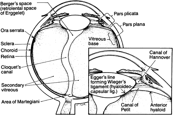 Anomalous Vitreous Development Proper vitreous biosynthesis during embryogenesis depends on normal retinal development because at least some of the structural components in vitreous are synthesized by retinal Müller cells.145 A clear gel, typical of normal secondary vitreous, appears only over normally developed retina. Thus, in developmental anomalies such as retinopathy of prematurity and familial exudative vitreoretinopathy, the vitreous overlying undeveloped retina in the peripheral fundus is a viscous liquid and not a gel. How far this finding extends posteriorly in retinopathy of prematurity depends upon the gestational age at birth. Because the retina develops anteriorly from the optic disc, the more immature the individual, the less developed the retina in the periphery, especially temporally, and the more vitreous structure is liquid and not gel. Inborn errors of type II collagen metabolism, such as in the arthro-ophthalmopathies, often feature very liquefied vitreous early in life and these individuals are at high risk of rhegmatogenous retinal detachment. It is also possible that the liquid vitreous observed in myopia is similarly caused by myopia-related abnormalities in the retina with secondary effects on the formation of gel vitreous. ADULT VITREOUS STRUCTURE Vitreous Body In an emmetropic adult human eye, the vitreous body is about 16.5 mm in axial length, with a depression anteriorly just behind the lens known as the patellar fossa (Figs. 10 and 12G). The hyaloideocapsular ligament of Weiger is the annular region of vitreolenticular attachment that is 1 to 2 mm in width and 8 to 9 mm in diameter. Erggelet's or Berger's space is at the center of the hyaloideocapsular ligament. Arising from this space and coursing posteriorly through the central vitreous is the canal of Cloquet (see Figs. 9B, 10, and 12G), the former site of the hyaloid artery in the embryonic vitreous. What was previously the lumen of this artery is an area devoid of collagen fibrils, surrounded by multifenestrated sheaths that were previously the basal laminae of the hyaloid artery wall. Posteriorly, Cloquet's canal opens into a funnel-shaped region anterior to the optic disc known as the area of martegiani. A remnant of incomplete atrophy of the hyaloid artery may persist in this location and is called Bergmeister's papilla. Within the adult human vitreous, there are fine parallel fibers coursing in an anteroposterior direction that are continuous and do not branch (Fig. 12B and 12C). The fibers arise from the vitreous base (see Fig. 12H), where they insert anterior and posterior to the ora serrata. Although there are various concepts of how the peripheral anterior vitreous fibers connect with the retina and pars plana,3,12 all espouse the precept that retinal tears result from vitreous traction on foci of strong adhesion at the vitreoretinal interface in these locations.146 The fibers in the anterior vitreous base (Fig. 13) probably also have an important role in the pathogenesis of anterior proliferative vitreoretinopathy (PVR); not only in being the substrate on which fibronectin and laminin are deposited to facilitate cells to migrate, proliferate, and form PVR membranes but also in transmitting the traction induced by these membranes to the peripheral retina (producing retinal detachment; RD), to the ciliary body (causing detachment and hypotony), and even to the iris (resulting in the retraction commonly seen in PVR). Fibers near the vitreous cortex course posteriorly in a plane circumferential to the vitreous cortex, whereas central fibers undulate in a configuration that parallels the course of Cloquet's canal. Ultrastructural studies have demonstrated that these fibers are composed of collagen fibrils organized into packed bundles of parallel fibrils (Fig. 14).8 The aggregation of collagen fibrils into visible fibers (Figs. 12 and 13) occurs when HA molecules no longer separate the collagen fibrils because of disease, such as the arthroophthalmopathies or diabetes, or aging. The areas adjacent to these large fibers have a low density of collagen and a relatively high concentration of HA and water. Comprised primarily of liquid vitreous, these areas scatter relatively little incident light. Vitreoretinal Interface The periphery of the vitreous body, known as the vitreous cortex, courses anteriorly and posteriorly from the vitreous base. The portion that courses forward and inward from the vitreous base is called the anterior vitreous cortex. The portion coursing posteriorly from the posterior border of the vitreous base is known as the posterior vitreous cortex. The posterior vitreous cortex is 100 to 110 μm thick and consists of densely packed type II collagen fibrils (Fig. 15) and other extracellular matrix components. Contrary to previous beliefs, there are no direct connections between the posterior vitreous cortex and the retina, yet the posterior vitreous cortex is adherent to the internal limiting lamina (ILL) of the retina, especially in youth (Fig. 16). The exact nature of the adhesion between the posterior vitreous cortex and the ILL is not known but most probably results from the action of the various extracellular matrix molecules found at this interface.147,148 When the posterior vitreous is detached from the retina, a hole in the prepapillary vitreous cortex can often be seen (Fig. 17A). If peripapillary glial tissue is torn away during PVD and remains attached to the vitreous cortex surrounding the prepapillary hole, it is referred to as Vogt's or Weiss's ring. Vitreous can extrude through the prepapillary hole in the vitreous cortex (see Fig. 12A) but does so to a lesser extent than through the premacular vitreous cortex (see Fig. 12B and D). Various vitreomaculopathies can result from anteroposterior traction.148,149 Other mechanisms, particularly tangential vitreomacular traction,149,150 have been implicated in the pathogenesis of macular holes. HYALOCYTES. There are cells em
