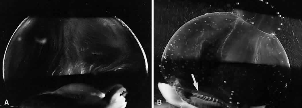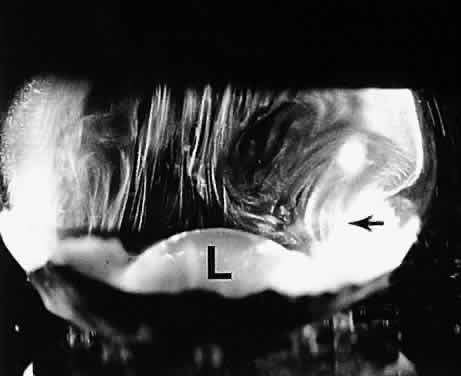 There may be considerable effects of diabetes on vitreous GAGs as well, not only in terms of nonenzymatic glycation effects on the protein core of the proteoglycans, but also on the GAGs themselves. Studies have shown that the presence of AGEs, promotes a decrease in the molecular weight of HA when exposed to light.183 The investigators proposed that the photosensitizer property of AGEs may be associated with accelerated depolymerization of HA in diabetic patients, contributing to diabetic vitreopathy.57 Shifts in systemic osmolarity and hydration that occur as a result of poor glycemic control can alter the ionic milieu in and around the vitreous body, extending or contracting vitreous HA, and in turn the vitreous body. This can transmit traction to structures attached to the posterior vitreous cortex, such as new blood vessels that have grown out of the optic disc or retina (Fig. 25).184 These events may influence the course of diabetic retinopathy by stimulating further proliferation of neovascular fronds and perhaps even by inducing rupture of these new vessels, resulting in vitreous hemorrhage. Tasman185 found that in 53 cases of vitreous hemorrhage caused by proliferative diabetic retinopathy, 62.3% of bleeding episodes occurred between midnight and 6 A.M., whereas the remaining parts of the day had only an 11% to 13% incidence. Although Tasman speculated that this may be the result of nocturnal hypoglycemia, sleep apnea is perhaps a more plausible mechanism.