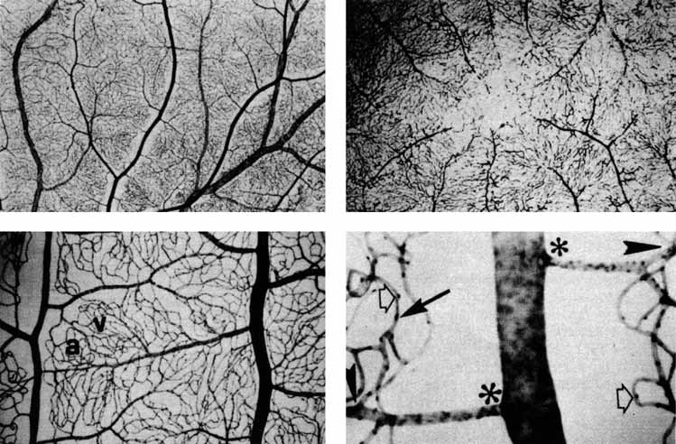 The retina is unique in having the highest oxygen consumption per unit weight of any tissue in the human body and in having two separate circulatory systems to meet this metabolic demand. Although its outer third is nourished by the choroidal circulation, its inner two thirds receives nutrition from the retinal circulation (Fig. 44).221 These two systems have distinctly different anatomic and physiologic attributes. The choroidal circulation is a high-flow and variable-rate circulation with free transfer of metabolites of all sizes between it and the surrounding tissues, and the retinal circulation is a lower but more constant flow system with a higher rate of oxygen extraction.222 The embryonic development of the retinal vasculature explains the final configuration of its circulation. The retina remains avascular until the fourth month of fetal development, because the hyaloid artery, which is the only intraocular blood vessel during early embryogenesis, gives off no retinal branches. At the 4-month stage, spindle cells, which appear to be mesenchymal in origin, gather around the hyaloid artery, undergo mitosis, and migrate into the nerve fiber layer.223 These cells from the peripheral margin of endothelial growth originating from the region of the optic nerve and advancing toward the ora serrata. The first network of primitive capillaries occurs with the development of clefts within the cellular cords formed by the proliferating endothelial cells. As these clefts expand into a network of canals, tight junctions from between the cells. Larger caliber vessels that become arteries and veins are formed from this canalized network by the shunting of blood into those channels that remain after atrophy of select cords of cells. As arterial and venous channels develop, the tissue at their borders atrophies, and a perivascular vessel-free zone emerges that remains through adulthood (Fig. 45). Trypsin digest preparations have shown that the last part of the retina to reach maturity is its vasculature.224 In the 8-month fetus, the primitive capillary pattern extends almost to the ora nasally but only to the equator temporally. The advancing edge is characterized by a dense plexus of thin walled vessels enmeshed in a mass of hyaline, periodic acid-Schiff (PAS)-positive material. The adult extent of the vasculature is not achieved until 3 months after birth. Thus, the retinal vasculature remains subject to postnatal developmental abnormalities, such as retrolental fibroplasia. Furthermore, since the development of foveal depression is closely linked with formation of the perifoveal capillary bed and the foveal avascular zone, it is not surprising that premature infants develop visual dysfunction even in the absence of retrolental fibroplasias.209 A recent clinical study showed that a small or absent foveal avascular zone could be a marker of prematurity.225 Although the retinal vasculature may extend to the ora at birth, the capillaries remain histologically immature for several years postnatally. The endothelium remains relatively hypercellular, and pericytes are not seen in the peripheral retinal capillaries until as late as 5 months after birth. In addition, the basement membrane of capillaries shows only poor staining with PAS in newborns and progressively thickens during the ensuing 2 to 3 years. In the life cycle of the retinal vasculature, the peripheral vessels begin to lose both their endothelial cells and their intramural pericytes by age 40. As long as one or the other cell type survives, the capillary channel remains patent. When both cells die, the capillary lumen collapses and becomes devoid of blood. As the peripheral capillary arcades become acellular, the internal limiting membrane fuses to the retinal vessels.226 This results in the formation of many PAS-positive, spiderlike processes on or around the vessels.227 This change gradually takes place beginning with endothelial cell loss in a spotty manner throughout the posterior retinal circulation. Capillary dilation, shunts, and microaneurysms become part of the normal retinal vascular anatomy of the senile eye as a result of these atrophic cellular changes.224 In the mature vascular system, the central retinal artery is the sole circulatory supply for the retinal vasculature, except in the region near the disc where the retina may be supplied by a cilioretinal artery in approximately 20% of eyes.228 This cilioretinal artery protects the central retina that it nourishes from ischemia in cases of retinal artery occlusion.229 Conversely, the area supplied by the cilioretinal artery will become ischemic selectively if the cilioretinal artery closes despite a patent retinal circulation. Either situation can occur in patients prone to embolization from a vegetative verruca in the aortic heart valve or from an ulcerating carotid atheroma. ARTERIES The central retinal artery runs along the undersurface of the optic nerve sheath and penetrates the nerve approximately 10 mm posterior to the globe. As it makes this entrance, the artery takes with it elements of the dural, arachnoid, and pial membranes, as well as neuroglia. In its course through the nerve, the histologic structure of the vessel resembles that of other small muscular arteries. It has a luminal diameter of 200 μm and a wall thickness of 35 μm. The wall is composed of a single layer of endothelial cells, a subendothelial elastica, an internal elastic lamina, a medium of smooth muscle, and an ill-defined external elastic lamina that merges with the adventitia. The adventitial layer is the thickest part of the vessel wall and is continuous with the overlying pial sheath. It is composed of collagen fibrils and has both longitudinally and circumferentially arranged elastic fibers. Diseases that affect muscular arteries systemically, such as atheromas and giant cell arteritis, also involve the intraneural retinal artery and can result in occlusion of the artery. In giant cell arte