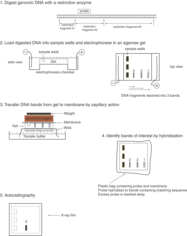 Specific DNA fragments are identified by annealing with a probe that has been labeled with radioactive phosphorus or fluorescent nucleotides. The probe is usually a piece of cloned DNA isolated from its vector. The probe is denatured into its two strands just before application to the membrane. This allows each strand of the probe to anneal to the denatured DNAs bound to the membrane. Radioactive nucleotides are incorporated into probes in several ways. Nick translation involves nicking one strand of the DNA double helix with DNase I and then elongating from this point by E. coli DNA polymerase I replacing one strand with radioactive nucleotides. In random priming, a mixture of many different oligonucleotides, usually hexamers, is annealed to denatured DNA strands to serve as a primer for elongation of the templates. This technique has the advantage of giving very high specific activities (usually greater than 109 cpm (counts per million) per μg with 32P-labeled nucleotides) and can be used to label DNA fragments in low melting point agarose directly after excision from an electrophoretic gel. Various alternative means to label probes, including production of a single-stranded probe with M13 phage or riboprobes (labeled RNA probes), are useful in special circumstances. When oligonucleotides are used as probes, they are simply end-labeled with polynucleotide kinase, which transfers the γ-phosphate (usually bearing radioactive 32P) from adenosine triphosphate (ATP) to a 5' hydroxyl group in DNA. The probe, if initially double stranded, is denatured thermally or by adjustment to an alkaline pH before hybridization. It is added to a suitable hybridization medium and allowed to anneal to the target DNA immobilized on the blot. Annealing or hybridization takes place best at approximately 5° C below the melting temperature (Tm) of the probe-target complex. The Tm can be influenced by the hybridization solution in several ways: it will increase in proportion to the logarithm of the ionic strength of the solution, and it will decrease in the presence of formamide or other denaturant. The Tm is influenced by the length of the probe and the percentage of bases that are G and C. G:C base pairing is more stable than A:T base pairing. A general formula for the melting temperature of a hybrid is: Tm = 81.5° C - 16.6(log10[Na+]) + 0.41(% G + C)– 0.63(% formamide) – (600 / probe length) where [Na+] is the sodium ion concentration in molar dimension, and probe length is in base pairs. In addition, the Tm of a hybrid is decreased by 1 × to 1.5 × for each percent of mismatch between the probe and its target sequence. Hybrids formed by RNA are slightly more stable, so an RNA-DNA hybrid might melt at a temperature as much as 10° C above the corresponding DNA-DNA hybrid. Finally, short oligonucleotides follow a different rule: Tm = 2(A + T) + 4(G + C) where each letter represents the number of that particular base in the oligonucleotide. For example, the Tm of a 20-mer with four A's, six G's, five C's, and five T's is 62° C. There are several protocols for hybridization in common use, each of which works well if used appropriately. These protocols have several ingredients in common. Ionic strength (Na+ concentration, other monovalent cations) and denaturants such as formamide influence the stability of specific hybrids. A second group of components including detergents (especially sodium dodecyl sulfate) and charged species (such as bovine serum albumin, polyvinyl pyrolidone, and ficoll in Denhardt's solution) tend to decrease nonspecific binding of the probe to the membrane, which is usually dependent on charge phenomena. Finally, components such as herring sperm DNA are designed to decrease nonspecific binding of repetitive elements in the probe to target DNA. Probes that contain repetitive elements also can be preannealed for several hours to a low Cot value with sheared human DNA so that these sites in the probe are “protected” and cannot recognize repetitive DNA on the membrane immobilized target DNA. This preannealing step blocks the repetitive elements in the probe so that only unique sequences of the probe are available to hybridize to DNA bound on the membrane. This decreases nonspecific binding when the probe is used for hybridization. Dextran can be included to increase the rate of hybridization. Usually the probe is incubated with a filter overnight to assure the specific hybridization of the probe to the filter-bound DNA reaches equilibrium. After hybridization of the probe to filter-bound DNAs, excess nonspecifically bound probe is rinsed off by a series of incubations in large volumes of buffer. Initially, nonstringent washes are performed. These buffers are usually approximately 300 mM salt and near room temperature. These preliminary washes remove most excess radioactive probe and are followed by stringent washes that are conducted at elevated temperatures, near the Tm of the probe. The buffer for a stringent wash contains about 15 mM salt, and the wash temperature is set at 52° to 68° C for 20 minutes. There are two to four changes of the stringent buffer. Under these conditions only tightly and specifically bound probe remains attached to the filter. Afterward, the membrane with the specifically bound probe is wrapped in Saran Wrap or sealed in a plastic pouch, placed in a light-tight cassette on a piece of x-ray film (autoradiography), and left to expose the film for 1 to 2 days. Usually two intensifying screens are placed in the cassette to shorten exposure time. To reduce reciprocity failure of the film, the exposure is normally carried out at -80° C. This low temperature reduces thermal decay of the first of the two interactions required for a latent image to form on the film. The image on the developed film identifies the hybridizing DNA bands. The comparison of cloned gene fragments with authentic human DNA can validate the cloning process and show whether the entire