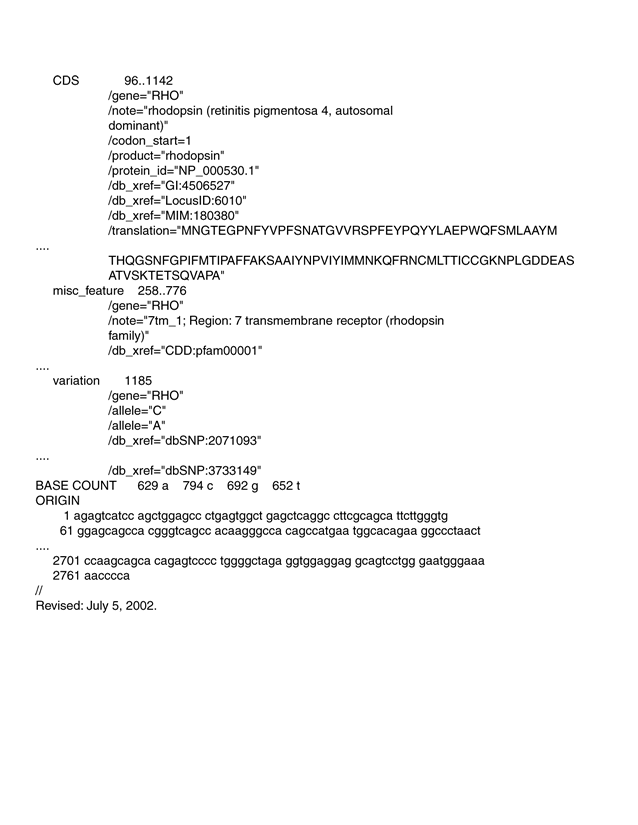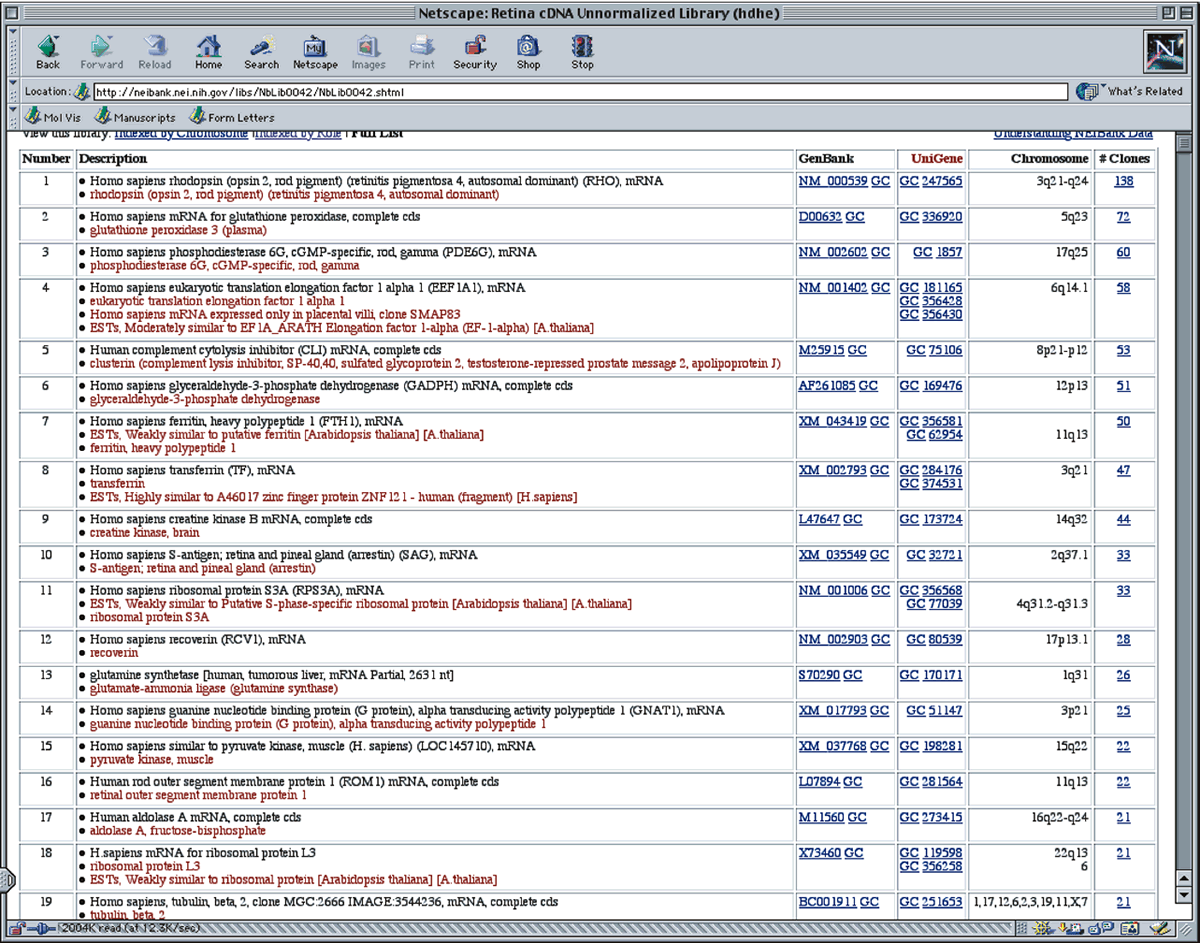 NEIBank, A DATABASE OF EYE-SPECIFIC CDNAS AND GENES Illustrated in Figure 23 is a section of the webpage detailing abundant cDNAs found in un-normalized cDNA libraries from adult human retinas. The web page is from NEIBank, a catalog of information about the genes that are expressed in several different tissues from the eye. This collection is searchable in several different ways. In Figure 23, a list of cDNA clones expressed in the retina is shown. Only the first 19 clones of about 2700 are listed. The clones are listed by abundance of the cDNA in different retina-specific cDNA libraries. The most abundant cDNA is rhodopsin, and 138 clones were found in the database. The chromosomal location of each clone is listed. The GenBank entry and Unigene cluster entries also are given. GC stands for “Gene Cards” and a link is often provided to further information on the given gene. The NEIBank can be searched by gene, keywords, protein names, or general protein classifications. Each of the tissue-specific databases can be searched with a protein or DNA sequence using a “Blast” searching utility.