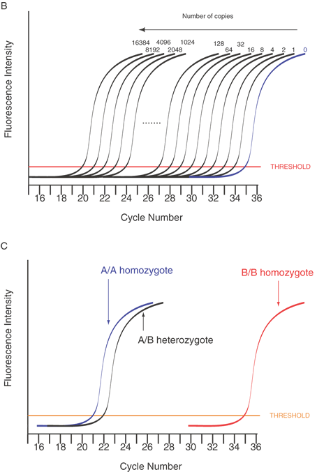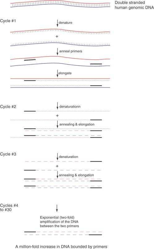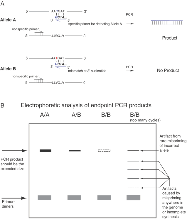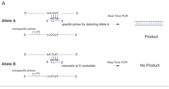 Single-base sequence variations can be analyzed by PCR assay. Suitable oligonucleotides flanking a base change are used to prime the PCR, amplifying the included region by as much as a millionfold. Within limits of approximately 100 bp to several kb, the size of the amplified fragment can be adjusted for convenience in the analysis, especially if multiple loci are to be analyzed simultaneously. Once the target sequence is amplified, it can be analyzed in several ways. Most directly, the PCR sample can be digested with an appropriate restriction enzyme for the base change, subjected to gel electrophoresis, and visualized by staining with ethidium bromide or other dye that fluoresces only when bound to double-stranded DNA. This provides an efficient and reliable analysis without requiring radioactive label. This technique is shown in Figure 10. Another approach is to employ one primer that contains a perfect match to one allele but that bears a single base mismatch at the 3' end with the other allele. This primer provides a specific amplification only when the perfectly matched allele is present. By analyzing PCR product accumulation after each cycle, typing of an individual can be carried out. The patient's status as a double homozygote for one allele, a homozygote for the other allele, or a heterozygote can be accomplished (Fig. 11). One limitation of the PCR technique is that the polymerase used sometimes misincorporates the wrong nucleotide. Thus, care must be taken when single PCR products are subcloned and analyzed by DNA sequencing or restriction analyses. At least three clones must be analyzed to ensure that the correct sequence has been obtained. When the entire PCR product is analyzed directly, this low frequency of errors is of little import. Several different polymerases are now available, including Pfu, Vent, and Hot Tub polymerases, which have lower error rates than Taq polymerase. POINT MUTATION DETECTION Point mutations are variations at one base. These can be detected if they fall in restriction enzyme recognition sites as described in the section on RFLPs or by several other techniques, also described in this section. Each of these techniques has advantages and has played a role in developing polymorphic markers in the past decade. Orita and associates32 developed an approach for detection and identification of single-base changes called single-stranded conformation polymorphisms (SSCPs). Amplified DNAs are denatured by boiling and allowed to renature in dilute conditions that favor intramolecular interactions rather than allowing double-stranded complexes to form. Sequences that are identical except for a single-base variation may form similar, but not identical, secondary structures. Frequently, the free energy of the most stable structures may be very close, but the secondary structures may look entirely different. Inclusion of 10% glycerol, different detergents, or variation of the temperature at which a gel is run can markedly enhance the differences in mobility of two related DNA species. Although renaturation conditions must be optimized to maximize the differences in mobilities of two nearly identical sequences, once found, the technique is rapid and simple. Heteroduplex analysis can be carried out directly after PCR amplification by the addition of one extra cycle of heat denaturation and slow cooling. In an individual who is a heterozygote for a point change, three types of annealed DNA duplexes will form. One pair of DNA strands will be homogeneous for allele 1 sequences (a homoduplex), another homoduplex pair will be homogeneous for allele 2, and the third pair will be a heteroduplex of one strand from allele 1 and the other strand from allele 2, as shown in Figure 12. The homogeneous strands of both alleles usually run with identical mobility on a polyacrylamide gel; however, the heteroduplex usually runs slightly slower. This decrease in mobility is due to the lack of the hydrogen bonding of bases at the point variation, creating a “bubble” in the middle of the double stranded DNA. Again, the conditions of electrophoresis can be optimized to maximize the mobility difference of the homogeneous DNAs compared to the heteroduplex structures.33,34 Newton and co-workers35 applied chemical degradation reactions to modify selectively the nonpaired bases of the heteroduplexes and then break the DNA strands at the modified bases.36 The heteroduplexes are cut into two or more smaller fragments of DNA, distinguishing heterozygotes from the homozygotes, as shown in Figure 13. A similar technique consists of hybridizing RNA complementary to one allele with sample DNA.37 The RNA-DNA hybrid is then treated with RNase A. If even a single base mismatch exists, the RNA will be cut, and the sample can be analyzed by gel electrophoresis. This is similar in principle to the analysis of DNA-DNA hybrids by modified Maxam-Gilbert sequencing reactions, in which strand breaks occur preferentially at mismatched bases.36 Techniques dependent on melting hybrids or snapback regions of a DNA strand, such as denaturing gradient gel electrophoresis, have been useful.38 Denaturing gradient gel electrophoresis (DGGE) and thermal gradient gel electrophoresis (TGGE) are similar techniques designed to identify the differences of the heteroduplexes and the homoduplexes. Denaturing gradient gel electrophoresis allows reliable identification of single-base changes in a DNA fragment up to 1 kb in size. These techniques are illustrated in Figure 13. DGGE and TGGE are based on the principle that the heteroduplex, because of its one mispaired set of bases, is less stable than a homoduplex. By performing electrophoresis of these DNAs in an increasing gradient of either temperature (TGGE) or concentration of denaturant (DGGE), the heteroduplex will partially melt before the homoduplexes. Together with the property that Y-shaped and partially denatured DNAs are much less mobile than double-stranded DNA