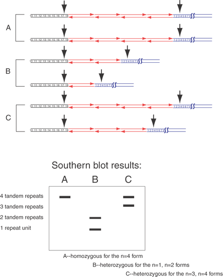 Separately, three other syntheses are carried out for each of the other deoxynucleotide and dideoxynucleotide pairs. This produces a full set of DNA fragments, all starting at the same point but ending at each base position of the DNA fragment being sequenced. Because of the small amounts of material being synthesized, a chemical label, or tag, is incorporated into the DNA during synthesis. For small-scale projects, the usual tag is radioactivity, which allows the DNA to be detected by autoradiography. The isotope most commonly used for DNA sequencing is 35S; it emits a β-particle that interacts with the emulsion of x-ray film placed on top of the sequencing gel, with the resulting image of the gel shown on the autoradiogram. For larger-scale sequencing projects (and increasingly even small projects), automated systems using fluorescent-labeled nucleotides now allow rapid and highly efficient sequencing of large amounts of DNA; hundreds of automated fluorescence-based sequencers were used to sequence the human and mouse genomes. The principle of chemical degradation sequence determination is partial degradation of DNA in four separate reactions, with each reaction specific for a different base. DNA is first labeled with a radioactive tag at one end and then subjected to the four degradation reactions. The reactions break the DNA at one specific base per strand. Because excess nonradioactive carrier DNA is included in the reactions, only partial degradation of the radioactive DNA occurs, ensuring that chain cleavage is random along the length of the DNA chain. The degraded chains form nested sets of molecules differing in length by only one base, and the products can be analyzed by acrylamide gel electrophoresis. Otherwise, the analysis of the products of the Sanger and the Gilbert method is very similar. Sequences larger than the typical 600-base reading are obtained by assembling overlapping sequence readings. The overlapping readings can be obtained by using a different primer, subcloning different DNA fragments, or using another trick, such as transposing a primer annealing site into other parts of the DNA insert. The redundancy inherent in overlapping sequence readings contributes to the accuracy of the completed sequence. To further heighten the quality and reliability of the sequence information, the sequence of each strand of the DNA is determined. Each strand complements the other; that is, an A on the first strand always forms a base pair with a T on the complementary strand, and C pairs with G on the other strand. Mistakes in interpreting gel readings or other ambiguities (sequence artifacts) from one strand usually do not occur at the corresponding position of the other strand. On occasion, the accurate determination of certain sequences remains troublesome, for example, regions very high in G + C content, but several methods have been devised to read these areas. These include the use of different polymerases, higher temperatures, and nucleotide analogs to aid in the sequencing elongation reaction. Also, higher temperatures during electrophoresis and inclusion of more potent denaturation agents in the acrylamide gels can help to prevent unusual structures in the DNA that may cause incorrect mobility in the gel or capillary. Last, a switch from the Sanger to the chemical degradation method may aid in determining the sequence. Sequences should be greater than 99.9% accurate. ALTERNATIVE SEQUENCING METHODS Other methods26 for DNA sequencing have been suggested, and three of these are worthy of discussion here. Common attributes of the three include (1) the analysis of single molecules of DNA, obviating the need to amplify or clone DNA prior to sequence analysis, and (2) no requirement for chemical degradation or synthesis to obtain a nested set of DNA molecules. In atomic force microscopy, one of these methods, because the four bases of DNA are shaped slightly differently, an atomic force microscope trace of a fragment of DNA theoretically can be used to decode the sequence.27 This technique currently resolves DNA of about 10 bp lengths,15 which is not sufficient for sequence analysis. Progress has been made to enable haplotyping of alleles.16 The second method employs a lipid bilayer containing a pore of hemolysin. DNA is driven through the pore by an electric field. Ideally, as each base passes through the pore there should be a slight fluctuation in current characteristic of the base that is passing at that instant. The sequence could be read by monitoring these small current changes with time.17 As yet, however, only short homopolymeric sequences can be differentiated. The third method relies on the hybridization of very short probes to a single long DNA molecule. The probes currently are tetramers labeled with a fluorescent tag. On average, any given tetramer will hybridize to DNA every 256 nucleotides, but due to the vagaries of any sequence, the interval between each complementary binding site of the tetramer varies, just as the pattern of restriction sites generates different-sized DNA fragments. Unlike restriction site analysis, however, the present system simultaneously determines not only the length of each interval between tetramer binding sites but also the order of these intervals. Figure 7 shows an example. With 256 different tetramers, every nucleotide in any sequence would be covered by hybridization. In principle, large genomes could be sequenced by this hybridization approach. This method begins with hybridization of tagged tetramers to isolated DNA, followed by determination of the positions of the hybridization signals. By passing a single DNA molecule lengthwise through a detector, the positions of the hybridized tags along the DNA are recorded. The steps of the technique are, first, to prepare genomic DNA or DNAs from BAC or YAC clones by conventional means. Second, labeled tetramers of the same sequence are hybridized to a long DNA fragment, resulting in
