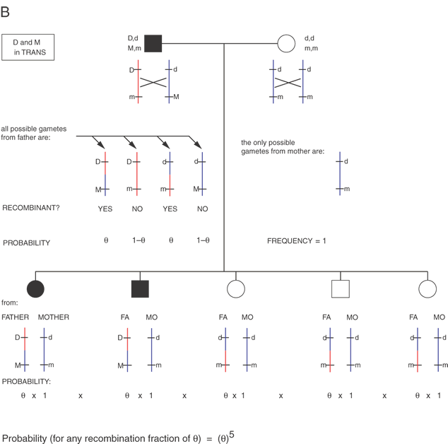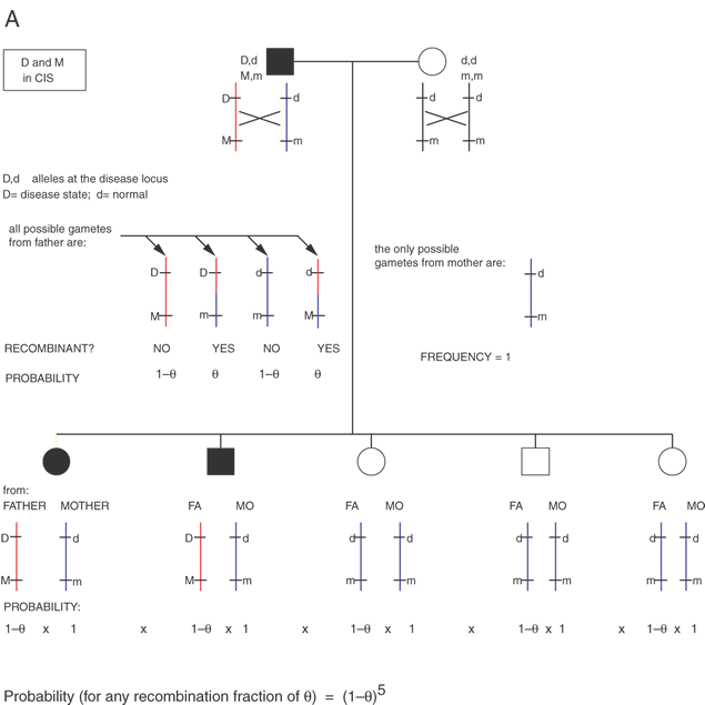 markers or polymorphisms, discussed previously. Two genetic loci are said to be linked if they tend to be inherited together within families. This co-inheritance corresponds to physical proximity on the same chromosome. If chromosomes were always inherited as intact units, the alleles of loci located on the same chromosome would always be co-inherited. However, homologous chromosomes exchange pieces during meiosis, a process called crossing over. Crossing over occurs during the pachytene stage of meiosis I, when the chromatids of homologous chromosomes are joined by the synaptonemal complex and exchange segments, or recombine. This crossing over is evident microscopically in diplonema, the next phase of meiosis I, as the tetrads separate and chiasmata (literally, cross pieces) become visible. Usually, about one chiasma is visible for each chromosome. For the human species, this process performs the useful function of increasing genetic diversity. For the geneticist, crossing over can result in the failure of alleles at two linked loci to be co-inherited. Thus, the closer two loci are on the chromosome, the less likely a chiasma is to form between them and the more likely that they will be co-inherited. Alternatively, if two (or any even number of) cross-over events occur between two loci, they will end up again on the same chromatid and will appear not to have recombined at all. Genetic linkage between a disease and the marker does not imply that the disease occurs with a specific allele at the marker locus in the general population. The latter phenomenon, termed association, is a statistical association between a specific allele at a genetic locus and a given disease more often than would be expected by random chance in human populations. Association is often found for the HLA locus and usually involves multifactorial diseases with a relatively small genetic component. Conversely, association does not imply genetic linkage, although one possible mechanism for association is close genetic linkage with linkage disequilibrium (see later). The recombination fraction (θ) between two markers is the fraction of offspring in which a detectable cross-over event occurs between the loci. When two markers are close together, more than one cross-over event is unlikely to occur between them, and the recombination fraction is approximately equal to the genetic distance, x, so that x ≈ θ. The genetic distance is measured in units called “Morgans” (M), honoring T. H. Morgan, a pioneering Drosophila geneticist. One hundredth of a Morgan is a centiMorgan (cM), and over small genetic distances 1% recombination roughly equals 1 cM. Over greater distances double recombinants occur and decrease the apparent recombination frequency compared with the genetic distance. The genetic distance can be calculated from the recombination frequency using various formulas, depending on the assumptions made about the frequency of double recombinations over a given genetic distance. The formula derived by Haldane: x = -1/2 ln(1 - 2 θ) with the inverse mapping function θ = 1/2 (1- e- 2x) assumes that an initial cross-over does not affect the probability of a second cross-over event within that region, described as no interference. In reality there might be some decrease in frequency of second cross-overs in a region after an initial cross-over has occurred, termed (positive) interference. Formulas have been derived by Kosambi and others that approximate this in a variety of ways, depending on the particular assumptions made about the strength of interference.152 These formulas have important features in common. First, they are all based on the recombination fraction in some fashion, and so they estimate genetic distance. Second, unlike recombination fractions, genetic distances are additive, so the distance between two markers should equal the sum of the distances between all markers between them. Finally, the idea of map distance formalizes the linear arrangement of genes into a genetic map, an extremely useful concept when combined with modern recombinant DNA technology. The linkage relationship between two markers (or a disease and a marker) will influence the probable inheritance pattern of these markers in a given family. For example, as mentioned previously, two markers are likely to be co-inherited if they are closely linked. Thus, finding that two markers are co-inherited in a large family would make one think that they might be closely linked, whereas finding that their alleles assort randomly would make one suspect that they are not linked. If two markers are linked at an intermediate recombination fraction (between 5 and 20 cM), the two markers will be co-inherited often but will recombine with a frequency roughly equal to the genetic distance in cM. Although human pedigrees often are too complicated to allow a direct calculation of the recombination frequency by counting recombinant and nonrecombinant meioses, the linkage relationship between two markers can be calculated using a type of analysis called maximum likelihood estimation. One can estimate the likelihood of a particular inheritance pattern for a set of markers assuming a given linkage relationship (or recombination fraction) between these markers. This likelihood can then be compared to the likelihood of that particular inheritance pattern appearing if the markers were not linked. The ratio of these two likelihoods (i.e., of linkage at a given recombination fraction versus nonlinkage) is called the odds ratio for linkage at that recombination fraction: The odds of linkage at a given θ = likelihood (given pedigree assuming θ) ÷ likelihood (given pedigree assuming unlinked, θ = 0.5). This ratio is usually expressed as a logarithm. The value is called the logarithm of the odds or lod (rhymes with odd) score: lod = log10[L(pedigree given θ) ÷ L(pedigree assuming unlinked)] Thus, a lod score of 1 represents 101:1 or 10:1 odds that a marker i