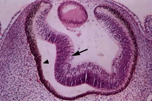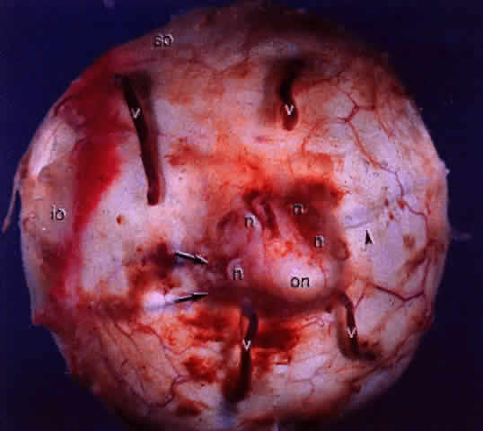 The deep brown color of the choroid results from the large number of melanocytes found around the noncapillary blood vessels in the deeper layers of the choroidal stroma and in the suprachoroidal lamellae. The number of melanocytes in the choroid increases from the inner to outer layers. The choroidal vasculature can be visualized in albino patients because of their lack of melanin pigment (Fig. 5). The vascular pattern may also be observed on gross examination of eyes (Fig. 6). Despite being the subject of intense investigation, the exact role of the choroid remains unclear and speculative. Controversies exist regarding the angioarchitecture of the choroidal vasculature and how the vascular arrangement relates to clinical lesions demonstrated by angiography. Many unanswered questions exist: What is the significance of the architectural organization of the choriocapillaris? Although our knowledge regarding the choroid is more detailed and catalogued than it was in the past, it appears that a complete understanding of the role of the choroid lies in the future. It is likely that new modalities of examining the choroidal circulation may accelerate this process. EMBRYOLOGY The choroid develops from two embryonic tissues: the mesoderm and cranial neural crest cells. In the 3-mm embryo, undifferentiated tissue derived from cranial neural crest cells surrounds the optic vesicle.1–5 Tubes or spaces lined with endothelium of mesodermal origin grow from the central axis to the caudal end of the optic vesicle. The tubes form a plexus, which constantly changes and expands as the primitive eye grows. At this stage, the tubes are neither veins nor arteries, and the direction of blood flow is not orderly. The choroid is thought to develop in three stages: