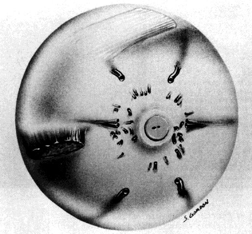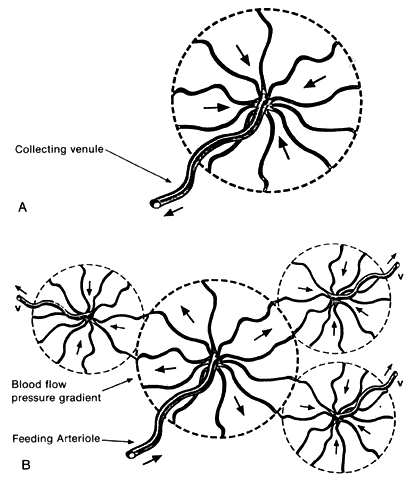 Using corrosion vascular casts and scanning electron microscopy of the human choroid, Yoneya and Tso38 studied the angioarchitecture of the entire human choroid from posterior pole to the periphery. With painstaking dissection, they followed the large arteries through medium-sized arteries to the precapillary arterioles and traced the venules to the vortex veins. In the outer choroidal layers, they found that the large choroidal arteries and veins between the macula and optic disc were tortuous and interlacing, whereas temporal to the macula to the equator they were arranged in an orderly parallel manner. The medium-sized choroidal arteries and veins in the middle choroidal layers repeatedly branched and formed interarterial and intervenous anastomoses posteriorly, but from the equator to the periphery they ran parallel to each other. The anastomoses were thought to distribute blood in the choroid and to prevent the medium-sized arteries from functioning as terminal vessels. The angioarchitecture of the choriocapillaris varied from the posterior pole to the equator. At the posterior pole, a lobular arrangement of the choriocapillaris was seen similar to that described by Torczynski and Tso.27 In the equatorial region, the capillaries of the choriocapillaris ran a more direct course, joining the precapillary arterioles to the postcapillary venules in a spindle shape. Two or three arterioles were noted to feed a spindled segment of the choriocapillaris, which drained into one venule that drained adjacent segments of choriocapillaris. The arterioles joined and the venules drained the choriocapillaris obliquely from the scleral side. Although several adjacent spindle segments of the choriocapillaris draining into one postcapillary venule could be interpreted as a lobule with a central venule, the distinct lobular pattern evident in the posterior pole was not seen in the equator. At the periphery, the precapillary arterioles and postcapillary venules ran parallel in the plane of the choriocapillaris. The capillaries either joined adjacent arterioles and venules at right angles, forming a ladder pattern, or they fanned out from the terminal arterioles to the venules. McLeod and Lutty40 published a study of the human choroid, which was prepared by flat embedding in glycol methacrylate after immunostaining with alkaline phosphatase. The stained choroidal sections were then examined macroscopically and histologically. A differential immunostaining pattern for the alkaline phosphatase permitted arteries and veins to be distinguished: arteries generally stained less intensely than venular and capillary endothelium. Their findings revealed a lobular organization of the choriocapillaris in the posterior pole; however, in contrast to the findings of other authors, a draining venule was located in the center of the lobule, and feeding arterioles were found to be distributed around the periphery of the lobule. A similar lobular pattern of the choriocapillaris with a central postcapillary venule and peripheral precapillary arterioles was demonstrated at the equator. The peripheral choriocapillaris was shown to have a ladder-like pattern, similar to that described by Yoneya and Tso.38 Fryczkowski39 reported on the variation in the choriocapillaris from region to region in the choroid as determined by vascular casting and scanning electron microscopy. In his study, arteries and veins were subjectively differentiated by the appearance of endothelial nuclear impressions on the surface of the intraluminal vascular casts. Accordingly, the endothelial nuclear indentations of arteries were spindle shaped, whereas in veins the endothelial nuclear indentations were round to oval and randomly distributed. The choriocapillaris appeared as a regular honeycomb pattern of freely interconnected capillaries with no evidence of a lobular arrangement when viewed from the retinal aspect in the peripapillary and submacular areas. A lobular appearance of the choriocapillaris became evident in the posterior pole approximately 1 mm temporal, superior, and inferior to the submacular area and extending to the equator. The lobular choriocapillaris in the posterior pole and equatorial areas were found to have a collecting venule in the center and peripheral feeding arterioles of the anatomic lobule in 86% of cases. The arterioles and veins opened into the choriocapillaris either at 90° angles or tangentially. Peripherally, the lobular arrangement changed into a palm-leaf or fan-shaped pattern, with the choriocapillaris terminating at the ora serrata. The feeding arterioles and collecting venules ran in the same plane as the capillaries. Fryczkowski39 introduced the concept of the choroidal functional vascular unit (Fig. 24) to explain the inconsistencies between his anatomic model of the choriocapillaris (lobules with a central precapillary venule and peripheral precapillary arterioles) and the functional choroidal filling pattern described in angiographic studies. The choroidal functional vascular unit is independent of the anatomic appearance of the choriocapillaris and consists of two major parts. The first is a centrally located main feeding arteriole with a centrifugal arterial capillary system. The second part is formed by centripetal capillaries from a few surrounding collecting venules. The mode of blood flow through the choroidal functional vascular unit is dependent on the blood pressure gradient that occurs on the border between the arterial and venous capillaries. Pulsatile blood flow from the central arteriole into the centrifugal low-pressure venous capillaries results in the appearance of lobular choriocapillaris filling. Perturbations in the usual blood-flow gradient in physiologic and pathologic conditions could result in blood flow from one functional lobule to another. Stated another way, the direction of blood flow out of the choriocapillaris lobule is determined by the peripheral resistance. Because this resis