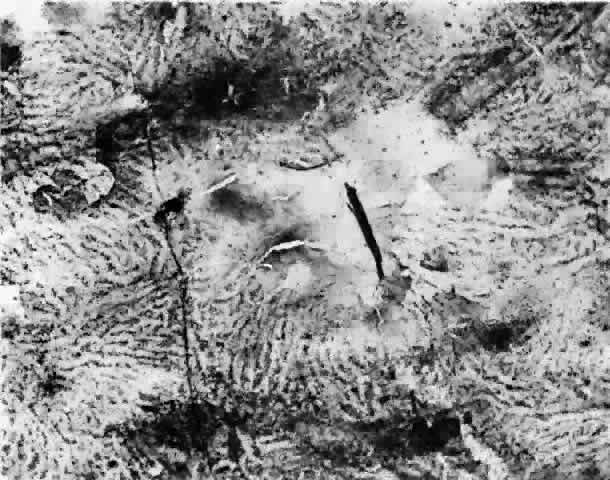 Ultrastructurally, the basement membrane of the RPE and choriocapillaris is made of fine filaments that blend with the collagen of the adjacent collagenous zones. The basement membrane of the RPE is separated from the cytoplasmic membrane of the RPE, from which it is derived, by a 100 nm radiolucent zone. The cytoplasmic membrane of the RPE cell has many infoldings, which its basement membrane usually does not follow, although it may project slightly into the outer part of some folds.22,23 The basement membrane of the RPE is continuous with the basement membranes of the pigmented epithelium of the ciliary body and anterior pigmented epithelium of the iris and, therefore, extends from the optic disc to the pupillary edge of the iris. The basement membrane of the choriocapillaris is discontinuous at the intercapillary septa. The inner and outer collagenous zones are made up of randomly oriented collagen fibers measuring 60 nm in diameter. Many are parallel to the retina, and others pass from the inner collagenous zone through the elastic layer into the outer collagenous zone. At the ora serrata, the inner collagenous layer thickens, displacing the elastic layer outwardly. The elastic layer, the middle layer of Bruch's membrane, is a dense, irregularly interrupted band composed of interwoven elastic tissue fibers of various thickness. The elastic fibers are ultrastructurally composed of long and straight rods with a homogeneous core and dense cortex. Variably sized spaces are present between the elastic fibers. They provide passageways for collagen fibers from the inner collagenous zone to the outer collagenous zone and into the intercapillary septa and subcapillary zone of the choriocapillaris (Fig. 10). The elastic tissue and collagenous layers of Bruch's membrane become circularly oriented around the edge of the optic nerve.