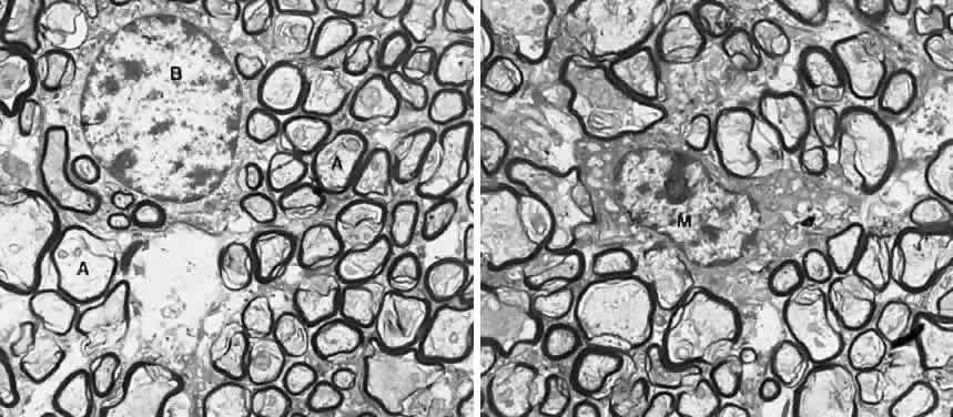 Immunohistochemical analysis reveals two subtypes of astrocytes, types 1A and 1B, in the optic nerve head.5 Type 1A astrocytes, located at the edges of the cribriform plates, form the glial limiting membrane that supports the axons. Type 1B astrocytes form the glial columns, line the cribriform plates, and may interface between blood vessels and other connective tissue surfaces.5 Both astrocyte subtypes, 1A and 1B, are positive forglial fibrillary acidic protein (GFAP) and negative for A2B5, an antibody that recognizes an epitope common to sialogangliosides and sulfatides in the plasma membrane of neurons and neuroendocrine and glial cells.6,7 The major difference between the two subtypes is that type 1A astrocytes are negative for both HNK-1 and N-CAM (antibodies associated with the HNK-1 epitope and the neural cell adhesion molecule, respectively), whereas type 1B cells are positive for both of these antibodies.8–10 In contrast to the other portions of the optic nerve, there are no oligodendrocytes in the optic nerve head. INTRAORBITAL, INTRACANALICULAR, AND INTRACRANIAL PORTIONS OF THE OPTIC NERVE These three portions of the optic nerve are composed of myelinated axons; neuroglial cells, including astrocytes, microglia, and oligodendrocytes; and fibrovascular septa, consisting of the blood vessels, fibroblasts, and pial meningothelial cells. The axons are grouped into bundles by astrocyte columns and vascular connective tissue septa. Within a group, axons are separated from each other by myelin sheaths, interspaced with the cytoplasmic processes of glial cells. Axons The axons, also called nerve fibers, are the major component of the optic nerve. The nonmyelinated axons of the retinal ganglion cells converge toward and turn sharply on the optic disc. Once they penetrate the lamina cribrosa, the axons immediately become myelinated (see Fig. 2). In cross-section using hematoxylin and eosin (H&E) stain, the principal myelinated optic nerve fibers appear as small, faintly stained, eosinophilic dots surrounded by relatively clear halos. These clear halos, representing the myelin sheaths, are the result of lipid dissolution during processing. Special stains can be used to enhance the appearance of axons (e.g., Bodian's method and Luxol fast blue staining). Under electron microscopy, the nerve fibers are identified as cytoplasm with mitochondria enveloped by multilaminar myelin sheaths. The myelin sheaths of the optic nerve are formed by oligodendrocytes (Fig. 3). A distinct arrangement of axons is found in the optic nerve: the peripheral retinal axons are located in the peripheral portion of the optic nerve, and the central area of the nerve contains fibers from the posterior retina. Macular fibers form the papillomacular bundle and enter the disc temporally; they remain temporal for a short distance behind the eye, but as they proceed further posteriorly these fibers become diffusely distributed. Nerve fibers arising in the nasal half of the retina cross in the chiasm; axons arising in the temporal half are uncrossed.11 It is believed that most optic nerve fibers carry afferent visual and pupillomotor impulses. A few fibers project to the hypothalamus or superior colliculus, where they may provide afferent information affecting the body's circadian rhythm or a rudimentary representation of the visual space (blindsight), respectively.12,13 Efferent (centrifugal) fibers of the optic nerve, presumed to be vasomotor in function, were identified in the human optic nerve after enucleation of the globe. Silver staining of these axons showed retrograde degeneration, whereas the remaining axons in the orbital portion of the optic nerve showed little or no retrograde degeneration. In uninterrupted optic nerve, efferent axons could not be differentiated from those of the afferent type.14