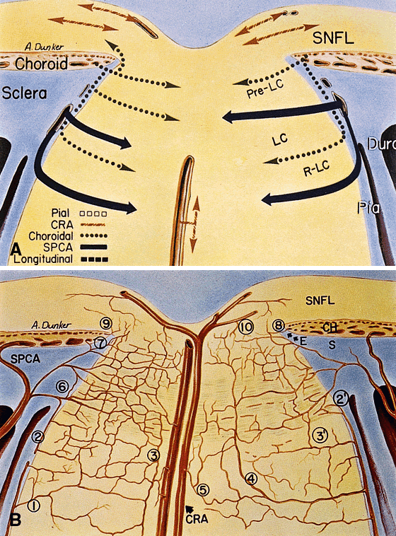OPTIC NERVE HEAD The blood supply to the optic nerve head comes from an extensive network of arterioles and capillaries originating from the short posterior ciliary arteries, the central retinal vessels, the pia mater, and the choroid. The surface nerve fiber layer is primarily supplied, in a centripetal pattern, by branches of the central retinal artery arising in peripapillary retina. Direct choroidal contribution is not demonstrated in this layer. Anteriorly, the capillaries in this region are continuous with the retinal capillary bed atthe disc margin; posteriorly, they connect with the capillary bed of the prelaminar region.2,24–27 When the cilioretinal artery is present, its precapillary branches may contribute to the temporal sector of this layer.2,26 The major blood supply to the prelaminar region is the short posterior ciliary arteries. The central retinal artery does not directly contribute to this portion. In fact, there is some controversy regarding the precise blood supply to this region. The Zinn-Haller circle is an arterial anastomotic circle made up of the short posterior ciliary arteries, but some investigators report that this circle is uncommon and incomplete when it exists.2,28 Others point out the many anatomic variations of this circle and its location approximately 200 to 300 mm posterior to the superchoroidal space surrounding the optic nerve head.25–27,29 The short posterior ciliary arteries supply the prelaminar region, both through direct branches and via the Zinn-Haller circle. Another debate concerns whether the peripapillary choroidal vessels supply the optic nerve head. Some reports have emphasized the contributions of the centripetal branches from the peripapillary choroidal vessels to this region.2,28,30,31 Other studies have shown that branches from the short posterior ciliary arteries, passing through the sclera rather than through the choroid, supply most of the optic nerve head.25,27,32 However, 10% of the vessels entering the prelaminar region originate from choroidal vessels.26 The capillaries in this region are complex, randomly arranged, and continuous with the capillary bed of the surface nerve fiber layer and laminar region. Because of the capillary network, the central retinal artery and the short posterior ciliary artery can communicate and contribute to the prelaminar region.26,33 Infrequently, the branches of cilioretinal arteries also supply this region.26 The laminar region is entirely supplied by branches from the short posterior ciliary arteries and the Zinn-Haller circle.2,26 The peripapillary choroid may contribute occasional small arterioles.25 The capillaries in the laminar region form striated layers following the pattern of the connective tissue septa of this region and are continuous with the capillaries of the retrolaminar region. The retrolaminar region is considered an integral part of the optic nerve head on the basis of blood supply. The blood to this region comes mainly from the pial vessels on the periphery of the optic nerve and branches arising from the short posterior ciliary arteries.2,25 The central retinal artery also contributes centrifugal branches during its intraneural course in the optic nerve.2 Hayreh2 reported contribution to this region from the peripapillary choroid, but the same was not noted by Onda and colleagues.25 This region also receives blood from the laminar region through a continuous capillary network. The capillaries become sparse in this region in comparison to the surface nerve fiber layer and the prelaminar and laminar regions.34–36 The blood supply to the optic nerve head is demonstrated in Figure 7. The venous drainage of the optic nerve head is mainly through centripetal tributaries to the central retinal vein. Smaller venules also drain from the superficial nerve fiber layer to the choroid (opticociliary veins).26 The arteries, veins, and capillaries in the optic nerve head and the nerve are similar to the vessels of the CNS. The endothelia are nonfenestrated and have tight junctions. Pericytes and their processes are found on the outside of the endothelia in some capillaries. The blood vessels in the optic nerve head do not leak fluorescein or other tracers. The capillary network of the optic nerve head is separate from that of choroid. A vascular cuff is noted at the boundary of the peripapillary choroid and the optic disc head, which also has nonfenestrated endothelia.27 Although the capillary bed of the choroid similarly derives from the posterior ciliary arteries, it has a fenestrated endothelium with few pericytes, and it leaks fluorescein. OPTIC NERVE It is generally agreed that the main blood supply to the intraorbital portion of the optic nerve is directly or indirectly derived from the ophthalmic artery via the vessels of the pia mater. Ophthalmic artery branches cross the dural sheath 10 to 12 mm behind the eye to contribute to the pial system. Recurrent branches from the posterior ciliary arteries and juxtapapillary choroid add to the anterior pial supply. The centripetal branches from the central retinal artery may cosupply the intraorbital optic nerve. The central retinal artery, also a branch of the ophthalmic artery, passes directly through the subarachnoid space to enter the nerve, whereas the accompanying vein has a variable course that is more oblique. The intracranial portion of the optic nerve is supplied by the vessels derived from the internal carotid, anterior cerebral, anterior communicating, and ophthalmic arteries. The pial arterioles become capillaries as they pass through the pial septa into the axial portion of the nerve. Capillaries in the retrolaminar optic nerve are continuous with those of the laminar region but are decreased in number.34–36 The pathway of the ophthalmic artery branches to the central retinal vessels through the sheaths and into the nerve is of clinical importance. Neoplasms and inflammatory processes originating in the eye or the o