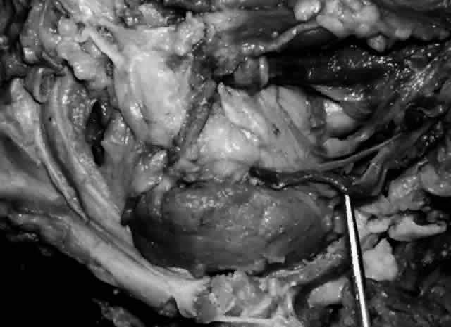 The palpebral lobe is primarily attached on its underside to conjunctiva and to the intermuscular membrane between the superior and lateral rectus muscles. Only medially is it separated from conjunctiva by the superior tarsal muscle of Müller ( Müller's muscle). The parenchyma of the gland is made up of small lobules separated by a fine connective tissue network. The lacrimal gland has approximately 12 secretory ducts (Fig. 7), which average 0.66 mm in diameter and 2.31 mm in length.4 Two to five of them originate from the orbital lobe and six to eight from the palpebral lobe. The ductules from the orbital portion of the lacrimal gland pass through the parenchyma of the palpebral lobe before exiting into the superotemporal portion of the conjunctival fornix 4 or 5 mm above the upper border of the tarsus. One or two may open near the lateral canthus.5 Excision of the palpebral lobe may therefore interrupt drainage from the orbital lobe as well. Sanderson and Stasior4 found islands of “peripheral” lacrimal glandular tissue below the lateral canthus unassociated with the main gland in 60% of cadaver specimens (Fig. 8). These peripheral islands of glandular tissue were found less commonly in or above the lateral canthal tendon. The Accessory Lacrimal Glands The accessory lacrimal exocrine glands of Wolfring and Krause structurally resemble the main lacrimal gland but on a lesser scale. Between 20 and 40 glands of Krause are located in the superior conjunctival fornix; 2 to 8 are located in the inferior conjunctival fornix. Between 3 and 20 glands of Wolfring can be found along the upper border of the superior tarsus, 1 to 4 below the lower tarsus and an occasional gland in the caruncle and in the plica semilunaris. The glands of Wolfring are larger in size than glands of Krause.4–6 Jones7 termed the accessory lacrimal glands the basal secretors because they do not possess direct secretory motor fibers. The other basal secretors are the sebaceous glands (meibomian and Zeis) and the mucous glands (goblet cells). The reflex secretors are the main lacrimal glands. Reflex secretion provides additional secretion by peripheral sensory (fifth nerve efferent, seventh nerve afferent), retinal or psychogenic stimulation. VASCULAR SUPPLY TO THE SECRETORY APPARATUS The lacrimal gland receives its arterial supply from the lacrimal branch of the ophthalmic artery, which enters the gland near its posterior margin. An additional arterial supply is often seen from the infraorbital branch of the internal maxillary artery. The lacrimal artery divides within the gland and continues anteriorly to form the lateral palpebral pretarsal arterial arcades of the eyelid. Venules form a lacrimal vein (Fig. 9) which exits the gland near its posterior margin. The lacrimal vein follows a similar intraorbital course as the lacrimal artery, superior to the lateral rectus muscle and lateral to the superior rectus muscle, before it drains into the superior ophthalmic vein and eventually into the cavernous sinus. Lymphatic drainage from the lacrimal gland enters the conjunctival and palpebral systems to drain into the preauricular nodes. NERVE SUPPLY TO THE SECRETORY APPARATUS The lacrimal gland is richly innervated by the lacrimal nerve (sensory), the facial nerve (parasympathetic), and the sympathetic nervous system. The lacrimal nerve carries sensory fibers from the lacrimal gland and is one of the three branches of the ophthalmic division of the trigeminal nerve (cranial nerve V1). Afferent sensory fibers of the lacrimal nerve leave the lacrimal gland posteriorly near the lacrimal vessels (Fig. 10). Sensory fibers of the lacrimal nerve traverse the orbit superotemporally, along the superior border of the lateral rectus muscle, remaining outside the muscle cone. They leave the orbit through the superior orbital fissure, then pass through the cavernous sinus. Their cell bodies are found in the gasserian ganglion.