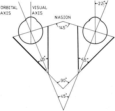Each eye lies within a bony, roughly cone-shaped cavity in the head, called the orbit. The medial walls of the orbit are approximately parallel to the midsagittal plane, and the lateral walls form an angle of approximately 90 degrees with each other. The medial and lateral orbital walls thus form an angle of approximately 45 degrees with each other. Each orbital axis therefore diverges from the midline by about 22.5 degrees and from the axis of the other orbit by about 45 degrees (Fig. 1)39