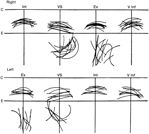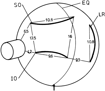 The eye muscles grow with the eye and orbit in early childhood.65–67 The lengths in infancy and at age 1 year are listed in Table 3. Lengths in adults are the same within measurement error. Note that in Figure 8, which shows an infant eye and an adult eye superimposed, the angular proportions stay the same. Eye muscle lengths increase by about the same proportion (40% to 50%). Thus the percent contraction of each muscle stays the same for a given size eye movement, and it seems probable that the central innervation patterns need only minor adjustments to compensate for growth.