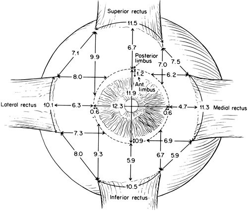 MUSCLES There are six extrinsic extraocular muscles—four rectus and two oblique—that attach to and rotate the eye. They are arranged anatomically and functionally in three pairs.40–45 Each of the six muscles attaches at one end to the sclera and at the other end to the bony orbit. Five of these muscles have their origin at the orbital apex; the sixth (inferior oblique) originates at the front of the orbit. A seventh muscle, the levator palpebrae superioris, elevates the upper lid but plays no role in positioning the eye; it will not be directly discussed further. The four rectus muscles—superior, inferior, medial, and lateral—are approximately 40 mm in length and have a width six times their thickness. They arise from a fibrous ring at the orbital apex, the anulus of Zinn, and course forward, unconstrained by connective tissue, as progressively flat strips in a cone-shaped configuration, attaching to the sclera several millimeters posterior to the limbus.46–59 Exact insertion points have been measured in a number of studies; some of the results are excerpted in Table 1. More recently, results of a large and complete series were similar to those of the older studies for the parameters that were measured (see Fig. 3). It shows that the old series measured from the anterior limbal edge to the middle of the insertion. The tendons vary in length: medial 4 mm, inferior and superior 6 mm, and lateral 9 mm. The insertions vary somewhat in shape and location (Table 1, Fig. 2). The distance of the insertions behind the limbus increases in the sequence medial, inferior, lateral, and superior rectus. This progression is known as the spiral of Tillaux (Fig. 3)60