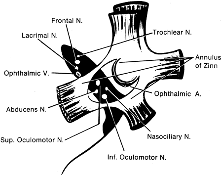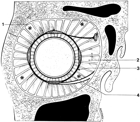 The monkey is commonly used as a model for human anatomy and physiology.68 The orbit in the monkey is somewhat different in shape from that in humans; consequently the muscles have qualitatively different primary position actions. The monkey orbital axis is 2 degrees more lateral and points upward by 15 degrees, compared to 1 degree downward in humans. Monkey horizontal recti have a significant torsional action, unlike those in humans Monkey vertical recti ack the adducting action present in humans. In the primary position, the oblique muscles of the monkey have a more vertical than torsional action. BLOOD SUPPLY The extraocular muscles are supplied by the muscular branches of the ophthalmic artery, which usually occur as two main stems and a varying number of smaller twigs.44,45 Further blood supply may arise from the lacrimal and infraorbital arteries. The venous drainage of the extraocular muscles is into the superior and inferior orbital veins. The lateral (or upper) muscular branch of the ophthalmic artery supplies the lateral and superior rectus, superior oblique, and levator muscles. The levator may also receive twigs from the supraorbital artery. The medial (or inferior) muscular branch, the larger of the two, supplies the medial and inferior recti and the inferior oblique. The infraorbital artery sends a branch to the inferior oblique. The lacrimal artery sends branches to the lateral and superior recti. The extraocular muscles have fibers in two layers: orbital and global. Each contains different types of muscle fibers (vide infra). The orbital layer has continually contracting, mitochondria-rich fibers that use aerobic metabolism; therefore, the blood supply to the orbital layer is greater than that to the global layer. The orbital layer thus has more vessels per unit of area, more vessels per muscle fiber, and more vascular lumenal area than the global layer.69 The anterior ciliary arteries, which supply blood to the anterior segment of the eye, pass through the rectus muscles and penetrate the sclera at the muscle insertions. There are two anterior ciliary arteries in each rectus except the lateral, which has only one. The anterior ciliary arteries merely pass through the rectus muscles and do not supply blood to these muscles. Anterior segment ischemia may result from interruption of the anterior ciliary arteries; a clinical rule of thumb is to avoid surgery on more than two rectus muscles at a time to minimize this risk. INNERVATION The third cranial nerve (oculomotor) divides within the orbit into superior and inferior branches. The superior division innervates the superior rectus and levator palpebrae. The inferior division innervates the inferior and medial recti and the inferior oblique. The fourth (trochlear) nerve innervates the superior oblique, and the sixth (abducens) cranial nerve innervates the lateral rectus.44,45 The nerves enter the rectus muscles from within the muscle cone at approximately the junction of the middle and posterior thirds of the muscle (for the superior, medial, and inferior recti) and just posterior to the middle (for the lateral rectus). The superior oblique is supplied by its nerve in several branches that enter the anterior half of the posterior third of the muscle, on its orbital surface. The inferior oblique is supplied at about the middle of its posterior border. ORBITAL TISSUES The orbital tissues of importance for the extraocular muscles are Tenon's capsule70 and the system of connective tissue septa that span the orbit. The literature contains numerous descriptions of the orbital connective tissue and Tenon's capsule based on gross dissection or injection of preserved specimens. These techniques tend to produce nonexistent fascial planes and ligaments. Whitnall's study of Tenon's capsule in fresh postmortem preparations has given us one of the most accurate descriptions of this structure.44 Tenon's Capsule Tenon's capsule, or the fascia bulbi, is a layer of delicate connective tissue that completely envelops the globe from the limbus to the optic nerve, forming a potential space free of any tissue attachments that might restrict globe rotation. Posteriorly, it is loosely attached by extremely fine connective tissue filaments to the sclera. This episcleral space contains no fluid or endothelium and is not a full-fledged ball-and-socket joint in function. The globe can rotate some within the capsule; however, beyond small rotations, the globe and capsule move together, deflecting the orbital fat attached behind. This is to be expected, since the capsule is attached firmly to the eye at the limbus and to the muscles at their points of entrance. The anterior one third of the capsule lies anterior to the rectus muscle insertions and is thinner and more adherent to the globe, fusing to the sclera at the corneoscleral limbus. On its outer surfaces, Tenon's capsule in front is loosely adherent to the conjunctiva and can be readily separated from it. In contrast, the posterior capsule is firmly attached to the orbital fat and connective tissue meshwork. Tenon's capsule is penetrated by the optic nerve, the extraocular muscles, and the blood vessels and nerves serving the globe. About the optic nerve the capsule is penetrated and broken up by multiple posterior ciliary arteries and nerves, and some have considered it to cease a few millimeters away from the optic nerve. There is no sheath continuing backward around the optic nerve. The rectus muscles pierce Tenon's capsule anterior to the equator of the globe and pick up sleevelike extensions of the capsule. The intracapsular portion of the rectus muscles is 7 to 10 mm in length. From the point of capsular penetration to the insertion, each muscle has fascial expansions from its edges that attach to the overlying Tenon's capsule, forming falciform folds,72 and insert into the sclera lateral and posterior to the muscle insertion. Small attachments between the undersurface of the muscle and the