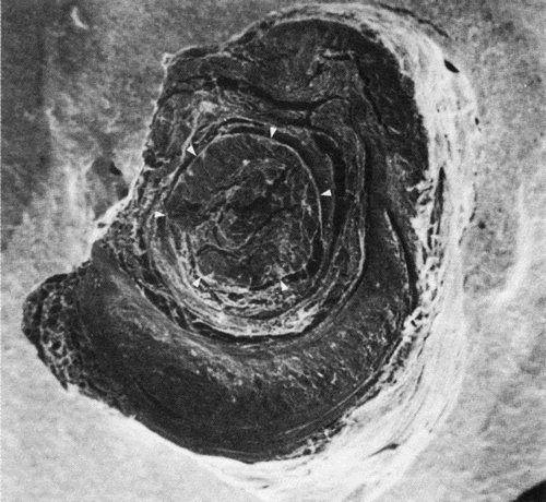 The afferent nerves from the extraocular muscles have a course that depends on the species. The two chief possibilities are that sensory fibers travel in the ophthalmic division of the trigeminal nerve or in the oculomotor nerve itself. In the sheep, goat, cow, pig, and cat, branches from the three ocular motor nerves join the ophthalmic division of the trigeminal nerve in the cavernous sinus.238–243 The ganglion cell body for these fibers has been shown to be in the semilunar (trigeminal) ganglion. In the sheep, the second-order neuron has been located in the descending trigeminal nucleus.244 In the cat, first-order neurons have been located in both the semilunar ganglion and the mesencephalic nucleus of the trigeminal nerve.245 Also, Tarkhan noted that although sensory afferents may travel for a distance in the oculomotor nerve of the cat, their origin is in the sensory nucleus of the trigeminal nerve.246 Cooper and co-workers concluded that, in the goat, afferents from low-threshold receptors travel in the ophthalmic division of the trigeminal nerve, and afferents from high-threshold receptors travel in the oculomotor nerve roots.247 The peripheral pathway for muscle afferents in the monkey was studied by Tozer and Sherrington.248 Section of the three ocular motor nerves (III, IV, and VI) at their points of exit from the brain stem resulted in virtually complete degeneration of these nerves at the muscles, implying that the afferents run in these nerves. The few remaining small nerves were considered to be autonomic. These authors concluded that any contribution in the orbit from the trigeminal nerve was insignificant. Warwick sectioned the oculomotor and trochlear nerves and found degeneration in the mesencephalic nucleus of the trigeminal nerve, implying that while the afferent fibers may travel in the oculomotor nerve, the cell body of those fibers is in the trigeminal sensory nucleus.249 Taren, after placing a lesion in the nucleus of the mesencephalic tract of the trigeminal nerve, found degeneration in the trochlear and abducens nerves (the lesion was too caudal to involve the oculomotor nerve).250 Thus, in the monkey the first-order neuron is displaced into the brain stem. Work with horseradish peroxidase tracers has shown that the central termination of afferents is in the pars interpolaris of the spinal trigeminal nucleus and in the cuneate nucleus in the caudal medulla,251–253 in an area that also serves neck afferents. In humans, small anastomoses between the ophthalmic and oculomotor nerves are found in the region of the superior orbital fissure or the walls of the cavernous sinus. Similar anastomoses to the trochlear or abducens nerve are less constant.254,255 Thus, an anatomic basis is present for either pattern of afferent anatomy. Muscle Spindles The muscle spindles in the extraocular muscles have caused perhaps more confusion than the different fiber types, first because of their variable presence in various species, and second concerning their functional role. Spindles have been described in the human, chimpanzee, macaque, mouse, pig (wild and domestic), sheep, goat, cow, ox, deer, giraffe, and gnu. None have been found in the cat, dog, rabbit, rat, hare, fox, baboon, or birds.232 There is no evident rhyme or reason for this assortment of species—why one species has spindles and another does not. Early reports of spindles in human extraocular muscle were overlooked,86,257–259 and it was widely thought that humans, like common laboratory animals, lacked eye muscle spindles, until they were redescribed by Cooper and Daniel in 1949 (Figs. 25, 26, and 27).112,115,260–262 Data on human extraocular muscle spindles are summarized in Tables 14, 15, and 16.