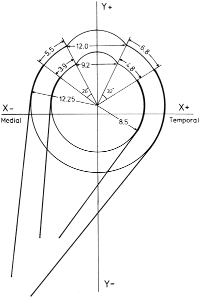 *Coordinates are in millimeters from the left of eye in the rectilinear Cartesian coordinate system. X is positive laterally, Y is positive to the front, and Z is positive upward. von Helmholtz H: Handbuch der Physiologischen Optik. 3rd ed. Hamburg, 1910.