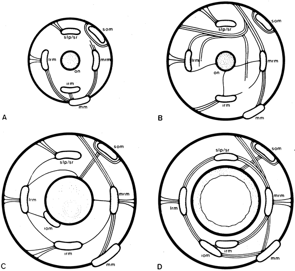 The pattern of human eye muscle development is similar to that in elasmobranchs, reptiles, birds, marsupials, and the cat.1–5 A pattern of six extraocular muscles and motor nuclei is present in all