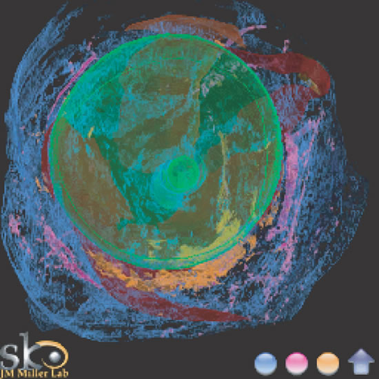 The anulus of Zinn is oval in cross section and overlies the optic foramen and the medial portion of the superior orbital fissure (Fig. 4). The lower portion of the ring (tendon of Zinn) is attached to the inferior root of the lesser wing of the sphenoid below the optic foramen and gives rise to the inferior rectus and part of the medial and lateral recti. The attachment site may be developed into a small tubercle, the infraoptic tubercle. The upper portion of the ring (tendon of Lockwood) attaches to the body of the sphenoid and bridges over the superior orbital fissure; where it attaches to the greater wing of the sphenoid, a bony spur may occur (spina recti lateralis). Through the anulus pass the optic nerve, ophthalmic artery, abducens nerve, upper and lower divisions of the oculomotor nerve, and nasociliary branch of the ophthalmic nerve. The two oblique muscles approach the eye from the front.61,62 The superior oblique muscle arises from the frontoethmoidal suture, superomedial to the anulus of Zinn and the origin of the medial rectus. It courses forward along the junction of the medial orbital wall and roof; after passing through the pulley, or trochlea (Fig. 5), it is redirected posteriorly and inserts in the lateral, posterior, superior octant of the globe (Fig. 6), passing between the superior rectus muscle and the globe. The superior oblique muscle is more rounded or fusiform than the other extrinsic muscles. The inferior oblique muscle arises behind the lower orbital margin on the orbital plate of the maxilla and proceeds in a direct path to its insertion in the lateral, posterior, inferior octant of the globe. It passes below the inferior rectus. The neurovascular bundle to the inferior oblique muscle courses forward along the lateral border of the inferior rectus and enters the oblique muscle at its midportion. Associated with it is strong connective tissue such that when the muscle is disinserted and transposed forward to insert next to the interior rectus, the neurovascular bundle appears to form a new point of origin for contraction of the inferior oblique, inducing a depressing action.63Mensuration data for the six oculorotary human muscles are shown in Table 1. Table 2 lists the locations of the origins and insertions in a three-dimensional coordinate system. The x-axis is positive laterally, the y-axis positive anteriorly, and the z-axis positive superiorly. The origin is at the center of the eye. These measurements were made usingvarying techniques, and the differences among the sets of measurement are of interest. These coordinates are useful in quantitative calculations of the directions of muscle pull and the three-dimensional cooperation of the extraocular muscles. Figure 7 shows the positions of the extraocular muscles when plotted from such data. Orbital pulleys (vide infra) determine the functional origins of the muscles, and similar coordinates can be provided for each pulley. These coordinates can be determined by analysis of orbital magnetic resonance images obtained with the eye in specified directions. The pulley is at a point that is relatively invariant in position as the eye assumes various directions of gaze.