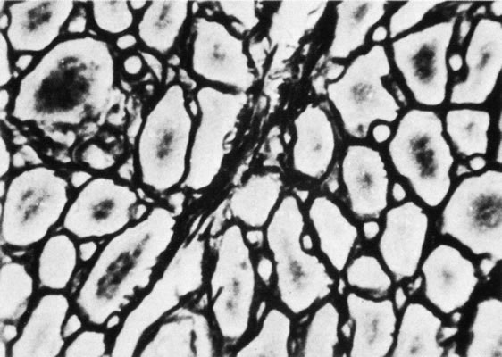CONNECTIVE TISSUE The connective tissue surrounding the extraocular muscles is more delicate than that around ordinary skeletal muscles. The muscle fibers are distributed in a capillary-rich, loose connective tissue. The capillaries in extraocular muscle are of the closed type, with the bidirectional transfer of macromolecules achieved by transendothelial vesicular transport.85 Adjacent to the surface of each muscle fiber (cell) is a layer about 50-nm thick that stains as a mucopolysaccharide. This, in turn, is surrounded by a delicate reticulum of argyrophilic (collagenous) fibers (Fig. 13) and elastin fibers (Fig. 14).86,87 The fibers are uniformly distributed, and the muscle is penetrated by a few intramuscular septa (the internal perimysium) that consist of collagenous fibers and contain many nerves and blood vessels. Argyrophilic fibers occur at the muscle fiber–connective tissue junction. The internal perimysium is continuous with the external muscle sheath or capsule (external perimysium or epimysium). Between the muscle fibers are numerous nerve fibers. Capillary vessels are most numerous on the outer, orbital surface of the muscle, which contains the smaller muscle fibers that are constantly active. Blood flow measurements in the cat show that the average flow in the six extraocular muscles is greater than that in any skeletal muscles and exceeded only by that in the myocardium. The muscle sheath is very thin for 2 cm or so from the muscle origin.44,45 On approaching the back of the globe, a thicker, opaque sheath that contains inner longitudinal fibers and outer circumferential fibers develops. The outer layer fuses with Tenon's capsule. MUSCLE FIBERS Eye muscle histology is a subject vexed by confusion and controversy. This is partly due to interspecies variation in the eye muscles but also to difficulty in making correlations between structure and function. The basis for understanding the extraocular muscle fiber types is the work that has been done on skeletal muscle. With the use of a variety of techniques—physiological,88 histochemical,89,90 biochemical,91,92 immunocytochemical,93–95 and ultrastructural 93,96–98—three or four fiber types have been delineated in skeletal muscle. When studied in detail, the extraocular muscle fibers are not exactly like those of any skeletal muscle. In broad outline, extraocular muscle shares with skeletal muscle a spectrum of twitch fibers, differing in rapidity of contraction and in fatiguability (“white” versus “red”). In addition, there are tonically contracting fibers, which do not occur at all in skeletal muscle. Skeletal muscles differ one from another in the proportion of fiber types. In contrast, except for one fiber type, all extraocular muscles are similar in fiber type composition. Like skeletal muscle, all fibers innervated by one axon are of the same type. Light Microscopy A gross muscle contains clusters of adjacent parallel muscle cells that are delimited by connective tissue septa. Such a cluster is a fasciculus. The muscle cells, which are also called fibers, are roughly cylindrical, multinucleated cells bounded by a plasma membrane. The ends fuse with the inelastic tissue of the muscle tendon. The extrinsic eye muscles have structural features not found in limb muscle, and the microscopic appearance is therefore somewhat different from that of ordinary skeletal muscle. This is not surprising in view of the unique functional abilities of the extraocular muscles—constancy of activity, rapidity, and fine gradation of contraction. Extraocular muscles have a lower innervation ratio, greater vascularity,99 and a looser connective tissue envelope, rich in elastic fibers,86,87 than are found in skeletal muscle. Normal extraocular muscle has features that in skeletal muscle are associated with myopathy. The fiber shape and size are variable, and there are more small fibers.100 There is usually a mild mononuclear inflammatory cell infiltration. Compared with skeletal muscle, there are more fibrous connective tissue and internal nuclei. Thus, ordinary myopathy and neuropathy cannot be distinguished in extraocular muscles using conventional morphologic criteria.101 Furthermore, individual fibers may show changes, observable by light or electron microscopy, which in skeletal muscle are considered pathologic. Such changes are whorled fibers, ringbinden fibers, vacuoles within myofilament bundles, subsarcolemmal inclusions, sarcomere disruption, nemaline rods, smearing of Z lines, mitochondrial clumping, mitochondrial abnormalities, zebra bodies, and Hirano bodies.102 These findings occur in children as well as in adults. The early histologic literature contains evidence of more than one fiber type in extraocular muscle. Fibers were distinguished by diameter, content of sarcoplasm, size and location of nuclei, fibrils, and presence of hypolemmal rings. Thus, in 1910, Cilimbaris103 noted clear fibers with few nuclei and little sarcoplasm, dark fibers with many nuclei and plentiful sarcoplasm, and intermediate types. Thulin,104 in 1914, described three muscle types in human and monkey extraocular muscle. The first contained irregular fibrils of varying size (i.e., Felderstruktur). Furthermore, he mentioned that this type had nerve terminals of a special structure (which he did not describe). A second type showed abundant cytoplasm with a regular arrangement of fibrils (i.e., Fibrillenstruktur). The third type had a fibrillar, cross-striated appearance but also had hypolemmal, circularly arranged fibrils. These are now known as ringbinden fibers and probably represent a degenerative change. Kato, in 1938,51 distinguished two zones within extraocular muscle, differing in cell size and staining reactions: an inner layer next to the eye itself (the global layer) and an outer, orbital layer. Sometimes an additional intermediate zone can be distinguished. In rectus muscles the orbital layer is C-shaped. The oblique muscles ar