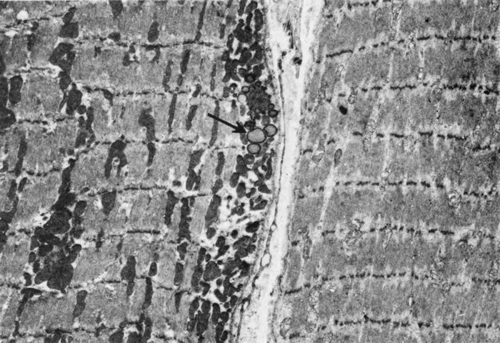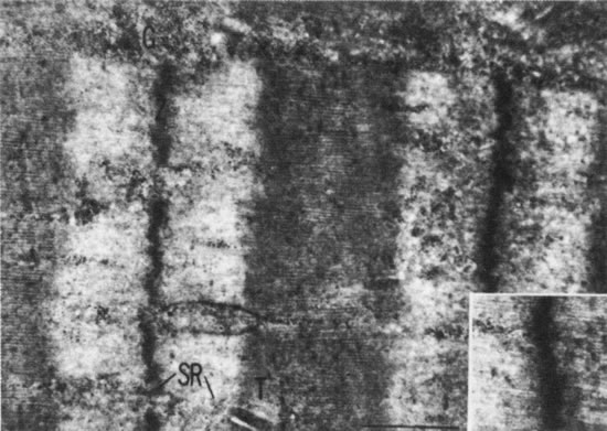 Within a species, the extraocular muscles may differ from one another in the proportion of the fiber types.125 In the human, the largest difference is in the percentage of twitch fibers in the orbital layer. The medial rectus has the highest percentage of twitch fibers in the orbital layer. The medial rectus has the highest percentage and the lateral rectus the lowest percentage of these fibers.101 The orbital layer twitch fiber shows the most variation in mitochondrial content between species. Mitochondrial content is most highly developed in primates. In lower species, rows of numerous and large mitochondria lie between myofibrils in the center of the cell. In primates, this fiber type has, in addition to the central mitochondria, large subsarcolemmal clusters of mitochondria, correspondingly appropriate oxidative enzyme profile on histochemistry and a rich capillary supply. In the global layer, the most prominent species dif ference is the diameter of the muscle fibers. Electron Microscopy Extraocular muscles were first examined with the electron microscope in the guinea pig by Hess in 1961.126 His work clearly showed two morphologic fiber types. Hess and Pilar,127,128 in 1963, extended this work to the cat and combined it with physiologic studies establishing two types of contractile fiber. Initial work on other species confirmed these two broad types of muscle fiber in cats,129 rabbits,130,131 monkeys,132,133 and humans.134–136 Combined with histochemistry, five muscle fiber types were shown in monkeys.137 Beyond fiber size and location in the muscle (orbital or global layer) and features observable by light microscopy, electron microscopy enables observation of many morphologic details by which fibers may be classified. The features used for classification include diameter; position in the muscle; number of mitochondria; development of endoplasmic reticulum; size and development of transverse tubules; arrangement of fibrils; fine structure of fibrils, such as presence of the M line or thickness of the Z line; various biochemical properties, such as the amount of glycogen or lipid droplets, or the activity of various metabolic enzymes; and the innervation pattern, which is single or multiple. Generally, the grouping of features for any single parameter is loose, specifying, for example, more or less sarcoplasmic reticulum. However, after observation of enough fibers, associations between these morphologic parameters are evident. In transverse electron micrographs, the most reliable criteria to classify fiber types are size and delineation of myofibrils; size, number, and location of mitochondria; and development of sarco plasmic reticulum and T tubules. These subcellular morphologic details relate directly to the functional specialization of the various fiber types. Detailed electron microscopic work has shown five to seven types of muscle fiber based on ultrastructural morphology in each species studied: mouse,113 rat,116,138 rabbit,139 sheep,117 cat,110,140 and monkey.141,142 Spencer and Porter have reviewed the comparative ultrastructural morphology of the various fiber types in detail.143 Table 6 lists some correspondences among several electron microscopic studies of extraocular muscle fibers that have been done in mammals.101,113,114,116,117,137,140,144 The external cell membrane, the sarcolemma, is a bilamellar leaflet 7.5- to 10-nm thick that is universal to all cells. This, in turn, is surrounded by a basement membrane 30- to 50-nm thick and a very delicate connective tissue meshwork. Some authors consider the sarcolemma to contain both the plasma and basement membranes. Each cell contains internal substructures, known as filaments, that are arranged in repeating subassemblies, called sarcomeres, and into parallel structures called fibrils (or myofibrils), which produce the contractile force of the muscle. The bulk of each fiber consists of myofibrils that lie parallel to the length of the cell and run almost end to end. The very ends of the cell taper. The myofibrils are cylinders and have no membrane sheath. In eye muscle they range from 0.1 to 0.5 μm in diameter. In addition to myofibrils the cytoplasm of the muscle cell contains multiple nuclei, Golgi apparatus, mitochondria, glycogen granules, ribosomes, lipid bodies, transverse tubules, and sarcoplasmic reticulum. The spaces between the fibrils are interlaced with two membranous systems, the transverse tubular system (T system) and the sarcoplasmic reticulum, a specialization of the endoplasmic reticulum of cells in general. The T system is continuous with the sarcolemma, and large molecules added to the bathing medium may be found within the T system. The T system penetrates between the fibrils, in places seeming to encircle them, at a location along the sarcomere that is species specific; in human extraocular as well as skeletal muscle it is at the junction of the A and I bands. The sarcoplasmic reticulum contains irregular tubules and sacs that also lie in the spaces between the fibrils and, at the A–I junction, forms small cisternae that closely abut the transverse tubule.145,146 This close association, however, does not form a tight junction. The cluster of T tubule plus cisternae on either side is called a muscle triad. The multiple nuclei are elongated in the direction of the long axis of the cell and are up to 11 μm in length. The nuclei are surrounded by an inner and an outer membrane 50 nm apart that are penetrated by pores 50 to 70 nm wide. Near the nucleus lies the Golgi apparatus, consisting of a closely spaced group of flattened smooth tubules. The mitochondria can occur under the plasma membrane, aggregated around nuclei and under synapses, and between myofilaments. They have a double membrane separated by 8 nm. The inner membrane infolds to form the cristae within the mitochondrion. The mitochondria contain oxidative enzymes. Lipid bodies, 0.5 to 1 μm in diameter, are sometimes membrane bound. T