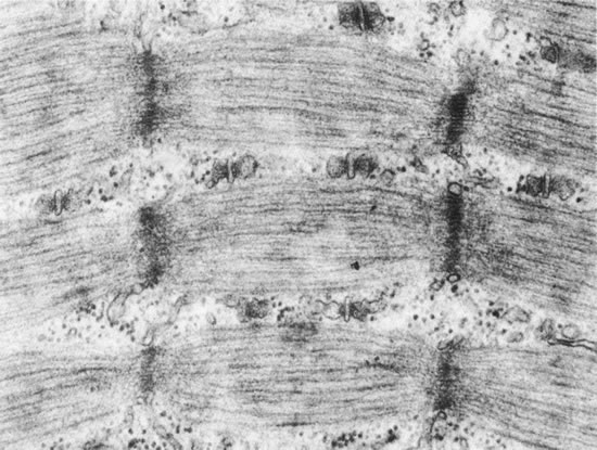 Fibrillenstruktur fibers (see Figs. 15, 16, and 17) are 25 to 50 μm in diameter and show fibrils that are distinctly separated from one another by the surrounding large amount of agranular cytoplasm. The Z lines are straight and thin. Mitochondria lie in rows between fibrils or adjacent to the sarcolemma. The sarcoplasmic reticulum and transverse tubular system are well developed, and the motor end plates resemble those of skeletal muscle (en plaque).135 In skeletal muscle, three types of Fibrillenstruktur fibers can be distinguished on the basis of number and size of mitochondria, the development of the sarcoplasmic reticulum, and the presence and distribution of glycogen and lipid droplets.130,131 The Felderstrucktur fibers (see Fig. 18) are 9 to 15 μm in diameter and have less sarcoplasm and fewer mitochondria, which are mostly arranged in small groups in peripheral areas of sarcoplasm devoid of myofibrils.134,135,152,153 The filaments merge into poorly demarcated fibrils. Z lines are thick, appear to extend across several fibrils, and wander up and down the longitudinal length of the cell. The sarcoplasmic reticulum and T system are also less evident but still present. The nerve endings are multiple (en grappe).116 MOLECULAR ANATOMY The contractile proteins in extraocular muscle occur in a variety of slightly varying molecular forms, referred to as isoforms. There is some correlation between the fiber functional type, the type of contractile proteins in the filaments, and the histochemical profile of the cell. In the fast fiber subtypes of skeletal muscle there is no simple one-to-one relationship between histochemical fiber type and the expression of different thin filament protein isoforms (troponin and tropomyosin).154 In extraocular muscle, the various fiber types differ in isoforms of myosin light chain and myosin heavy chain, as well as in thin filament proteins. Extraocular muscle contains all six myosin light chains common to fast and slow skeletal muscle.155 However, unlike skeletal muscle, extraocular muscle has relatively high activities of both glycolytic and oxidative enzymes and displays a complex pattern of lactate dehydrogenase (LDH) isozymes, which is uncharacteristic either for fast or slow muscle. Although the predominant myosin light chain species are of the fast type, the LDH isozyme and the enzyme activity patterns suggest that extraocular muscles are well suited for both aerobic and anaerobic metabolism. The multiply innervated fibers of mammalian extraocular muscle contain a type of myosin antigenically similar to that found in amphibian and avian slow muscle and distinct from that present in the slow twitch fibers of mammalian limb muscles.156,157 Mammalian extraocular muscle also contains a distinct myosin heavy chain isoform that is specifically recognized by anti-extraocular muscle antibodies. It is antigenically different from the fast myosin heavy chain isoforms identified in type 2A and type 2B fibers of limb muscles in various mammalian species156 and occurs in the extraocular muscle analog of type 2 fast twitch fibers, which represent the major fiber population in extraocular muscles. It is unique to extraocular muscle. At least six different myosin heavy chain genes are expressed at the mRNA level in adult extraocular muscle. These types are slow, fast oxidative, fast glycolytic, embryonic, neonatal, and the form unique to extraocular muscle. Protein and immunochemical analysis confirms four different myosin heavy chain types in extraocular muscle. The predominant myosin heavy chain forms in adults are fast. Immunocytochemical results suggest that different myosin isoforms are segregated into different fiber populations, although some fibers appear to contain both neonatal and fast myosin or embryonic and neonatal myosin.156,158 Embryonic and neonatal myosin heavy chains have been found in a subpopulation of fast fibers, predominantly distributed in the orbital layers.156,158 Immunocytochemistry demonstrates that different myosin isoforms tend to segregate into individual myofibers, although some fibers seem to contain more than one myosin heavy chain type.159 There are marked longitudinal differences in the proportion of myofibers expressing a given myosin isoform in the middle of the muscle compared to the ends. This change appears to occur within individual fibers as well as along the series of fibers composing the muscle. The change in isoform along a myofiber may have to be taken into account in fiber type classification schemes, adding another parameter to the otherwise simpler grouping into six types distributed into two groups (orbital and global). The myosin heavy chain gene family exhibits sequential activation of genes clustered on a single chromosome. Expression of these genes is modulated by hormonal (particularly thyroid)160–162 and neural163 influences. During neonatal development, five different myosin heavy chain mRNAs are expressed in extraocular muscle: embryonic, neonatal, fast oxidative, slow twitch, and “slow twitch-like.” Protein electrophoresis of myosin shows that the predominant form is neonatal. In the adult, the transcripts from these genes are still retained but supplemented with a fast glycolytic and the extraocular muscle–specific myosin heavy chain. There appear to be four types of terminal isoform expression: embryonic, neonatal/adult, adult similar to hind limb, and adult extraocular muscle–specific. These fiber types thus reflect different times of arrest of the myosin heavy chain developmental program. Although this myosin heavy chain transition program could be regulated at a translational level, current evidence demonstrates that myosin heavy chain synthesis is controlled mainly at the pretranslational level.164 The unique features of eye muscle are also reflected in gene expression, and extraocular muscle is defined by a distinct gene expression profile. DNA microarray analysis of extraocular muscle 