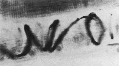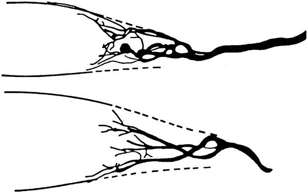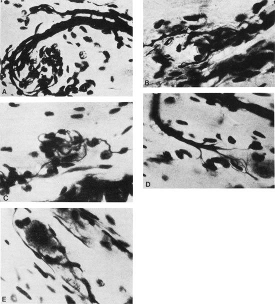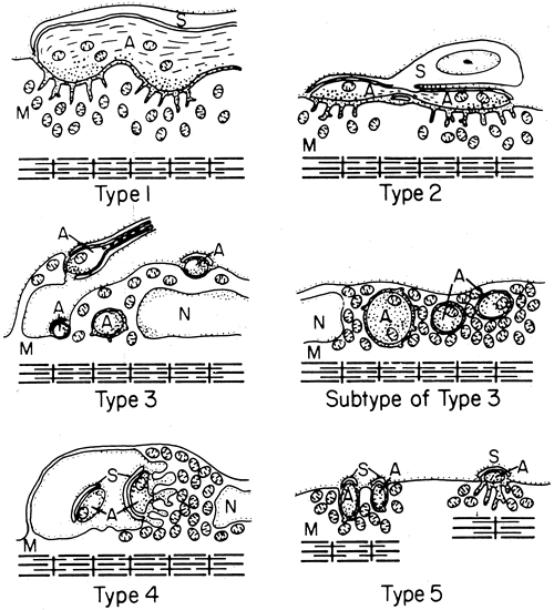 Electron microscopy of human extraocular muscle fibers identified as having en plaque or en grappe endings confirms that the en plaque fibers have Fibrillenstruktur and the en grappe fibers Felderstruktur.129,133,135,204 Mukuno217 and Spencer and Porter143 have studied the neuromuscular junctions in human extraocular muscle with electron microscopy and have noted six different types of junction (Fig. 21). As occurs in skeletal muscle, there is a correlation in synapse morphology, particularly subjunctional folding, to fiber type.218 The en plaque endings have highly developed secondary clefts branching off a primary synaptic cleft or gutter that protrudes into the muscle fiber. The en grappe endings have only a few rudimentary synaptic clefts. On light microscopy the en plaque endings are hypolemmal and the en grappe endings are epilemmal. Three of Mukuno's types (1, 2, and 5) have typical junctional folding of the muscle cell membrane and an indentation of the cell surface to form a synaptic gutter. The development of their features varies considerably. Type 1 seems to correspond to the en plaque type of ending typical of skeletal muscle. Three other types of junction (3, 3a, and 4) have hill-like protrusions of muscle cell cytoplasm at the junction site and little development of junctional folds. Types 3 and 4 show cytoplasmic bridges, and in types 3 and 3a the axon penetrates within the junctional hillock. Type 5 shows two adjacent types of ending, one indenting the cell and having no synaptic folds and the other lying on the surface and having synaptic folds. This type is suggestive of polyneuronal innervation, although this innervation pattern has not yet been demonstrated for mammalian extraocular muscle.219 Unfortunately, Mukuno was unable to determine whether the described neuromuscular junctions were part of a single or multiple innervation patterns. Electron microscopy of en grappe endings in extraocular muscles of the monkey131,204 and the rat206 has shown postsynaptic folds that make these terminals different from classic (amphibian) en grappe endings. Furthermore, in the rat, Teravainen206 found two types of multiple innervation: type 1, consisting of small end plates with subneural folds and numbering up to five plates per muscle cell, and type 2, consisting of smaller but more numerous endings that do not indent the muscle cell. Type 1 may be the rat analog of the multiply innervated twitch fibers that may exist in the cat.220,221 Mukuno's type 2 terminal is similar to Teravainen's type 1 and appears to be on a (morphologically) tonic fiber. Similarly, Teravainen's type 1 may be analogous to Mukuno's type 3 or 3a. Extraocular muscle contains spiral nerve endings that simply wrap around extrafusal muscle fibers, classically described by Daniel in the human (Fig. 22), but also found in the cat and the monkey.222–226 Daniel suggested that these endings are sensory, but Hirano thought they were motor endings.211 These spiral endings were considered to be an atypical form of muscle spindle, unique to extraocular muscle, but are now known to be a special type of motor terminal, the dapple motor end plate. They occur in the middle of the muscle in an area devoid of classic spindles. The nerve is myelinated and takes between three and eight complete turns around a single muscle fiber of any size and ends in a single fine process, somewhat resembling a classic en plaque motor end plate. There are also multiple spirals given off by a single axon, which wrap around the fiber in opposite directions. The single spirals are distinctly less numerous than the multiple ones. Further varieties of spiral terminals were described by Sas and Appeltauer.223 These authors do not say how many of these variant endings they observed; however, it seems they are much less common than the spirals described by Daniel.222