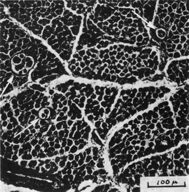 The distinction between the orbital and global layers in the rectus and oblique extraocular muscles is easily discerned by histochemistry, particularly in regard to aerobic versus anaerobic metabolism. In general, the orbital layer of muscle stains intensely for SDH, an oxidative exzyme. There is a gradient of activity dropping off from the orbital to the global layer. The opposite pattern is found for men-α-GPD, an anaerobic enzyme. The capillary blood supply is richest in the orbital layer. Human muscle fiber types are called granular, fine, and coarse on the basis of the appearance of a cross section on trichome stain (Fig. 19). The percentage representation of fiber types is the same in all six oculorotary muscles. None of the correspondences among these sets of staining reactions are exact, neither between human limb and extraocular muscle nor between human and primate extraocular muscle. This seems to reflect a precision in tailoring of the muscle cell's biochemical machinery to its exact task, which frustrates our desire to have tidy classes. The identification of functional type with appearance on trichome stain depends on whether the orbital or global layer is being looked at. In the orbital layer, the singly innervated, fast twitch fiber appears coarse, owing to a high intermyofibrillar content. In the global layer, the singly innervated, fast twitch fibers appear as coarse/granular (“red”), granular (“intermediate”), and granular/fine (“white”). The orbital multiply innervated, tonic fiber is granular in appearance and the global tonic fiber is fine. In keeping with its great number of mitochondria, the orbital singly innervated muscle fiber (Table 11, fiber type 1) has high activity of mitochondrial and sarcoplasmic oxidative enzymes (NADH-TR, SDH), similar to skeletal muscle type IIA. However, unlike skeletal muscle there is also high activity of anaerobic enzymes (phosphorylase, men-α-GPD) and a high lipid content. Trichrome staining shows a coarse pattern, caused by a high intermyofibrillar content (see Fig. 17). Although being fast-twitch fibers, the neuromuscular junction in primates consists of a zone of end plates that wrap around the muscle (suggestive of a spiral ending).