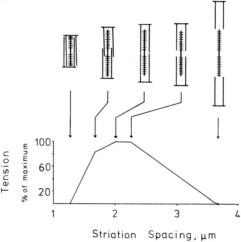 and a Felder struktur were found to have unique physiologic properties. The function of the extraocular muscles are discussed here in reverse order to anatomy (i.e., from the microscopic to the gross), beginning with the fibers and building up to the cooperative functioning and interaction of the entire muscles. At each succeeding level of organization there are new degrees of freedom in the arrangement of the muscle fibers; the way in which these possibilities of structural organization are realized has functional implications. Thus, the progressive overlap of thick and thin filaments in the sarcomere determines the linear nature of the length tension curve in the muscle's physiologic range of contraction. The next level of organization is that of the muscle fibers in the gross muscle. This can be done in several ways. For example, the eye muscles have fibers running in a parallel arrangement most of the length of the muscle. This stacks as many sarcomeres end to end as possible and maximizes the distance through which each fiber can contract and, therefore, the angular rotation range of the eye. Pennate arrangements of fibers can provide greater force but a shorter amplitude of movement. Thus, each muscle has the maximum possible length of linear length–tension curve. In addition, the parallel arrangement of fibers gives the greatest speed of contraction, because the distance of shortening of all the sarcomeres is summated. The last level of organization is that of the three-dimensional arrangement of the gross muscles. This has obvious implications for the eye movement produced by contraction of a single muscle or of all the muscles in concert, and determines the innervation pattern that must be calculated by the central nervous system (CNS) to point the eye in a particular direction in space. The command to a muscle to contract is a nerve impulse originating in the CNS. This impulse gives rise to several activation processes that follow each other in rapid succession: transmitter release in the neuromuscular junction, muscle cell membrane depolarization, muscle action potential generation (in twitch fibers), and calcium release from the sarcoplasmic reticulum. Calcium stimulates the contractile proteins to produce a contraction force (i.e., a tendency to shorten). The exact contraction depends on the load against which the muscle pulls. The eye muscles are simpler than most skeletal muscles in that the load (inertia of the globe, stretch of the antagonist and orbital tissues, and viscosity) is approximately constant. A contraction occurring with fixed muscle length is termed isometric. A contraction against a constant load is said to be isotonic. Even when a muscle is held constant in length, the sarcomeres shorten somewhat as the elasticity of the tendon and internal tissues is taken up (series elastic element).289 The mechanical response of the muscle cell to a single nerve action potential is a twitch (i.e., a brief contraction). Because the muscle excitation processes and contraction response take much longer than the nerve impulse, it is possible to restimulate the muscle with a second impulse while it is still responding to a first. This yields progressively overlapping twitches until at a high enough frequency (the fusion frequency), the responses fuse (called a tetanus). FIBERS Activation Processes SYNAPSYNAPSE AND MUSCLE DEPOLARIZATION. Membrane permeability to a specific ionic species is mediated through channels in the membrane.290,291 Each channel is a large protein molecule containing several subunits that span the cell membrane. Each channel spontaneously fluctuates between states that are open or closed to the passage of a particular ionic species. In electrically excitable tissue, the three-dimensional conformation and, therefore, ionic conductance of this protein is affected by the transmembrane electrical potential. By using the patch clamp method to record the open and closed times of a single channel, it has been observed that the open and closed time histograms are self-similar; that is, they appear the same no matter what the speed or magnification of the time axis.292,293 A phenomenon is statistically self-similar (fractal) if a property measured at scale x is proportional to the same property measured at scale ax:L(x) = kL(ax). At any level of transmembrane potential, the channel oscillates randomly between open and closed states, but with the property that the longer it is in one state the more likely it is to stay there. Thus, the measured rate constants for the probability of changing to the other conductance state change with the elapsed time in the current state. The value of the rate constant depends on the time period over which it is measured. In reality, the ion channels have a multitude of conformational states separated by small activation energy barriers, which are also changing in time. These many states are not independent but are linked by cooperative physical processes that result in fractal scaling. Synaptic transmission is implemented through a sequence of steps. Initially, the neurotransmitter is synthesized from precursors within the nerve and stored in small synaptic vesicles in the nerve terminal. The nerve terminal is depolarized by an action potential; voltage-regulated Ca2+ channels open, allowing calcium ions to diffuse down their electrochemical gradient into the nerve terminal.294 The rise in free cytoplasmic Ca2+ must be present during the period of depolarization to lead to discharge of transmitter (acetylcholine) from its storage sites. The flow of Ca2+ links membrane depolarization to transmitter release (depolarization secretion coupling). Synaptosome channels similar to the channels occurring in gap junctions have been found.295 Their properties are large conductance, low cation selectivity, calcium activation, and voltage regulation. It is hypothesized that activated synaptosome channels transiently form a direct communicat