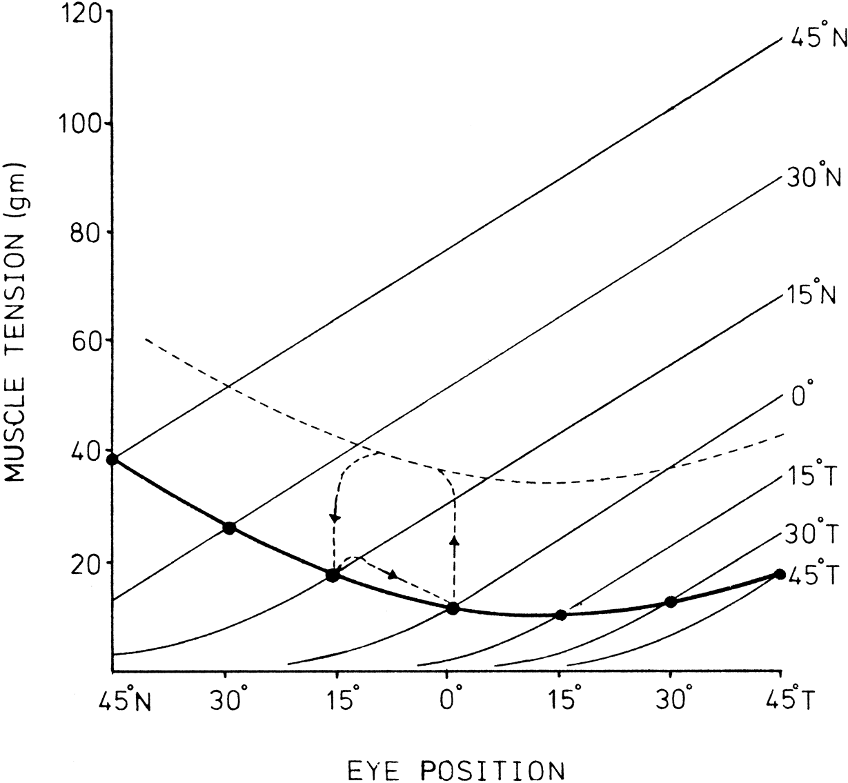 It is a geometric fact that the orientation in space of a solid object is determined by three coordinates. Rotations of a solid body about axes fixedin space do not commute, that is, the final orientation is different for the same rotations performed in a different sequence. A 90-degree rotation about a horizontal axis followed by a 90-degree rotation about a vertical axis will end up with the object in a different orientation than would result if the sequence of rotations were reversed. (Try it.) Donders, in 1847, discovered that for stationary fixation in the absence of head tilt the orientation of the eye about the fixation axis (torsion), measured in any coordinate system, is determined solely by the horizontal and vertical coordinates.355 Thus, vertical and horizontal gaze directions are the two independent rotational coordinates; the eye is restricted to a two-dimensional subspace of the three-dimensional space of all possible orientations. Put another way, there is one eye position (three coordinates) for every gaze direction (two coordinates). Preceding eye movements have no effect on the torsional posture, which is determined solely by gaze direction. Because the orientation of the eye is the same regardless of the sequence of rotations required to bring it to its current gaze direction, eye orientation is commutative. 356,357 Ocular torsion can be measured as a function of gaze direction. When this is done under certain conditions —a stationary, erect head with fixation at infinity—the result is called Listing's law.358,359 It specifies which torsional posture is actually used by the eye, and hence to which two-dimensional subspace out of all possible three-dimensional positions the eye is restricted. The actual orientation is what it would be if the eye had rotated from primary position to its final position about an axis lying in the frontal plane which passes through the center of rotation of the eye (Listing's plane). Conversely, the eye, from any direction, can be brought back to primary position by rotation about an axis in Listing's plane. When the eye moves between tertiary positions not involving primary, the rotation is about an axis not in Listing's plane. Listing's law does not apply360 in the presence of head tilt (which elicits countertorsion), optokinetic torsion, or cyclofusional or cyclophoric torsion, or during convergence,361 which has its own associated extorsion. If head tilt is allowed, countertorsion produces a varying torsional position at each direction of gaze, depending on the amount of head tilt. Donders' law is still valid but Listing's law per se does not apply. However, there is still a two-dimensional subset of torsional positions assumed by the eye as a function of gaze direction, but the relationship is something other than Listing's law. This law may not hold exactly during a smooth pursuit movement,362 but the advent of exact measurement of eye position in three dimensions with magnetic induction coils has shown that, to a good approximation, Listing's law holds during smooth pursuit and saccadic eye movements.363–366 Projection of afterimage crosses, imprinted in primary position, on a spherical surface367–369 (to prevent distortion of the shape of the cross) shows almost 10 degrees of tilt with respect to the objective vertical in gaze 45 degrees eccentric and 45 degrees oblique. A formula for the amount of torsion is given by von Helmholtz.359 Hering pointed out that a consequence of Listing's law is that retinal images of oblique lines maintain the same orientation as the eye scans along the line.370 A possible perceptual benefit of this is that the same set of orientationally tuned cortical neurons will then be continually stimulated. Depending on the coordinate system chosen, descriptions vary of the vertical corneal meridian in tertiary positions regarding its orientation to the vertical. This has caused endless confusion under the name of false torsion. The eye, in moving from primary to tertiary positions, according to Listing's law, clearly moves along the direction of one corneal meridian and in this sense undergoes no torsion. Although the Fick, Helmholtz, and Listing (or perimetric) coordinate systems agree as to the vertical in primary position, the verticals in tertiary positions are different.44,359 Thus, observed in Fick or Helmholtz coordinates, tertiary positions show (false) torsion.359,368,369 It has been experimentally determined that when a saccade shifts gaze in any direction the velocity vectors (i.e., axes of rotation) lie in distinct planes that depend on eye position371,372 (Fig. 34). Helmholtz showed that for any eye position there is an associated plane, called the displacement plane, such that the eye assumes only positions that can be reached by rotation about an axis lying in this plane.359 Only the direction of primary position is perpendicular to its displacement plane, which is Listing's plane. This constitutes a functional definition of primary position. It was shown experimentally that “normal” human subjects have primary position within 15 degrees of a parasagittal plane.372 The displacement planes for any two directions intersect in a line, which serves as an axis of rotation to take the eye from one position to the other. It has been shown experimentally that as gaze shifts away from primary position, the displacement plane tilts in the same direction by an angle equal to half the gaze angle (“half-angle rule”).372,373 For a gaze shift outside the plane of action of a muscle pair, the axis of rotation produced by that pair moves in the direction of the globe (e.g., the axis of horizontal rotation tilts back as gaze is elevated). It can be shown mathematically that pulleys can be placed and actively moved to produce the half-angle rule (the active pulley hypothesis105,374) . The pulley must be moved as far posterior to the axis of rotation as the muscle insertion moves anterior to the ce