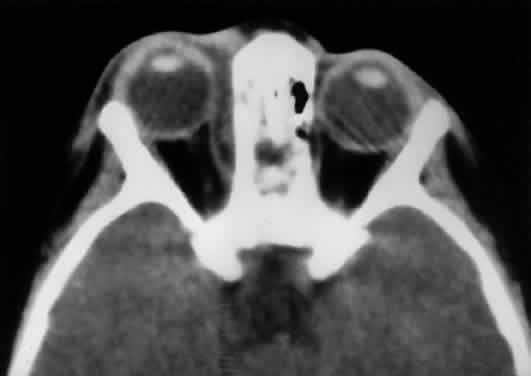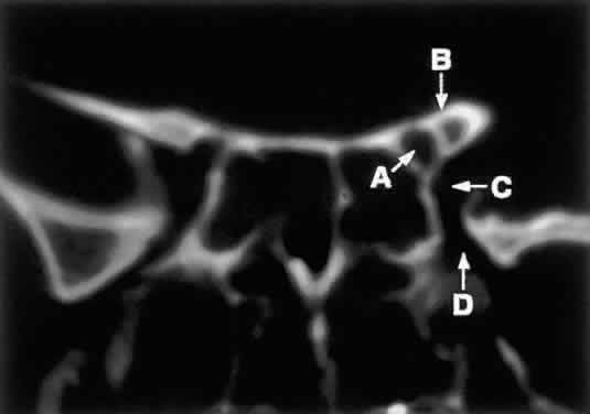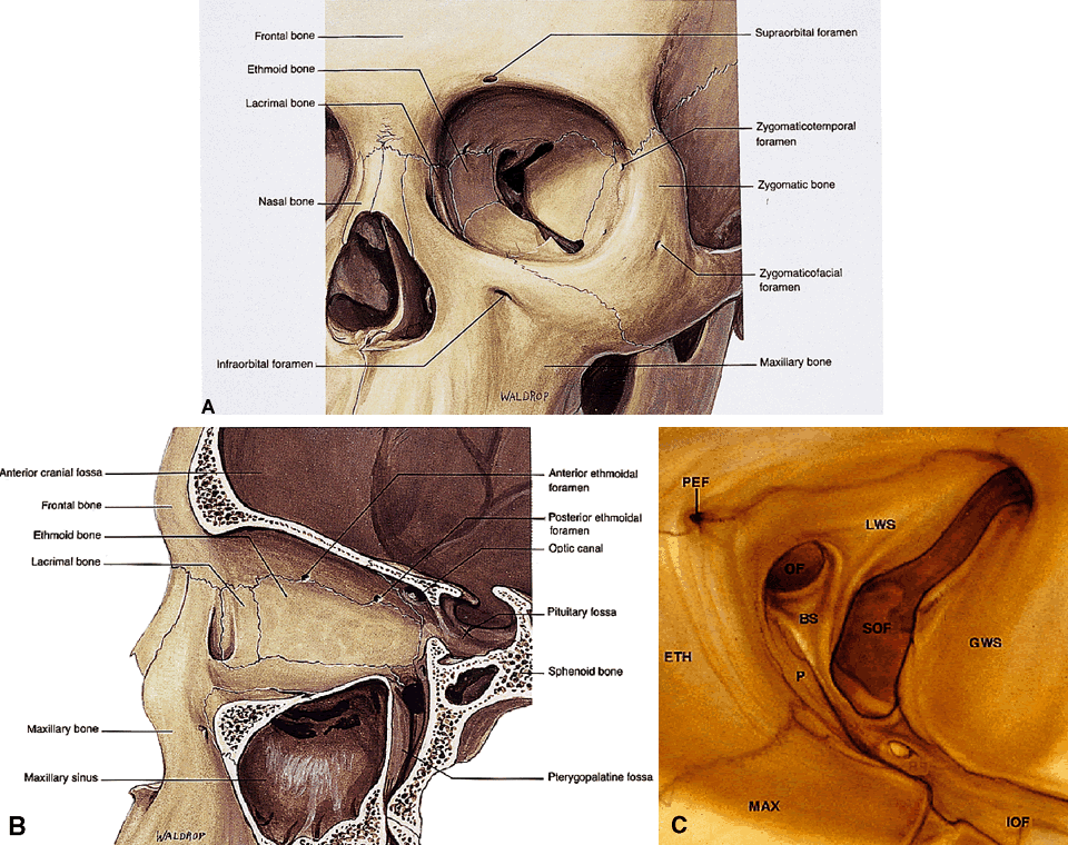A clear understanding of the relation of the bony orbit to the skull and the midface allows for a logical interpretation of the clinical and radiographic patterns of orbital disease. The bones of the face may be considered to hang from the skull, with attachments at the frontozygomatic and frontoethmoidal sutures, as well as the sphenoid bone. Craniofacial dysjunction occurs in these areas in Le Forte III fractures, and the sites of craniofacial articulation are also the basis for the Le Forte III osteotomies used for facial reconstruction in patients with craniofacial synostoses. The complex shape of the sphenoid wing provides for an intimate communication between the CS, the orbital apex, and the pterygopalatine fossa. Radiographically, the spaces and foramina of the orbital apex may be considered to lie in three tiers (Fig. 8). The CS is found on the same level as the orbital apex, connecting directly with it via the superior orbital fissure (SOF) to form the middle tier. The inferior tier is formed by the inferior orbital fissure (IOF), which provides direct communication between the orbital apex and the pterygopalatine fossa, a vertically oriented space directly behind the maxillary sinus. Finally, the optic canal has no direct communication with any of the aforementioned spaces and should be considered to lie above the SOF and CS, exiting the orbit in a superomedial course through the body of the sphenoid as the superior tier.26 Orbital apical lesions can therefore gain ready access to the CS and pterygopalatine fossa (Fig. 9). Spread into the cranial vault through the optic canal is usually limited to lesions of the optic nerve (glioma) or nerve sheath (meningioma). PARANASAL SINUSES The orbit is surrounded on three sides by the paranasal sinuses (see Fig. 5). The ethmoid sinus runs along the medial orbital wall and is divided into anterior, middle, and posterior air cells by a highly variable system of septa. It is the only sinus to be fully pneumatized at birth. The thin lamina papyracea of the medial orbital wall and the vascular foramina for the anterior and posterior ethmoidal arteries provide scant resistance to the extension of infections and tumors from the ethmoidal sinus to the orbit, even in the adult (Fig. 10). The maxillary sinus borders the orbital floor and is fully pneumatized by 2 to 4 years of age. Unlike the ethmoid sinus, it contains no supporting septa. Although the lamina papyracea is the thinnest of the orbital walls, the network of septations within the ethmoid air cells acts as a supporting scaffolding to the medial orbital wall, much the same way that corrugations strengthen cardboard. Thus, the orbital floor, although not the thinnest wall, is the most frequently fractured, having no underlying support within the maxillary sinus. The posterior wall of the maxillary sinus forms the anterior wall of the pterygopalatine fossa. Frontal sinus pneumatization is highly variable and may continue into the teenage years. Because it drains into the anterior ethmoid air cells, the frontal sinus is often concurrently involved in ethmoid sinus pathology. Supraorbital sinuses are defined as lateral extensions of the ethmoid sinus and span the orbital roof for variable lengths. On occasion, pneumatization to the level of the frontozygomatic suture may occur. Finally, the sphenoid sinus abuts the orbital apex and is the last to pneumatize. Because of the proximity of the optic canal and CS (see Fig. 8), any sphenoid sinus pathology may manifest as a parasellar syndrome (discussed later). Pneumatization of the sphenoid sinus may extend into the anterior clinoid process, a variation of normal anatomy often encountered in orbital imaging studies. FORAMINA AT THE ORBITAL APEX The orbit is generally found to contain nine openings (Table 5). Only the optic foramen, SOF, and IOF will be discussed in detail (see Fig. 8). The optic foramen is located in the medial wall of the orbit in the body and lesser wing of the sphenoid bone. The optic canal is 4 to 10 mm long and 6.5 mm wide. On imaging studies, a 1-mm difference between canal diameters is considered clinically significant. The optic canal transmits the optic nerve, the ophthalmic artery, and the sympathetic innervation to the orbit. Note that sympathetic nerves also travel with the nasociliary nerve via the SOF.