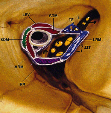 Veins Within the soft tissue of the orbit, venous drainage is distinctly separate from the arterial supply; a similar arrangement is found intracranially. Although the veins are found in a relatively reproducible pattern within the orbital septal system, the arteries travel more haphazardly within orbital fat.18 All orbital veins are valveless; this may facilitate more rapid posterior spread of infectious processes within the anterior orbit. The major venous drainage of the orbit is the superior ophthalmic vein and the CS (Fig. 21). The superior ophthalmic vein follows a medial-to-lateral route posteriorly along the superior orbit, tethered beneath the superior rectus muscle by a fascial sling.19 At the orbital apex, it is usually joined by the inferior ophthalmic vein, which also communicates through more minor branches with the pterygopalatine plexus through the IOF. The central retinal vein typically drains directly into the CS without joining the superior ophthalmic vein. Anteriorly, the orbit also drains into the angular vein of the facial plexus. Lymphatics To date, no lymphatic system has been identified within the human orbit, although recent studies that identified lymphatic drainage in primate orbits make this an intriguing possibility.20 In the eyelids, lymphatic drainage occurs through a deep (posterior lamellar) and superficial (anterior lamellar) system. The medial aspect of the eyelids drains into the submandibular lymph nodes, whereas the lateral aspect and most of the upper eyelid drain into the preauricular and parotid nodes. EXTRAOCULAR MUSCLES AND ORBITAL FASCIAL SYSTEM The EOMs insert 5.5 to 8 mm behind the limbus of the globe. Specific details regarding the dimensions and functions of each EOM are found elsewhere. Useful points are summarized in Table 6. The EOMs are striated and composed of aerobic, twitch-type Fibrillenstruktur fibers and anaerobic, tonic-type Felderstruktur fibers.36,37 The most common affliction of the EOMs is inflammatory myositis, which is seen most typically in thyroid-related orbitopathy and idiopathic inflammatory pseudotumor. Rhabdomyosarcoma, a tumor with focal striated muscle differentiation that generally occurs in children, appears to arise from indifferent orbital mesenchyme rather than from preformed and completely differentiated striated muscle fibers. Landmark anatomic investigations by Koornneef38–40 have shown that there are highly elaborate and reproducible connections of the epimysium of the EOMs with the fibrous connective tissue system of the orbital fat, the epibulbar fascia of Tenon's capsule, and the periosteum (periorbita) (Fig. 22). This extensive yet reproducible network of connective tissue provides support for the delicate neurovascular structures traversing the orbit, both facilitates and restricts the movement of EOMs in a coordinated fashion, and compartmentalizes the orbit into various spaces. Because of the inherent complexity of the orbital connective tissue system, any disruption in one area of the orbit may cause significant dysfunction of more distant areas. For example, these connections become clinically important in the understanding of restricted motility after orbital wall fracture and orbital decompressions for Graves' orbitopathy, as well as the superior sulcus and lower eyelid deformities that follow enucleation and orbital implant placement. To promote a clearer understanding, Dutton has succinctly summarized the orbital connective tissue system by dividing it into three components: Tenon's capsule, the anterior orbital suspensory system, and the posterior orbital suspensory system.41 The three components should not be considered as distinct anatomic entities, because complex attachments unite this triad into one comprehensive unit. Tenon's capsule begins anteriorly just posterior to the limbus with firm attachments to the underlying episclera, investing the globe in an elastic and vascular connective tissue cover. The capsule also encompasses the anterior portions of the EOMs. Posteriorly, Tenon's capsule surrounds the optic nerve, interdigitating with the dural sheath. Other than its anterior and posterior attachments to the globe, Tenon's capsule is only loosely adherent to the underlying sclera, thereby cushioning the movement of the globe. An intermuscular fibrous membrane connects the four rectus muscles around the globe to create a distinct intraconal space, but in the deeper orbital tissues this membranous system is not complete, so that the distinction between a central and a peripheral orbital space is lost toward the orbital apex. Anteriorly, the intermuscular fibers also blend with Tenon's capsule, creating a sort of rotating sleeve around the globe during ocular rotations. The anterior orbital suspensory system is primarily concerned with providing support for the globe and fixation for eyelid structures. In addition, fascial support exists for the lacrimal gland (Sommering's ligaments) and the superior oblique muscle in the area of the trochlea. The four main structures of the anterior system are Whitnall's suspensory ligament, Lockwood's ligament, and the medial and lateral canthal tendons. These structures are discussed in detail elsewhere. The anterior suspensory system also provides anchoring points for the check ligaments of the EOMs, limiting their overaction during ocular rotations. As already noted, the orbital septal system becomes less defined more posteriorly. The well-defined intraconal space encountered anteriorly blends with the surrounding extraconal space as one approaches the orbital apex. The annulus of Zinn, discussed earlier, forms dense adhesions to the periosteum of the orbital apex around the optic canal and SOF (see Fig. 12). In addition, fibers pass inferiorly along the IOF to interdigitate with Müller's orbital muscle, which spans the fissure. As the levator palpebrae superioris (levator) muscle and superior rectus muscle course anteriorly, diffuse connectio