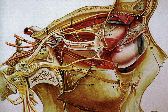 SYMPATHETIC INNERVATION OF THE ORBIT The sympathetic chain travels into the calvarium as a plexus surrounding the ICA.6 Within the CS, nerve fibers leave the carotid siphon to enter the orbit through two routes (see Fig. 14B):