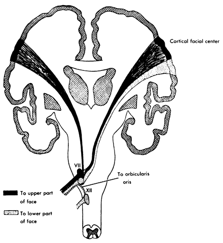 infranuclear segments. DISORDERS OF UNDERACTIVITY Supranuclear Lesions Motor function of the upper face derives from both hemispheres. As a result, supranuclear lesions involving the face will spare the functions of forehead wrinkling and eye closure. Rarely, infranuclear lesions have been described with similar sparing of function, but the accompanying lateralized neurologic findings involving the ipsilateral body usually suggest an obvious supranuclear disturbance.12 In addition to the physical examination, computerized tomographic (CT) and magnetic resonance imaging (MRI) scans allow prompt identification of these lesions. Motor strip or corticobulbar tract lesions are characterized by paresis of volitional movement, with preservation of facial tone and involuntary expressions. These involuntary functions are subserved by extrapyramidal input that originates in the basal ganglia and traverses extrapyramidal pathways to the facial nucleus. When these fibers are damaged in disease states involving the basal ganglia or brain stem (e.g., Parkinson's disease), volitional facial movements usually remain normal, whereas little facial tone or emotional expression is displayed.3,5,15 The list of possible causes of supranuclear facial paresis is large. The major categories of causes are vascular, infectious, demyelinating, and tumorous. Nuclear Lesions (Including Those of the Intrapontine Fascicle) The facial nucleus lies in close proximity to the abducens nucleus and the para-abducens (paramedian) reticular formation. Consequently, patients with nuclear lesions often present with abnormalities of contiguous structures. However, a dissociation between the facial nerve modalities of somatic motor, visceral motor, and sensation can be seen at the level of the pons. FOVILLE'S SYNDROME. Patients with Foville's syndrome display peripheral facial weakness, ipsilateral conjugate horizontal gaze paresis, and contralateral hemiparesis. Lesions associated with these clinical features extend from the facial nucleus to the abducens nucleus and paramedian pontine reticular formation dorsomedially, and into the corticospinal tracts ventrally.20 The paramedian reticular formation can be thought of as the conjugate gaze center of the brain stem, which is why the gaze paresis is conjugate rather than just an ipsilateral abducens palsy. MILLARD-GUBLER SYNDROME. In Millard-Gubler syndrome there is a combination of contralateral hemiparesis, abducens palsy, and variable facial nerve palsy.20 Lesions associated with these clinical features lie more ventrally in the brain stem than those of Foville's syndrome, and they cause an infranuclear abducens palsy rather than a nuclear disruption. Ipsilateral conjugate gaze paresis, as seen in Foville's syndrome, is absent. Although Foville's syndrome and Millard-Gubler syndrome are of historical interest, they represent only signatures of brain stem involvement in which there are varying degrees of nuclear and corticospinal tract dysfunction. Clinically, if a patient has both peripheral facial weakness and eye findings, the presence of a central lesion should be considered and signs of contralateral hemiparesis should be inspected. Stroke and infiltrating tumor are the two most common causes; sudden onset suggests the former and subacute progression the latter. MÖBIUS' SYNDROME. Harlan, writing in 1881, described the first patient. In 1892, Möbius collated a number of cases, bringing greater recognition to the syndrome that now bears his name. Peripheral facial weakness and abduction deficits are central features of this syndrome, and in the majority of cases these findings are bilateral. A host of associated features have been described, including other cranial nerve palsies, ptosis, musculoskeletal abnormalities, cardiac anomalies, craniofacial defects, and mental retardation.21 Nuclear agenesis of nerves VI and VII is considered the classic syndrome, but investigators have found cases in which the abnormality was nuclear, neuropathic, or myopathic.22,23 Furthermore, the etiologies postulated to date include congenital hypoplasias, vasculopathies, genetics, infections, neuronal degeneration, and muscular dystrophy.24–26 Imaging studies in nuclear cases, when positive, have shown brain stem atrophy and caudal pontine calcifications. At necropsy, the calcifications in one patient correlated with necrotic areas.27 Treatment of the facial diplegia associated with this syndrome has been successful. Treatment involves the use of muscle transplants that are innervated by transposition of either cranial nerves V or XII.28 COMPLICATIONS OF AIDS. Supranuclear, nuclear, and infranuclear lesions can also be found in AIDS patients. The meningeal space is a common site of infranuclear involvement. Depending on the clinical location of disease, CT/MRI, cerebrospinal fluid analysis, and serologic tests are very important ways of differentiating possible causes. Consideration should be given to the presence of toxoplasmosis, lymphoma (intraparenchymal and meningeal), neurosyphilis, tuberculosis, fungus (especially Cryptococcus), and viruses (HIV, cytomegalovirus, and progressive multifocal leukoencephalopathy). A study by Keane29 found that 50 of 2030 (2.5%) AIDS patients admitted to the hospital had neuro-ophthalmologic pathology; of these 50 patients, 7 had a peripheral-type facial paresis, all due to lesions of the pontine tegmentum. Infranuclear Lesions When facial weakness is progressive and of a peripheral nature, lesions along the course of the facial nerve must be considered. By testing the various facial nerve functions, these lesions can be clinically localized, and specific neuroradiologic techniques can be used to define further the extent of involvement and suggest a cause. Facial weakness is bilateral in approximately 1% of cases.30 CEREBELLOPONTINE ANGLE LESIONS. As noted above, cranial nerves VII and VIII are enclosed in a common sheath as they leave the brain stem in 