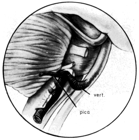 The varied causes that can produce hemifacial spasm have in common the ability to produce ephaptic transmission at some point along the nerve. By far the most common site of disruption is at the root exit zone of the facial nerve. In most cases, aberrant vascular loops of the basilar, posterior inferior cerebellar, anterior inferior cerebellar, vertebral, or internal auditory artery compress the facial nerve at its root (Fig. 11). Other known causes include cerebellopontine tumors, aneurysms, arteriovenous malformations, and aberrant venous structures; in some reported cases, the cause was undetermined.88,120,121 Only rarely is there an antecedent history of ipsilateral facial palsy. Tic convulsif is the term given to the combination of trigeminal neuralgia and hemifacial spasm, and a common structural cause is often found. MRI and MR angiography have greatly increased our ability to document the cause of hemifacial spasm prior to surgery. Treatment. Surgical decompression of the facial nerve, in which a nonabsorbable sponge is placed between the nerve and the offending artery, is the only permanent treatment and has an 85% success rate.88,120,121 Occasionally a second operation is needed. Some authors have suggested that this procedure can be beneficial even in the absence of an offending vessel, suggesting that the real benefit comes from manipulation of the nerve and subsequent fibrosis.122 Unfortunately the long-term complication rate is 16% and includes facial palsy and hearing loss.121 Nonsurgical management is most successful with botulinum toxin, and given its lack of permanent complications, one could argue that a therapeutic course with this agent should be tried in all patients before surgery is considered.90,123 Alternative drug trials, which are effective 25% of the time, include carbamazepine, phenytoin, baclofen, clonazepam, and anticholinergics.85,93 |