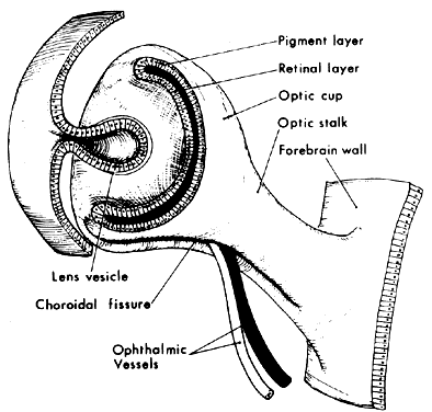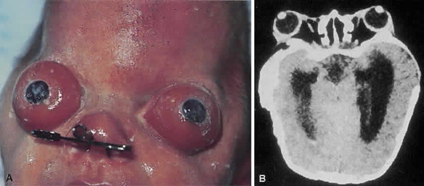In a study of 49 patients by Hertle and coworkers178 67% of patients had ocular findings. In addition, 16% had visual loss secondary to amblyopia caused by uncorrected refractive errors (27%), anisometropia (8%), strabismus (22%), and nystagmus and ptosis (12%). Limbal dermoids and orbital dermoids are frequently observed in this syndrome158 whereas microphthalmos and anopthalmos are rarely present. Varying degrees of canthal dystopia occur. The orbit is frequently decreased in size and volume. The most common adenexal abnormalities are dacryostenosis and blepharoptosis. Colobomas of the upper eyelid may be found as well as iris colobomas. Common findings include esotropia, exotropia, Duane's syndrome, and several cranial nerve palsies affecting the motility.185 Cataracts, glaucoma, and keratitis sicca also occurred frequently. Many theories have been advanced to explain the etiology of this syndrome. Several features overlap Goldenhar's and Treacher-Collins syndromes such as upper eyelid colobomas and even more importantly, the morphogenic abnormalities of the first and second branchial arches. However, certain skeletal and suspended manifestations help to differentiate hemifacial microsomia from the other first and second branchial arches. These include cerebral, malar, mandibular, temporal, and zygomatic hypoplasia; various cerebral anomalies; a wide variety of cranial nerve abnormalities with the facial nerve most commonly involved; and rare neural and cardiac anomalies.111,186,187 AMNIOTIC BAND SYNDROME Amniotic band syndrome, also known as constriction ring syndrome, is another cause of facial clefting. The clefts in this syndrome are variable and do not conform to any specific pattern. Incidence of this syndrome varies from 1:1,200 to 1:15,000 live births.188 Nearly all cases are sporadic, although a few instances of familial transmission have been reported.189 Distribution by gender and race is equal. Any understanding of the pathogenesis of this syndrome should begin with a review of the normal development of the amniotic sac, which contains amniotic fluid that bathes the developing embryo. The amniotic fluid provides the embryo with constant temperature in a nonrestricted environment as protection against trauma.190 As normal gestation progresses, the amnion thickens, as does the chorion or the semipermeable membrane, which lies deep to the amnion. The fetus begins swallowing amniotic fluid at approximately 3 to 6 months of embryogenesis.188 The etiology of amniotic bands is subject to wide debate. The most likely explanation is related directly to the formation of amniotic bands. Early in the middle trimester, the amnion may separate from the chorion and produce thin free-floating tissue strips. These amniotic bands may wrap around parts of the embryo in a bandlike manner, restricting growth or even causing full structural defects, such as amputation of arms or limbs. Rupture of the amnion not only produces amniotic bands but also reduces levels of amniotic fluid temporarily. As already mentioned, as gestation proceeds the amnion thickens. Thus, separation of the amnion from the chorion at later stages of gestation promotes thicker bands, which are capable of producing more deformities. These amniotic bands may also be swallowed, becoming anchored in the mouth. If this occurs, the bands may stretch across the face and cranium and can interrupt facial fusional processes or create disruption in tissues already formed creating cranial deformities of alarming magnitude (Fig. 29).191 If the band encircles the umbilical chord, it may lead to fetal hypoxia and death. Pericranial constrictions can cause anencephaly or encephaloceles. Clefting defects may be caused by pressure necrosis or interruption of normal fusion in facial processes. Any combination of clefts may arise in this syndrome. Larger bands may also cause intrauterine amputations. In some cases, the amniotic band may be found in the cleft or peripheral constriction defect thus providing some insight regarding the etiology of the deformity. An alternative theory suggests that extrinsic band formation does not occur and that such constrictions, compressions, and clefts might result from focal fetal dysplasia.192 This theory survives because it is difficult to explain certain internal malformations. Associated with this syndrome (dysplastic kidneys, imperforate anus, and ectopic gallbladder).193 As expected, ophthalmic complications may arise from the amniotic band syndrome.194–196 The most common anomaly is colobomas of the eyelids (upper, lower, or both). Associated colobomas tend to be large and irregular and often lead to corneal exposure and other related complications. Symblepharon from the lid to the cornea can be associated with these colobomas. Paramedian clefts (Tessier's numbers 3 and 4) frequently have nasolacrimal system abnormalities, including nasolacrimal duct obstruction, punctal or canalicular agenesis, or even complete absence of the nasolacrimal system. Hypertelorism occurs in approximately 45% of these cases and is often associated with frontal encephalocele in the median or perimedian cleft (Tessier's cleft numbers 0, 1, 2, 12, 13, and 14) Canthal dystopia and ptosis may also be observed. Extraocular muscle abnormalities may include esotropia, exotropia, oblique muscle overreaction, and paralytic strabismus. These strabismus patterns may be primary or secondary to the cranial nerve abnormalities. Less common abnormalities include iris and choroidal coloboma and entropion, ectropion, megalocornea, and varying degrees of myopia and hypertropia. MANAGEMENT OF CRANIOFACIAL DEFORMITIES As mentioned previously, patients with craniofacial deformities require management by a team of specialists, which will usually include consultants from genetics, plastic surgery, neurosurgery, oral surgery, orthodontics, ophthalmology, and otolaryngology, as well as psychiatry, nutrition, speech therapy, and social work. Te