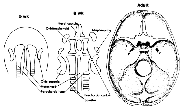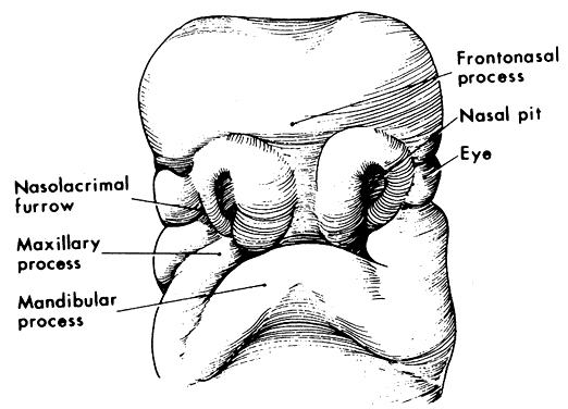 the paraxial skeleton and associated musculature. As the rostral neural groove closes, the first branchial arch begins to appear along the lateral portion of the neural tube. The first branchial arch, or mandibular arch, forms two paired mandibular processes, which will eventually fuse to become the mandible. At the superior lateral portion of each mandibular process, a small bud develops into the maxillary process, which eventually forms the maxilla, zygomatic bone, and squamous part of the temporal bone (Fig. 2). Thus, at the midfourth week, after neural tube invagination, the primitive cavity or stomodeum is flanked by five distinct facial processes: two paired mandibular processes, two paired maxillary processes, and a central frontonasal process. Most congenital malformations of the head and neck originate as the branchial arches transform into their adult derivatives. The branchial arches are initially composed of an external layer of ectoderm and an internal core of endoderm. It is the migration of neural crest cells into the branchial arches that causes them to enlarge. The ectodermal furrows dividing the facial processes are eventually obliterated by proliferating neural crest cells and mesenchyme. Fusional failure of the facial processes caused by the absence of neural crest cell migration is one of the proposed etiologies of “true” facial clefts and are in more detail in later sections. At the beginning of the fourth week, the developing eye appears as a placode on the lateral forebrain and by the end of the fourth week has become an easily identifiable optic vesicle. During the fifth week of gestation, the maxillary processes continue to enlarge and laterally border the recently perforated stomodeum (Fig. 3). The nasal placodes, which appear late in the fourth week, transform into olfactory grooves. Horseshoe-shaped medial and lateral nasal prominences develop and the nonfused inferior portion of the olfactory groove remains continuous with the stomodeum. Also during the fifth week, six swellings, called auricular hillocks, develop from the first and second branchial arches and represent the rudimentary external ear. As the optic vesicle continues to grow, the overlying surface ectoderm differentiates into the lens placode. The optic vesicle invaginates to form the double layered optic cup and the overlying surface ectoderm, with mesenchymal contributions from the neural crest cells, which will later form the eyelids (Fig. 4). The eyelids fuse at the ninth week and at the 25th to 26th weeks, the fused margins separate. In the sixth week, the medial nasal prominences fuse with each other and with the maxillary prominence (Fig. 5). Failure of the medial nasal prominence to merge with the maxillary prominence results in a cleft lip, with or without cleft palate; the cleft lip may be unilateral or bilateral. Continued growth of the maxillary processes promotes the formation of the nasolacrimal groove along the lateral border of the nasal processes. The nasolacrimal groove will incorporate neuroectodermal cells, which will eventually become the nasolacrimal drainage apparatus. The mandibular process continues its growth and fuses at the midline by the end of the fifth week. During the seventh week of gestation, the maxillary processes fuse at midline, separating the nares from the mouth (Fig. 6). The enlargement of the maxillary process and expansion of the lateral head, combined with the horizontal collapse and the vertical elongation of the frontonasal process, allows for anterior rotation of the developing eyes. This anterior rotation of the eyes is not be fully achieved until approximately 4 months of gestation and abnormalities in this process may result in hypertelorism (Fig. 7). By the seventh week, nearly all lower facial fissures and furrows have completely closed. By the eighth week of gestation, the embryonic face has distinct human characteristics despite the obvious differences in facial proportions. By the end of the embryonic period, external ears begin to assume their final shape despite being set low on the head. The eyes assume a more almond shape and continue their anterior rotation. The cranium loses most of its overhang while the chin and nose achieve a more pronounced profile. In addition to an appreciation of the development of facial features, a fundamental understanding of the development of the bony skull is critical to understanding of congenital craniofacial anomalies. The calvaria and cranial base represent the two major portions of the developing skull and have distinct embryonic etiologies. The calvaria arises from neural crest cell migration into cartilaginous condensations at the site of the future crista galli, lesser wings of the sphenoid, and petrous ridges. Primitive dura matter arises from these sites and is first observed at 5 to 6 weeks' gestation. The dural sheaths expand to accommodate the rapidly enlarging brain and the junctions at which these dural sheaths appose determine the sites of the cranial sutures (Fig. 8). Intramembranous ossification of mesenchyme forms the bones of the cranial vault. Portions of the dura prevent closure of the cranial sutures and allow for expansion of the intracranial contents during fetal and infant growth. Premature fusion of one or more of the cranial sutures, termed craniosynostosis, produces various abnormal head shapes, which are discussed in more detail in later sections. At 4 to 5 weeks' gestation, the neural crest cells responsible for formation of the cranial base first flank and later surround the notochord (Fig. 9). These include the alisphenoid, orbitosphenoid, and prechordal cartilage, which develop into the sphenoid, zygoma, temporal, and ethmoid bones. Premature fusion of these sutures, especially the sphenozygomatic and sphenoethmoidal sutures can lead to shallow orbits and poor growth of the midface. The prechordal cartilage becomes the nasal septum, which, with ethmoid development, pla