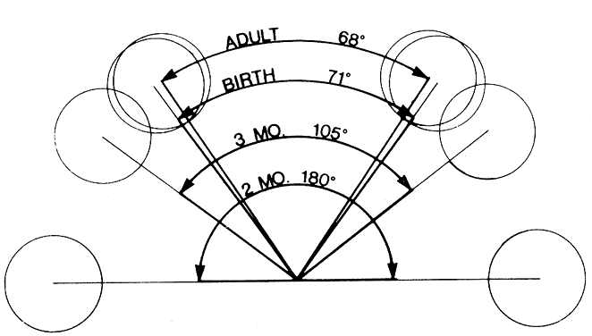 this same cleft.4 VISION Amblyopia is responsible for significant visual loss in patients with craniofacial disorders.197 In infancy, visual acuity is estimated by using preferential fixation testing (as with Teller acuity cards). At approximately 3 years of age, HOTV Allen cards and Snellen's visual acuity tests may be obtained. The many causes of amblyopia in these children include corneal opacification, ptosis, strabismus, refractive error, postoperative swelling, occlusive dressing, and tarsorrhaphy, among others. Prompt initiation of therapy for amblyopia is of utmost importance in this patient population. Thus, each initial examination should include a cycloplegic refraction with correction of the refractive error and penalization therapy of the better eye. GLOBE A complete ocular examination including pupillary assessment, slit-lamp examination, cycloplegic refraction, tonometry (if possible) and dilated funduscopic examination must be performed on every patient. Pupillary evaluation helps identify any afferent pathway abnormalities that may accompany the associated optic nerve atrophy seen in many of the craniosynostoses. Slit-lamp examination helps identify any opacifications of the cornea or lens. In addition, cobalt blue illumination of florescence on the corneal surface may be performed, at the slit lamp or remote distance to evaluate possible exposure keratopathy. Dilated funduscopic examination may identify any optic nerve, retinovascular, pigmentary, or choroidal disturbances. LIDS AND CANTHUS The eyelids and canthal regions are frequently involved in many craniofacial syndromes and are often the sites of involvement of the clefting syndromes. Furthermore, craniofacial surgical techniques, which involve mobilization and shifting of the orbits, commonly alter the position of the lids and canthi. The intercanthal distance (distance between the medial canthi) and the interpupillary distances are recorded. A good clinical guide to the degree of hypertelorism is the intercanthal distance to interpupillary distance ratio, which normally is approximately 50%. Amounts greater than this may indicate telecanthus with or without underlying hypertelorism. The clinician must attempt to estimate the interpupillary distance accurately when an esotropia or exotropia is present. This ratio also may be indirectly determined from photographs taken in the office when the child will not tolerate direct measurements. The normal distance of soft tissue between the medial canthi is generally less than 20 mm in infants, less than 24 mm in older children, and less than 30 mm in adults. The lateral canthus is normally positioned 1 to 2 mm superior to the medial canthus. Any upward or downward translocation of either canthi is termed canthal dystopia and should be recorded and quantified in millimeters of vertical elevation or depression. The eye should be carefully observed for ectropion, entropion, colobomas, trichiasis, and epicanthal folds. Ptosis requires documentation of vertical fissure height, position of the lid crease and fold, margin-reflex distance, and levator muscle function. These measurements, although only gross approximations in infants, ought still be recorded in millimeters as accurately as possible. Terms such as poor, fair, good, and excellent levator functions are somewhat ambiguous and should be avoided. Horizontal fissure lengths should also be recorded. NASOLACRIMAL SYSTEM A careful history of tearing problems and any associated infections should be obtained. Nasolacrimal outflow abnormalities are common in the craniofacial syndromes and may be congenital or acquired from several surgical repair maneuvers. Periosteal stripping, bony cuts through the nasolacrimal area, and failure to reattach the medial canthal tendon, if disinserted, can produce anatomic or functional failure of the lacrimal pump. Fracture through the lateral nasal wall or medial maxilla can sever the nasolacrimal duct or collapse the bony nasolacrimal canal. Transnasal wiring for telecanthus may also disrupt the medial canthal tendon, lacrimal sac, and canaliculus. It is difficult to perform nasolacrimal and tearing tests intended for adults (e.g., Jones' or Schirmer's tests) on children. The dye-disappearance test is a relatively easy way to evaluate the function of the nasolacrimal system and is well suited for infants and children. Ancillary studies such as dacryocystography and lacrimal scintigraphy may also be useful assess lacrimal outflow disruption but commonly are not required.46 Irrigation of the nasolacrimal system may be possible in older, more cooperative children. Failure of the nasolacrimal duct to canalize is probably no more common in newborns than in the general population.46 Certain anomalies that may contribute to epiphora in patients with craniofacial disorders include lateral displacement of the puncta, absence of the puncta, elongation of the canaliculi, absence of the nasolacrimal duct or sac, and bony abnormalities of the lacrimal sac fossa or nasolacrimal duct. EXOPHTHALMOS Preoperative and postoperative measurements of proptosis in the craniofacial patient is important. Accurate measurement of proptosis before surgery is essential to evaluate the effect of orbital advancement surgery. Hertel's exophthalmometry gives an accurate measurement; however, due to anatomic variation of the lateral orbital rims, it may yield misleading information in craniofacial patients. Luedde's exophthalmometer also measures the distance from the lateral orbital rim to the corneal apex but may be more valuable in children because it is less threatening. STRABISMUS AND BINOCULAR SENSORY STATUS Extraocular motility disturbances, common in many craniofacial syndromes, need to be managed appropriately to prevent amblyopia. This may entail spectacle correction, occlusion therapy, or surgical therapy. Evaluation of strabismus and the binocular sensory status of the child with craniofacial disorders is the sa