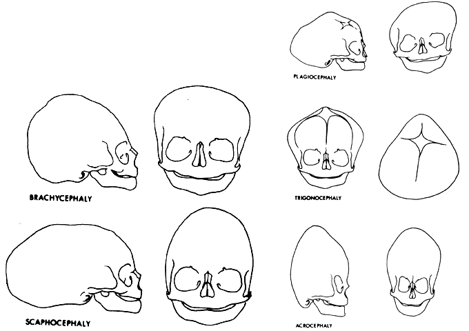 fusion, craniosynostosis is simply the result.2 There are several different types of craniosynostosis. First, craniosynostosis may be defined as either simple or compound. Simple craniosynostosis refers to the premature closure of a single suture whereas a compound craniosynostosis involves two or more sutures. The most prevalent type of craniosynostosis is scaphocephaly, in which the sagittal suture is synostosed, which results in a boat-shaped skull. Boys are affected much more commonly than girls, whereas sagittal synostosis occurs in girls more often than boys.2 Second, craniosynostosis may be designated as either primary or secondary. In primary synostosis, the most common type, the cranial sutures are fused prematurely because of a genetic predisposition. In secondary craniosynostosis, the premature sutural fusion is secondary to another known disorder. Examples include hematologic disorders (thalassemia and sickle cell disease), metabolic disorders (hyperthyroidism), metabolic disorders (mucopolysaccharoidosis), and malformations (microcephaly).2 Finally, craniosynostosis may be either isolated or syndromic. In the isolated form, the patient has no other abnormalities except those directly related to early sutural obliteration. In contrast, patients with the syndromic craniosynostosis have other primary morphogenic alterations. For example, in Apert's syndrome, syndactyly of the hands and feet occur frequently whereas congenital heart defects accompany the craniofacial malformation. Specific terms, such as scaphocephaly, have been used to describe the typical skull deformities associated with various synostoses (Fig. 10). Single coronal sagittal, metopic, or lambdoidal synostosis, respectively, leads to various degrees of brachycephaly, scaphocephaly, trigonocephaly, or plagiocephaly. Oxycephaly (tower head) is used to describe multiple synostosis involving at least the coronal and sagittal sutures, with compensatory upward growth of the cranium. Triphyllocephaly3 or kleeblattschädel describes a cloverleaf-shaped skull, which is clinically characterized by the synostosis of the lambdoid and coronal suture with herniation of the cerebrum through a patent sagittal suture. The general term plagiocephaly refers to closure of a single cranial suture, whether sagittal, coronal, or lambdoidal and may lead to wide variability in cranial morphology. Although descriptive, these terms may be confusing and it is probably simpler to classify these patients by the sutures involved.4 Traditional classification of craniosynostosis has been divided into three main groups: (1) craniofacial dystosis or Crouzon's syndrome, (2) acrocephalosyndactyly or “Apert's syndrome,” and (3) simple or single craniosynostosis. This classification system has largely been replaced by Cohen's5–7 more extensive classification.8 Cohen's classification of craniosynostosis categorizes these anomalies based on clinical similarities and genetic transmission5–7 (Table 1).