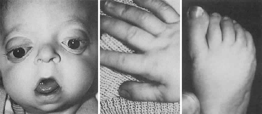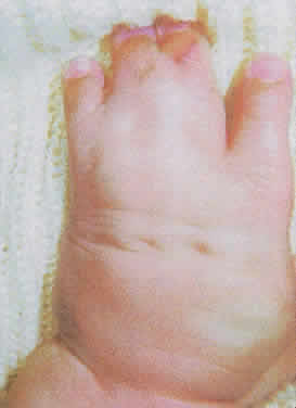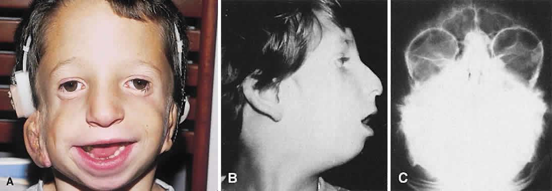 The hypertelorism, decreased orbital volume, and proptosis in Apert's syndrome are secondary to the midface retrusion and dysmorphic cranial base and are generally less severe than in Crouzon's syndrome.15 Strabismus occurs in 70% to 100% of patients and is usually of the exotropic variety. V-pattern exotropia predominates, although V-pattern esotropia may be observed. Absence of the superior rectus muscle, absence of the superior oblique muscle, and structural abnormalities of the extraocular muscles have been reported as well.48,64 Refractive errors such as high astigmatism and anisometropia are common in this syndrome. Other rare ophthalmic manifestations include keratoconus, ectopia lentis, congenital glaucoma, and optic atrophy.9,36,37 Apert's syndrome does not necessarily include mental retardation, although it is often pessimistically presented by clinicians to patients' families in this way.65 Intelligence is often subnormal and in one study of 15 patients with Apert's syndrome, the average IQ was 72.5.66 Development may be adversely affected by progression of increased intracranial pressure, although early craniotomy does not appear to ameliorate development.67 Other neurologic anomalies associated with Apert's syndrome include megalocephaly, as well as defects of the corpus callosum, brain, and gyral anomalies.66,68 Oral manifestations of Apert's syndrome include crowded teeth, impaction, and thickened gingiva.15,69 Clefting of the soft palate and bifid uvula occur in 30% of patients and malocclusion, usually class 3, related to the maxillary hypoplasia is seen. Many cardiac and visceral anomalies, such as coarctation of the aorta, ventricular septal and atrial septal defects, patent ductus arteriosus, and tracheoesophageal and pyloric stenosis have been reported, but such findings are relatively uncommon.70 In adolescent patients, 70% display peculiar acneiform eruptions on the trunk and forearms.71 Conductive hearing loss, often from chronic otitis media, is unfortunately extremely common with the incidence of deaths reported as high as 30%.72–74 Syndactyly of the hands and feet is a major feature of Apert's syndrome (Fig. 14). As mentioned previously, a middigital hand mass involving the second, third, and fourth digits is observed. The first and fifth digits may be adjoined, but when the thumb is separate it is usually broad. There is symmetric syndactyly of the toes with medial deviation of the great toe and progressive fusion of the midfoot and hindfoot in the supinated position.75 Radiologic studies show some degree of brachydactyly in all five digits, synphalangism of the interphalangeal joints, and eventual fusion of the carpal, tarsal, and interphalangeal joints over time.7,76 Other orthopedic anomalies in Apert's syndrome include ankylosis of the elbow, shoulder, and hip and cervical stenosis.77 Several additional cranial synostoses share common craniofacial features with Crouzon's syndrome but occur less frequently; these include Carpenter's, Pfeiffer's, and Sathre-Chotzen syndrome. CARPENTER'S SYNDROME Carpenter's syndrome (acrocephalopolysyndactyly type II) is a rare entity first described by Carpenter in 1901. It was finally recognized as a distinct entity in 1966 when Tentamy reported 1 case and studied 12 cases previously described in the literature under the name of Laurence-Moon-Biedl syndrome.78,79 Carpenter's syndrome is clinically characterized by craniosynostosis, preaxial polydactyly of the feet, variable brachydactyly, syndactyly, and obesity. Inheritance is autosomal recessive, but many cases represent new spontaneous mutations.72,79 Ocular findings are less distinct due to the rarity of the disorder. Hypertelorism with relative telecanthus and epicanthal folds has been described in most cases.80 Shallow orbits with proptosis and mild down-slanting of the palpable fissure may also be observed. Corneal opacity, microcornea, optic atrophy, and pseudopapilledema occur sporadically.78–81 The craniosynostosis of Carpenter's syndrome is characterized by multisutural involvement. Variable premature fusion of the coronal, lambdoidal, and sagittal sutures normally result in a grossly normal calvaria, which is usually shortened in all directions.15,79,82 Most affected patients are mentally retarded; however, those with normal intelligence have been reported.82,83 Short stature and obesity are usually present. Between 30% and 50% of patients have congenital heart defects including atrial and ventricular septal defects, patent ductus arteriosus, and tetralogy of Fallot.79,84 Patients with Carpenters' syndrome may also have low-set ears, a hypoplastic mandible, flattened nasal bridge, and high arched palate.7,80,81 Other anomalies include pes varus, genu valgum, laterally displaced patella, ilial flaring, and decreased hip mobility.15,74,79,82–85 Preaxial polysyndactyly of the feet, soft tissue syndactyly of the hands, and brachydactyly and duplication of the second toe may be seen in many of these patients. PFIEFFER'S SYNDROME The combination of craniosynostosis, broad thumbs and toes, and partial soft tissue syndactyly of the fingers and toes was described by Rudolf Pfieffer in 1964 in eight members of one family affected over three generations (Fig. 15).86 Pfeiffer's syndrome is an autosomal dominant disorder with complete penetrance and variable expression.87,88 The genetic mutations in Pfeiffer's syndrome have been identified as FGF2 on chromosome 10 and FGF1 on chromosome 8.89 Interestingly, identical mutations of FGF2 have been identified in Crouzon's and Pfieffer's syndrome despite their phenotypic differences in appearance. Cohen classified Pfeiffer's syndrome into three subtypes: Patients with type I have normal intelligence whereas types II and III have developmental retardation.87 The usefulness of this classification lies chiefly in genetic counseling, given that much clinical overlap exists among the different subtypes. The ophthalmic manifestat