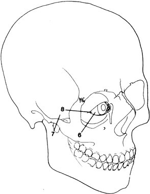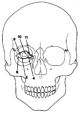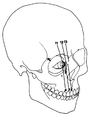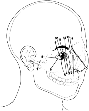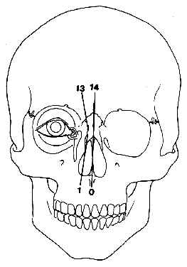 easy to classify. Historically, many attempts have been made to classify the clefting and craniofacial anomalies. Efforts put forth by Morin and coworkers,108 Lund,109 Burian,110 Sanvenero-Rosselli,111 Franceschetti and associates,112 and Karfik113 have enjoyed only brief popularity, as there were numerous shortcomings and overlaps, as well as a poor understanding of the underlying pathogenesis. Paul Tessier, in 1976, presented an orderly classification of the clefting syndromes that has been universally accepted due to its simplification of nomenclature106,113 (Fig. 17). Tessier's system assigns each craniofacial cleft a number from 0 to 14, beginning at 0 in the midline of the lower face and progressing clockwise around the right orbit ending at 14 in the upper facial midline. The left side of the face is organized in the same manner except the designation numbers run counterclockwise. Tessier's classification scheme is purely descriptive and provides no pathogenetic or etiologic information. Nevertheless, this is the most widely accepted system because it facilitates recording and communication among observers.106,113 The morphogenesis of facial clefting is not well understood and is a topic of much debate. To explain the clefting phenomenon, Dursy in 1869114 and His in 1892115 proposed the classic theory of fusion. They suggested that clefts develop as a result of the failure of fusion of the normal embryonic facial processes. In contrast to the classic theory, Johnston116 and Wetson117 subsequently implicated either (1) the failure of neural crest cell migration, which prevents the mesenchyme responsible for skeletal and connective tissue formation of the face or (2) the degeneration of these cells before their migration as the source of clefts. More recently, studies by Vermiej-Keers and coworkers suggests that neural crest cell migration may not be the source of all facial clefting.118,119 the group led by Vermiej-Keers identified four primary sites in embryonic facial development that may lead to facial clefts: (1) between the lateral and medial facial processes, (2) between the lateral nasal and maxillary processes, (3) between the maxillary and mandibular processes, and (4) between the palatine processes.119 These sites are identified as “true clefts” because they are associated with normal sutures of embryologic development. True clefts tend to be well-defined and occur within the seventh week of gestation. Within each of the facial embryonic bony plates there are multiple ossification centers, which vary in location and number, and which arise to complete bone development. Failure of these ossification centers to produce bone may cause bony defects and soft tissue abnormalities forming “pseudoclefts.” These are termed pseudoclefts because they lack association with true facial sutures. Most clefts would thus be considered pseudoclefts using this classification. Clefting phenomena have both genetic and environmental influences. Genetics appears to play only a limited role, the major exception being mandibulofacial dysostosis (Treacher-Collins syndrome), which is transmitted as an autosomal dominant trait and is linked to chromosome 5q31.1-q33.3.120,121 Both trisomy 13 and trisomy 18 are associated with facial clefting at incidences of 40.7% and 6.9%, respectively. Radiation exposure in Japanese survivors of the atomic bombs has been implicated in inducing clefts.122 Following the 1985 earthquake in Santiago, Chile, the rate of facial clefts locally rose from 1.6 to 2.01 per 1000 with a peak incidence 7 months after the quake.123 Infectious agents such as influenza A2 virus and Toxoplasma have been implicated as causative factors as well.124,125 Anticonvulsant drugs taken during pregnancy have been shown to increase the risk of craniofacial clefts six times over the risk of children born to mothers without seizure disorders.126 Maternal use of cocaine and benzodiazepines has also been reported to be associated with cleft lip, cleft palate, and atypical facial clefts.127 Dilantin, corticosteroids, and retinoids have also induced clefting in animal models.128 Certainly the variety of potential causal agents identified and the early period of facial embryogenesis, when the mother may be unaware of her pregnancy, creates a situation for unforeseen environmental induction unpreventable by parents. Amniotic band syndrome, which is reviewed in depth later in this chapter, is another cause of clefting phenomenon. Amniotic bands result from ruptures in the amniotic membrane, which then form into tissue chords, which may wrap around or be swallowed by the fetus. These bands lead to facial clefts presumably by causing pressure necrosis. Amniotic bands may actually be the most frequent cause of congenital clefts. REGIONAL CLASSIFICATION OF ORBITAL AND ADENEXAL CLEFTS Fries and Katowitz grouped the orbital clefts into four regional categories that stress the ophthalmic features associated with the clefts4 (Figs. 18 to 21). This system was not intended to replace Tessier's classification but rather to emphasize the clinically involved ophthalmic adnexa affected by these clefts. The four categories, from medial to lateral, are (1) median facial clefts (Tessier's cleft numbers 0,1, 13, 14), which primarily present with hypertelorism; (2) medial canthal and nasolacrimal system clefts (Tessier's cleft numbers 2, 3, 4, 11, 12, and 13), which primarily present with medial canthal dystopia and nasolacrimal abnormalities; (3) central eyelid clefts (Tessier's cleft numbers 4, 5, 6, 9, 10,and 11), which primarily present with colobomatous defects; and (4) lateral canthal clefts (Tessier's cleft numbers 4, 5, 6, 9, 10, and 11), which primarily present with lateral canthal dystopias.