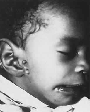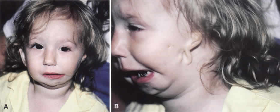 Most authors require the presence of periocular choristomas to establish the diagnosis of oculoauriculovertebral dysplasia. The incidence of epibulbar and orbital choristomas ranges from 32% to 92% depending on which study is referenced and how the author chose to define the inclusion criteria.161,162 Upper eyelid colobomas occur in between 12% and 20% of cases and are usually ipsilateral to the side exhibiting the choristema.161 In Mansour and associates' classic study,162 12% of patients had ptosis and 11% had nasolacrimal anomalies including nasolacrimal duct obstruction and lacrimal fistulas. Other ocular findings include horizontal palpebral fissure shortening, eyelid skin tags, and iris colobomas. Strabismus is noted in from 10% to 19% of patients and include Duane's syndrome, esotropia, exotropia, and palsy affecting cranial nerve VI.161–163 Rare occurrences include microphthalmia, anophthalmia, and cataracts.74,162,164–167 Extraocular anomalies in the syndrome are numerous and varied. Middle ear abnormalities, agenesis of the external auditory canal, and preauricular fistulae may be found. Other associated features include micrognathia, macrostomia, microcephaly, hydrocephaly, plagiocephaly, intracranial dermoids, various cranial asymmetries, and various palatal and facial clefts.159,162,165,168,169 Vertebral anomalies include cervical vertebral fusion primarily at the C2-C3 level, hemivertebrae, butterfly vertebrae, and pericervical cartilaginous tags, spina bifida, scoliosis, and hypoplastic or fused ribs.106,109,112,115,116 Cardiopulmonary anomalies include atrial septal, ventricular septal defects, pulmonary stenosis, Tetralogy of Fallot and tracheoesophageal fistula.139,160,170–173 Genitourinary problems, such as horseshoe kidney, have been reported.164 Clubfoot, forearm hypoplasia, and digital anomalies have also been documented.162,165,168,169 The etiology of Goldenhar's syndrome is unknown although an early cell-induction abnormality due to environmental, vascular, or topographic insult has been postulated.127,153 Most cases occur sporadically although both autosomal recessive and autosomal dominant inheritance patterns have been hypothesized in certain cases.74,169,174–176 HEMIFACIAL MICROSOMIA Hemifacial microsomia is a highly variable craniofacial disorder, which, like Goldenhar's and Treacher-Collins syndromes, is related to an abnormal morphogenesis of the branchial arches (Fig. 28).155 This is one of the more common craniofacial abnormalities with an estimated frequency of 1 in 4000 live births.155 The term itself was popularized by Gorlin and Pindborg.177 Other terms include craniofacial microsomia, otomandibular dystosis, and auricular branchiogenic dysplasia. There is a male predominance178 and a positive family history may be seen in 50% of cases.179,180