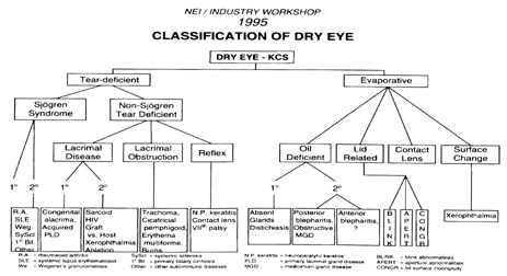 the basic biology of the tear film. The National Eye Institute/Industry Workshop in December 1993 and 1994 developed a global definition of dry eye: Dry eye is a disorder of the tear film caused by tear deficiency or excessive tear evaporation that causes damage to the interpalpebral ocular surface and is associated with symptoms of ocular discomfort.30 From this definition, two major classes of dry eye were established: tear deficient and evaporative (Fig. 4). At the time, it was recognized that the definition was limited in describing all possible causes and features of dry eye and may need to be modified in specific situations. For example, the definition does not include reference to dry eye after LASIK, because of allergy, or ocular surface-related problems103 and does not account for ocular surface damage outside the interpalpebral region or the possible absence of symptoms in the presence of dry eye signs in some patients.30 However, the common feature of all dry eye is tear film instability, a result of disease or dysfunction of one or more components of the lacrimal functional unit.104 Age, hormonal deficiencies, medications, surgery, and systemic autoimmune disease are all capable of causing dysfunction of the lacrimal functional unit that is associated with ocular surface inflammation, and ultimately, the signs and symptoms of dry eye.104 TEAR-DEFICIENT DRY EYE Tear-deficient dry eye is the largest category of dry eye. It occurs because of a disorder in lacrimal gland function, resulting in either reduced aqueous tear production and tear flow, or a failure to transfer lacrimal fluid into the conjunctival sac.30,105 Reasons for the lacrimal gland dysfunction include lacrimal gland disease, scarring of the lacrimal gland ducts, or abnormal stimulation of the lacrimal glands.27 Patients with aqueous tear deficiency may develop keratoconjunctivitis sicca (KCS), an ocular surface disease characterized by squamous metaplasia, corneal epitheliopathy, and filamentary keratitis (abnormal adherence of epithelial and mucous filaments).105 The subjective symptoms of dry eye include: heaviness of the lids, foreign body sensation, burning, stinging, itching, photophobia, dryness, soreness, and ocular fatigue.30,105 Tear-deficient dry eye is subdivided into two categories: Sjögren syndrome tear deficiency and non-Sjögren tear deficiency depending upon whether there are associated systemic signs and symptoms. Sjögren Syndrome Sjögren syndrome is an autoimmune exocrinopathy that is characterized by chronic inflammatory lymphocytic infiltration and immune-mediated destruction of the lacrimal and salivary glands.27,30 The mechanism for lymphocytic infiltration is unclear; however, epithelial cells of the lacrimal gland are believed to initiate and perpetuate the autoimmune reactivity by either producing immunologically active mediators or acting as antigen presenting cells.106–108 It has been hypothesized that the impaired secretory function of the lacrimal gland because of lymphocytic infiltration may be a result of a functional blockage in the neural pathway caused by inflammation. Inflammation could block the release of neurotransmitters from the nerve ends or impact the cellular response to neuromediators.69 A hormonal influence has been indicated in Sjögren syndrome because women are more afflicted with autoimmune disorders than men.77 A recent study showed that women with premature ovarian failure, a possible autoimmune disorder, were more likely to exhibit signs of ocular surface damage and dry eye symptoms than age-matched controls, although no differences were observed in tear production.109 Women suffering from premature ovarian failure are androgen deficient.109 It has also been shown that women with primary and secondary Sjögren syndrome are androgen deficient.110 Topical or systemic administration of androgens in patients with Sjögren syndrome alleviates dry eye signs and symptoms and stimulates tear flow suggesting that correction of the androgen defect in Sjögren syndrome may have a therapeutic effect on the lacrimal gland.77 This effect may extend to other autoimmune diseases as well.77 Sjögren syndrome may be primary or secondary. Primary Sjögren syndrome is aqueous dry eye in combination with dry mouth, the presence of autoantibodies, and a positive focus score on minor salivary gland biopsy.111,112 It has been estimated that primary Sjögren syndrome is a disease with a prevalence not exceeding 0.6% of the general population.113 Sjögren syndrome is secondary when it occurs in association with other autoimmune connective tissue disorders, rheumatoid arthritis being the most common.30 Non-Sjögren Syndromes In the absence of an autoimmune disease, ocular symptoms of dry eye with evidence of lacrimal dysfunction may be diagnosed as non-Sjögren dry eye. Non-Sjögren tear deficiencies include primary and secondary lacrimal deficiencies and congenital alacrima. The most common form of non-Sjögren dry eye is primary lacrimal deficiency (PLD), although the etiology of this disorder is unknown.105 Obata et al114 reported that the lacrimal gland dysfunction may be a result of age-related changes in the lacrimal gland including lobular and diffuse fibrosis and atrophy, as well as periductal fibrosis. Sullivan77 proposed that PLD may occur as a result of a decline in serum androgen levels experienced with menopause, pregnancy, lactation, or the use of estrogen-containing oral contraceptives in women. However, this causation is gender-specific because men treated with antiandrogen therapy do not experience an effect on aqueous tear production.77 Also, an immune mechanism cannot be excluded as lacrimal gland destruction has been reported by a round-cell infiltration associated with acinar loss and ductal pathology.115,116Congenital alacrima is an uncommon condition in children resulting from the absence or hypoplasia of the lacrimal gland, or abnormalities of the innervation 