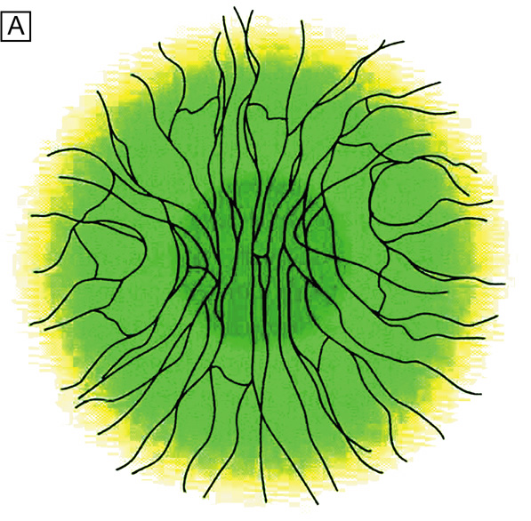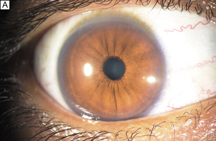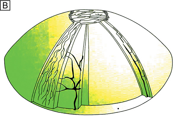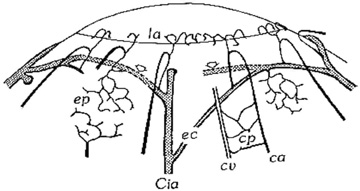Similarly, proteoglycans that make up the scleral stroma proper (36% dermatan sulfate, 35% chondroitin sulfate, 23% hyalruonic acid, and 6% heparin sulfate) differ significantly from the corneal stroma.252–253 However, like the corneal stroma, the scleral stroma proper does contain a syncytium of fibrocytes, albeit at a much lower level of cellularity or cellular density. Although the scleral stroma proper is traversed by ciliary blood vessels and nerves, it has no direct blood supply and does not contain a capillary plexus.252 It derives its nutrition by diffusion from the episcleral and choroidal vascular networks. The episclera is different from the scleral stroma proper in that its collagen bundles are more loosely arranged. It contains melanocytes and a few residential histocytes, unmyelinated and myelinated free nerve endings, and, most obviously, a very rich direct blood supply.255 The blood supply of the episclera is particularly prominent along the 4 mm of episclera anterior to the rectus muscle insertion sites (Fig. 35). This area is called the episcleral arterial circle, which is fed by the seven anterior ciliary arteries of the eye, whereas the more posterior regions of epislcera are significantly less vascular.252 This episcleral arterial circle has both superficial and deep branches that directly nourish the episclera through superficial and deep episcleral capillary plexi, or branches into conjunctival or limbal arteries that have their own capillary plexi. The vessels of the capillary plexi of the episclera, limbus, and conjunctiva are notable for having a continuous nonfenestrated endothelium, being connected to each other by a thin interendothelial cleft that has no tight junctions. Therefore, it is not surprising that these vessels are permeable to small molecules, but resist bulk fluid flow.258 Interestingly, because the precapillary arterioles of the anterior segment (superficial episcleral, deep episcleral, and limbal) do not have a smooth muscle wall, they tend to be thrown into tortuous folds resulting in turbulent blood flow.