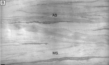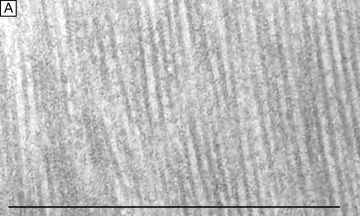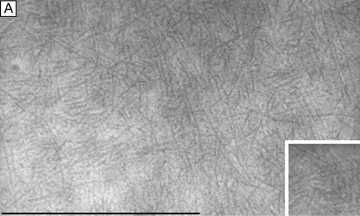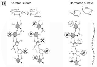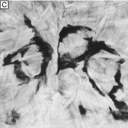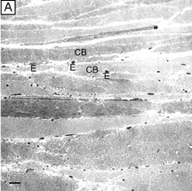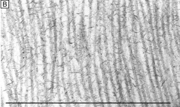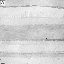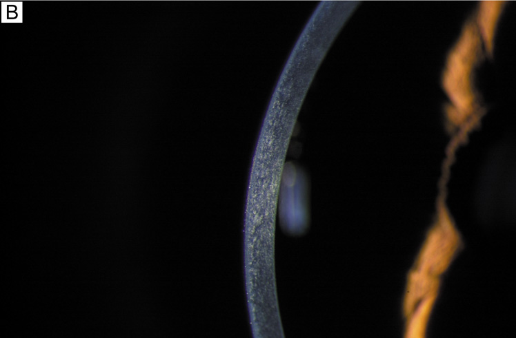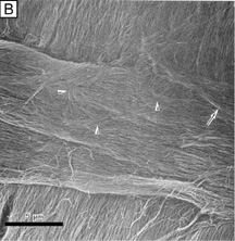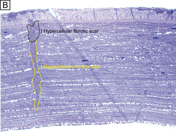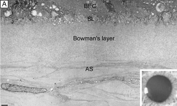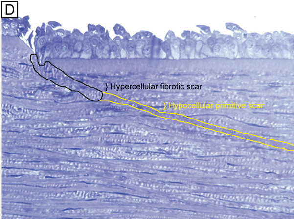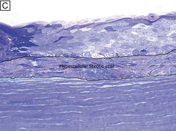 Electrophysiologic studies evaluating corneal keratocytes have examined the migration of keratocytes in an electric field.187 These studies found a positive galvanic response in keratocytes. Studies in other wounded tissues have found similar electrical fields generated in the area of the wound. Such electrical fields may act to attract keratocytes to the wound site. It is possible that ion channels have a role in the activation of and/or responses of keratocytes in the wounded corneal stroma. Interestingly, keratocytes isolated from wounded corneas (myofibroblasts) lose their major ionic conductances (Na+ and K+) and gain a Cl− channel that is not found in quiescent keratocytes. This Cl− channel can be activated via a receptor-mediated response by lysophosphatidic acid (LPA) and other members of the lipid growth factor (PLGF) family, including sphingosine-1-phosphate (S1P).188–192 Rabbit studies have also shown that many of these PLGFs become elevated in the aqueous humor and in tear following corneal injury.193 Epithelial-stromal interactions appear to be important to the process of stromal wound healing as it causes an increase in the number of proliferating and migrating keratocytes within the wound, some of which differentiate beyond the activated keratocyte stage into myofibroblastic cell types (Figure 30C).194 Many studies have focused on initiation of keratocyte activation and the substances secreted by these activated cells. Several substances associated with the corneal wound healing process have been shown to activate keratocytes. These activating factors include epithelial growth factor (previously called mesodermal growth factor),195–196 fibroblast growth factor (FGF),197 interleukin-1, transforming growth factor-β,198 insulin,199 retinoic acid,200–201 and LPA.190 Transforming growth factor-β is currently the major epithelial growth factor of this group that is also known to stimulate myofibroblast transformation and enhance the normal repair process.184,194,198 Once activated, keratocytes exhibit a wide range of cellular responses, including increased tritiated thymidine uptake (indicating increased cell proliferation),199,201 initiation of protease and collagenase activity,202–203 phagocytosis,204–205 interferon, prostaglandin and complement factor I production,206–208 as well as fibronectin, collagen, and proteoglycan secretion.209–215 Epithelial-stromal interactions appear augment the wound healing process by causing the production of a thicker and stronger extracellular scar matrix than that found in deeper stromal wound regions that receive no epithelial cell factors.216 When reviewing the literature, it is important to realize that human studies217–220 concur with animal studies on most issues with the following notable differences: adult human corneas heal less aggressively, more slowly, and not as completely as animal corneas. However, both animal and human studies show that corneal stromal wounds heal in two distinct phases: (a) an active phase that results in the production of a stromal scar (over the first 6 months after injury in humans), and (b) a remodeling phase that improves corneal transparency and increases wound strength (occurs up to 3.5 years after injury in humans). Overall, the long-term result in human corneas is the production of a hypercellular fibrotic stromal scar type in wound regions where epithelial-stromal interactions occur and a hypocellular primitive stromal scar type in wound regions where keratocyte injury pathways work alone. These two histologic wound types have functional significance as the hypercellular fibrotic stromal scar is strong, but can look clinically hazy because of myofibroblastic cells populating this scar type.221 In contrast, the hypocellular primitive stromal scar is transparent, but is very weak in tensile strength and serves as a potential space for fluid, inflammatory cells, and microbes. An additional variable to consider in this simplified scheme is the fact that more precisely realigned wounds (i.e., sutured wounds or unsutured wounds with minimal gaping and no epithelial cell plugging) heal better than poorly-aligned wounds (i.e., wounds with wide wound gaping, epithelial plugging, or incarceration of adjacent corneal tissue). The location and the variable amounts of scar types along with the variable degrees of wound realignment in the human cornea is best exemplified when one reviews published human histopathologic studies that describe findings in corneas that have had common ophthalmic procedures such as cataract extraction (CE), penetrating keratoplasty (PKP), radial keratotomy (RK), AK, PRK, or LASIK. Sutured and unsutured clear corneal cataract wounds are corneal stromal incisions constructed at oblique angles to corneal surface so that they self-seal. They usually heal with well-aligned external wound margins and wound edges, which results in a small, 50 to 75 μm in depth, subepithelial zone of hypercellular fibrotic stromal scarring and a remaining deeper zone of hypocellular primitive scarring (Fig. 31A). Occasional small epithelial plugs are found in the external wound of unsutured clear corneal cataract wounds and commonly Descemet's membrane is found partially detached or poorly realigned along the internal wound margin so that some stromal ingrowth occurs. In marked contrast, limbal and scleral tunnel cataract incisions heal because fibrovascular granulation tissue from the episclera completely grows into the wound by 15 days after surgery and finishes remodeling by 2.5 years after surgery.222–224 PKP wounds heal similar to sutured clear corneal cataract wounds with the notable exceptions of having significant wound compression because of the 0.25- to 0.5-mm oversized nature of the donor button and wound edge mismatch caused by the irregular, asymmetric nature found between donor and host wound edges. Additionally, a high percentage of PKP cases have overriding external or 