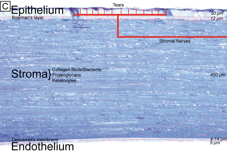in its response to stretching forces. Due to the avascular nature of the cornea, much of its oxygen requirement for metabolic activities comes from atmospheric oxygen dissolved in the tear film. When the eyelids are closed, oxygen can also predominantly enter the tear film from the superficial conjunctival capillaries. Most nutrients such as carbohydrates, vitamins, amino acids, and other substrates are primarily delivered to the cornea through the leaky corneal endothelial barrier with a minor contribution from the vascular arcades of the limbus. Certain growth factors, immune constituents, and other substrates like retinol are also secreted by the lacrimal gland and delivered to the cornea by the tears. Carbon dioxide and other metabolic end products are removed across the corneal endothelium to the aqueous humor, by the tear film, or through the limbal capillaries. EMBRYOLOGY AND DEVELOPMENT Following lens vesicle formation, which occurs between 4 to 5 weeks of gestation (27 to 36 days), surface ectodermal cells cover the defect left by lens vesicle invagination and become the primitive corneal epithelium composed initially of two cell layers. Similar to the avian cornea, the primitive epithelium of the primate cornea appears to be responsible for forming a prominent primary acellular corneal stroma, also known as the Bowman's layer, which becomes detectable around 20 weeks of gestation. It should be noted, however, that the primate cornea's ectodermal phase (primary acellular stroma) is de-emphasized compared to the mesodermal phase (secondary cellular stroma) and is less well organized in ultrastructure compared to that of the avian cornea. Sometime between when the eyelids fuse together (8 weeks gestation) and by the time the eyelids open (26 weeks gestation), the epithelium stratifies to four to five cell layers thick. The basal epithelial cells, which secrete an underlying basement membrane called the basal lamina, are cuboidal to columnar. Above this layer are interdigitating wing cells and, most superficially, a layer of flattened squamous epithelial cells. Early in gestation, adhesion complexes (hemidesmosomes, anchoring fibrils, and anchoring plaques) on the basal surface of the epithelium are absent. Rudimentary adhesion complexes only become detectable by 19 weeks of gestation. With further development in utero, the number of hemidesmosomes increases, anchoring fibril penetration into the Bowman's layer increases, and Bowman's layer thickens. A first wave of neural crest-derived mesodermal cells begins to extend beneath the corneal epithelial cells from the limbus around 5 weeks of gestation (33 days); these cells form the primitive endothelium. The primitive endothelium is initially composed of two cell layers, which by 8 weeks of gestation become a monolayer that starts to produce Descemet's membrane. The epithelium and endothelium remain closely opposed until 7 weeks of gestation (49 days) when a second wave of mesoderm begins to grow centrally from the limbus between the epithelium and endothelium. This tissue forms the secondary cellular corneal stroma, and extracellular collagen is produced within a few days. During the third month of gestation, Descemet's membrane is secreted by the endothelial cells and can be recognized in histologic sections. By the seventh month of gestation, the cornea resembles that of the adult in most structural characteristics other than size. At birth in the full-term infant, the horizontal diameter of the cornea is only around 9.8 mm (surface area 102 mm2), or approximately 75% to 80% of the size of the adult human cornea. (Note that the posterior segment is less than 50% of adult size at birth.) Additionally, at birth, the cross-sectional thickness of the epithelium averages 50 μm, the Bowman's layer averages 12 μm, the central cellular corneal stroma averages 450 μm, Descemet's membrane averages 4 μm, and the endothelium averages 5-μm thick. During infancy, the cornea continues to grow over the first years of life, reaching adult size at 2 years old with a horizontal diameter of 11.7 mm (surface area 138 mm2) and changes very little in size, shape, and optical properties thereafter. The only significant structure in the cornea that thickens with age is the Descemet's membrane, which gradually increases an additional 6 to 11 μm from birth to senescence. OPTICAL PROPERTIES The average index of refraction of the cornea and tear film taken as a whole is about 1.376. The refractive power for the anterior surface of the cornea may be computed by the following formula: where D equals diopters of optical power, n is the index of refraction of air (1.000), n' is the index of refraction of the whole cornea, and r is the radius of curvature of the anterior corneal surface in meters. The posterior surface of the cornea is bathed with aqueous humor. By applying the same formula, we arrive at the following value for the optical power of the posterior corneal surface, where n' is the refractive index of aqueous humor (1.336): Therefore, the total optical power of the cornea is 48.2 − 6.2, or approximately 42.0 D, which is about two-thirds of the 60.0 D total optical power of the human eye. Because the cornea is thinner in the center than in the periphery, it should act as a minus lens but functions as a plus lens because the aqueous humor neutralizes most of the minus optical power on the posterior corneal surface. If we compute the power of the posterior corneal surface in air, we would find the following: By subtracting the plus power of the anterior surface, the resulting net power for the cornea in air becomes −96.0 D + 42.0 D = −54.0 D, a powerful minus lens. From the previous calculations, it is obvious that the most important refracting surface is that of the anterior cornea. However, if a large air bubble is placed in the anterior chamber so that it contacts the corneal endothelium or if the anterior surface of the cornea is submerg