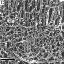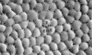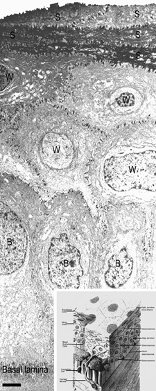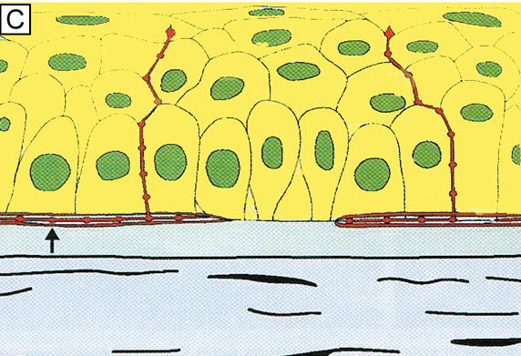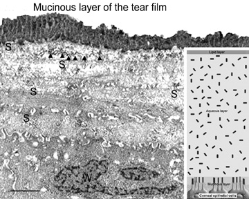 The cornea is thinner in the center, measuring on average 520 μm and increases in thickness to approximately 700 μm as it reaches the limbus.1–4 The central 4 mm of the cornea overlying the pupil contains the optical center of central vision. It typically has a regular surface and structure, and commonly is near exact in spherical configuration. The more peripheral portions of the cornea are often slightly irregular and torical in configuration rather than spherical, giving the whole cornea a hyperbolic shape. If the central cornea is not exactly spherical, the condition of astigmatism (stigma meaning a point) usually results. With astigmatism, an optical image without a single point focus forms within the eye resulting in two line foci. The average radius of curvature for the posterior corneal surface is shorter than the anterior corneal surface at 6.5 mm. In adult humans, the conjunctival surface area has been measured at 17.65 cm2, and the corneal surface area measures 1.38 cm2, giving a c/c ratio of 12.8.5 Because topical lipophilic drug delivery to the anterior chamber occurs primarily through the cornea with the conjunctiva supplying a minor secondary delivery route, surface area ratios of the cornea and conjunctiva are important because a large conjunctiva-to-corneas (c/c) surface area ratio results in less drug delivery to the anterior chamber. Therefore, surface area ratios need to be considered when comparing drug delivery studies. MICROSCOPIC ANATOMY, ULTRASTRUCTURE, AND PHYSIOLOGY OF THE EPITHELIUM The anterior surface of the human cornea is covered by a transparent, nonkeratinized, stratified (five- to seven-cell layer) squamous epithelium uniformly around 50 μm in thickness that is continuous with the epithelium of the limbus and conjunctiva (Figs. 1, 2, and 3). The basal corneal epithelial cells actively secrete extracellular material (type IV collagen, laminin, heparin, and small amounts of fibronectin and fibrin) that forms an underlying 75-nm thick basement membrane called the basal lamina. On electron microscopy, the morphology of basal lamina appears to be composed of two distinct layers: a 25-nm thick lamina lucida and a 50 nm thick lamina densa (Fig. 3). The cytoplasm of a corneal epithelial cell primarily contains cytoskeletal intermediate filaments and has sparse cytoplasmic organelles (i.e., mitochondria, endoplasmic reticulum, and golgi apparatus). The predominant cytoplasmic filament is keratin, whereas actin and microtubules are two other major types found in corneal epithelial cells. The epithelial cells are held together to one another by numerous anchoring junctions called desmosomes, whereas the basal surface of the epithelium adheres to the basal lamina and underlying Bowman's layer through aa adhesion complex composed of hemidesmosomes, anchoring fibrils (type VII collagen), and anchoring plaques (Fig. 4). The function of the corneal epithelium is twofold: (a) to form a barrier from the environment to the corneal stroma of the cornea, and (b) to form a smooth refractive surface on the cornea through interaction with the tear film. The epithelial cells differentiate from the basal layer to form two to three cell layers of wing cells and finally to form two to three cell layers of squamous cells (Fig. 3). The squamous cells form a barrier junction because they are surrounded by a continuous encircling band of zonula occludens tight junctions, which serve as a semipermeable, high-resistance (12–16 kΩ cm2) membrane6,7 by closing off the intercellular space. This barrier prevents the movement of fluid from the tears into the stroma and also protects the cornea and intraocular structures from infectious pathogens. The apical surface of the corneal epithelium is specialized to maintain the tear film as microplicae and microvilli on the surface of the most superficial epithelial cells is covered with a glycocalyx and membrane-spanning mucins (MUC 1 and possibly MUC 4); altogether these structures and substances form the 1.0 μm thick mucinous layer of the tear film (Fig. 5).8–10 The tear film typically measures 7 to 10 μm in thickness and contains three layers (mucinous, aqueous, and lipid layers). Recently, the aqueous layer of the tear film has been found to contain gel-forming mucins (MUC 5AC and 2) along with lysosyme, immunoglobulin A, transferring, defensin, and trefoil factor (Fig. 5, inset).10 Overall, the tear film functions in maintaining a healthy ocular surface by preventing ocular infections and forming a smooth optical surface required for clear vision. Deficiencies in the components that compose any of these layers potentially can cause ocular surface disease. The corneal epithelium is in a state of constant healing as squamous cell are continuously shed into the tear film (Fig. 6). It is estimated that all the cell layers of the corneal epithelium completely turn over every 7 to 10 days. The epithelial surface is maintained by basal epithelial cells, which can undergo mitosis resulting in two daughter cells that are found anterior to the basal cell layer, thus forming two wing cells and eventually squamous cells.11–13 This delicate balance of shedding followed by proliferation is critical in maintaining a smooth and uniform epithelial surface around 50 μm in thickness. The shedding step is primarily induced by the friction that occurs from involuntary eyelid blinking, which happens on average every 7 seconds. The signal for basal epithelial cell proliferation probably comes via the gap junctions, especially in the more basal layers, with connexin 43 being one of the common gap junction proteins present.7,14 Interestingly, gap junction communication between corneal epithelial cells is promoted by low concentrations of bicarbonate, which is abundant in the aqueous humor and tear film.15 The barrier function of the epithelium itself is due to zonula occludens tight junctions between the most superficial epithelial junction, which are m