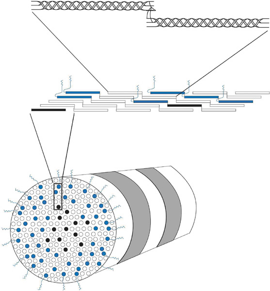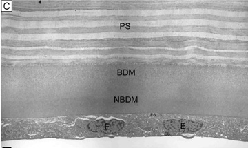 In addition to the transporting proteins, several types of ion channels have been characterized in the endothelial cells. These include two K+ channels, a nonselective cation channel, a large conductance anion channel the CFTR channel, a Ca++-activated Cl− channel (also permeable to HCO3−, and a tetrodotoxin-blockable Na+ channel).107–109 It is believed that these channels act as pathways to help maintain ionic balance within the cells. It has been shown that at least one of the K+ channels is important in maintaining the resting voltage of the endothelium, whereas the Cl− channels may also assist in HCO3− transport.107–109 As with the other cell types of the cornea, endothelial cells have intercellular connections via gap junctions. These junctions have been visualized by transmission electron microscopy110 and freeze fracture microscopy,7 and their permeability and gating characteristics have been measured by dye spread and patch clamp techniques.111–113 Connexin-43 is one of the major gap junction proteins present in human gap junction complexes.114 As in the corneal epithelium, endothelial gap junctions have increased connectivity in the presence of bicarbonate.15 Although this review is primarily concerned with healthy, normal corneal endothelium, there are many exogenous stresses that could potentially damage the corneal endothelium. Perhaps the most common interventions that affect the cornea/endothelium include contact lens wear, excimer laser refractive surgery (LASIK, PRK), and intraocular surgery (cataract surgery, refractive IOL surgery, corneal transplantation). Contact lens wear does not appear to cause loss of endothelial cell density, but can acutely induce reversible corneal edema and/or can cause chronic signs of endothelial cell stress (increased polymegathism and decreased pleomorphism).58,114 Contact lens-induced endothelial cell changes are thought to occur because of hypoxia, as they are not observed with more oxygen permeable lenses.114 Excimer-based refractive surgery has only been found to induce acute, transient endothelial cell stress (increased polymegathism and decreased pleomorphism) and loss of barrier function if performed on a cornea with a residual corneal thickness ≤200 μm, presumably because of the shockwave produced by the laser ablation.85 Otherwise, no long-term effects have been linked to laser refractive surgery.85 By comparison, all intraocular surgeries have been found to cause varying degrees of both acute and, more importantly, long-term chronic damage to endothelium. Modern small incision cataract surgery (Kelman phacoemulsification [KPE] + foldable IOLs) has been shown to cause an exponential reduction in the central endothelial cell density; at 1 year after surgery, endothelial cell density loss averages 10.5%.115 Additionally, no significant change in polymegathism or pleomorphism has been found.115 This fast component period of cell loss is similar to extracapsular cataract extraction (ECCE), another common way of performing cataract surgery, which results in a 9.1% reduction in endothelial cell density at 1 year after surgery.115 Capsule rupture with vitreous loss, hard cataracts, and age at the time of surgery are factors that have been shown to significantly increase endothelial cell loss rates in KPE cases compared to ECCE cases.115 Longer-term slow component cell loss data is currently unknown on KPE, whereas ECCE data shows that a 2.5% linear rate of cell loss occurs from 1 to 10 years after surgery.114 Early data from refractive IOL procedures seem to show even less damage to the cornea/endothelium than cataract surgery. Finally, corneal transplants have been found to have the greatest long-term decreases in central endothelial cell densities of all the intraocular anterior segment procedures, perhaps because of the peripheral loss of adult stem-like cells that are located on or near Schwabe's line.116 Long-term longitudinal studies out to 20 years postoperatively show that endothelial cell loss after corneal transplantation occurs in two phases: a fast and a slow component. During the fast component, the central endothelial cell density decreases exponentially with 36.7% cell loss at 1 year and 8.4% cell loss at 5 years after surgery.117 Thereafter, a slow component occurs where central endothelial cell density decreases at a linear steady rate of 4.2% per year.117 Concurrently, polymegathism gradually increased and pleomorphism gradually decreased throughout the longitudinal follow-up period. A secondary function of endothelium is its ability to secrete an extracellular matrix. The secreted and deposited extracellular matrix along the basal surface of the endothelium is known as Descemet's membrane (Fig. 12) and is essentially a lifelong accumulated basement membrane of the endothelial cells, similar to that of a tree trunk with accumulating tree rings. Although some collagen fibrils from the posterior stroma are embedded in the Descemet's membrane, it has no junctional or adhesional complexes. Descemet's membrane is highly elastic and strong as it is primarily composed of collagen (type IV and VIII) and glycoproteins (fibronectin, laminin, thrombospondin). At birth, it is 4-μm thick. On electron microscopy, this fetal Descemet's membrane is composed of many wide-spaced, 110-nm banded collagens.118 After birth, collagen is gradually added to this initial fetal layer throughout life, being notably different from the fetal layer as it is nonbanded and contains small diameter collagen fibrils that arrange into a lattice matrix.118 Typically, the Descemet's membrane at senescence in normal adults free of eye disease measures 10- to 15-μm thick (4-μm thick banded layer and a 6- to 11-μm thick non-banded layer). With disease (e.g., Fuchs' endothelial dystrophy, bullous keratopathy), the Descemet's membrane may become focally or diffusely thicker than normal from abnormal collagen deposition. This newly deposited a